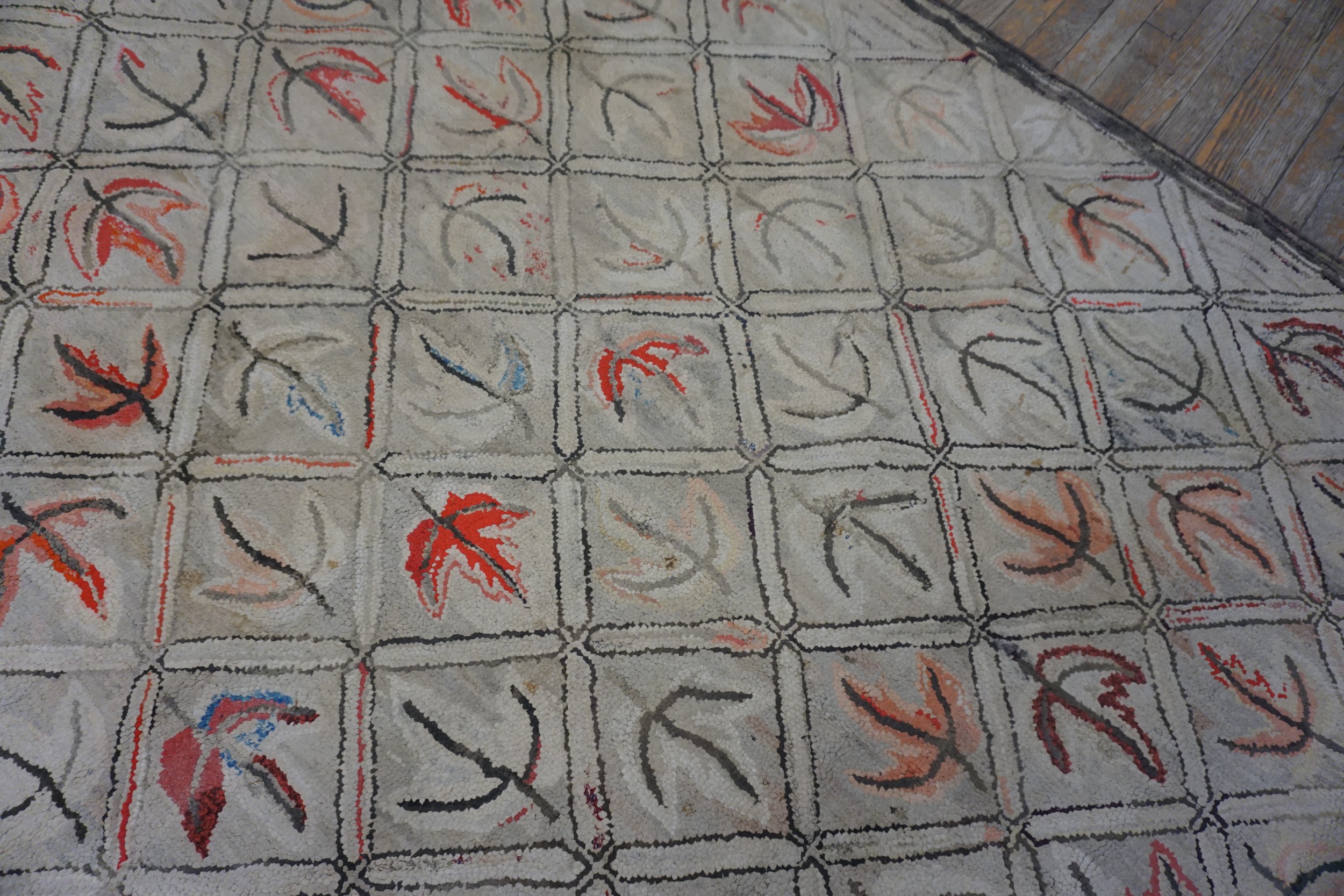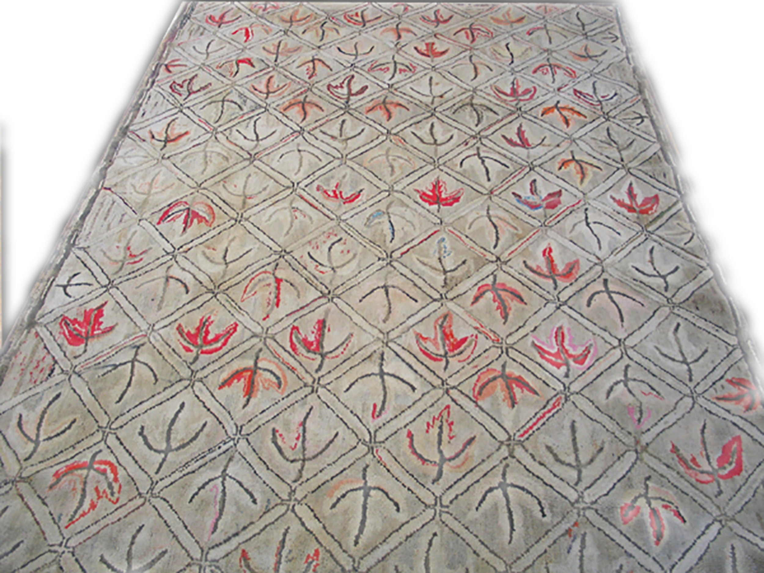 The composition is a charming and rhythmic “all-over” botanical design, featuring a repeating motif of autumnal leaves and scrolling vines. In the lexicon of early 20th century American folk art, the leaf was a powerful symbol of the American landscape and the domestic connection to nature. The artisan has utilized a “painterly” approach to the motifs, employing subtle shading and color shifts within the individual leaves to create a sense of movement and three-dimensional depth. The light ivory field acts as a luminous canvas, allowing the organic shapes of the foliage to “pop” with graphic modernism, despite the rug’s antique origins.