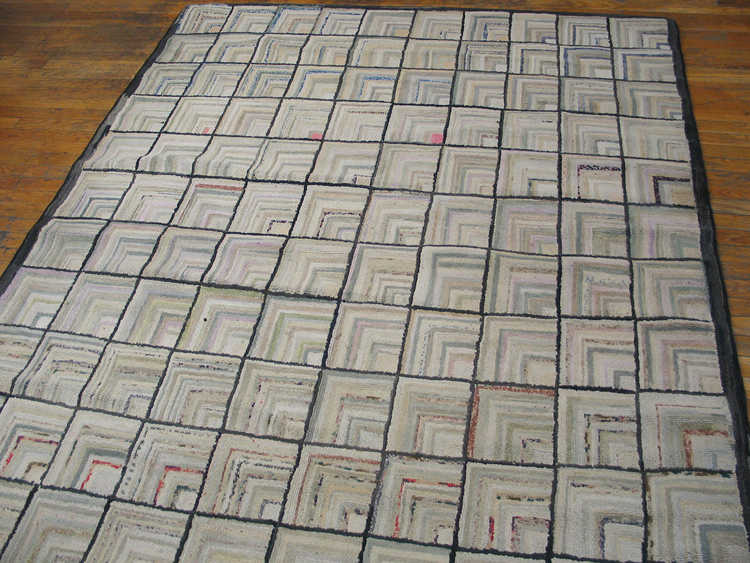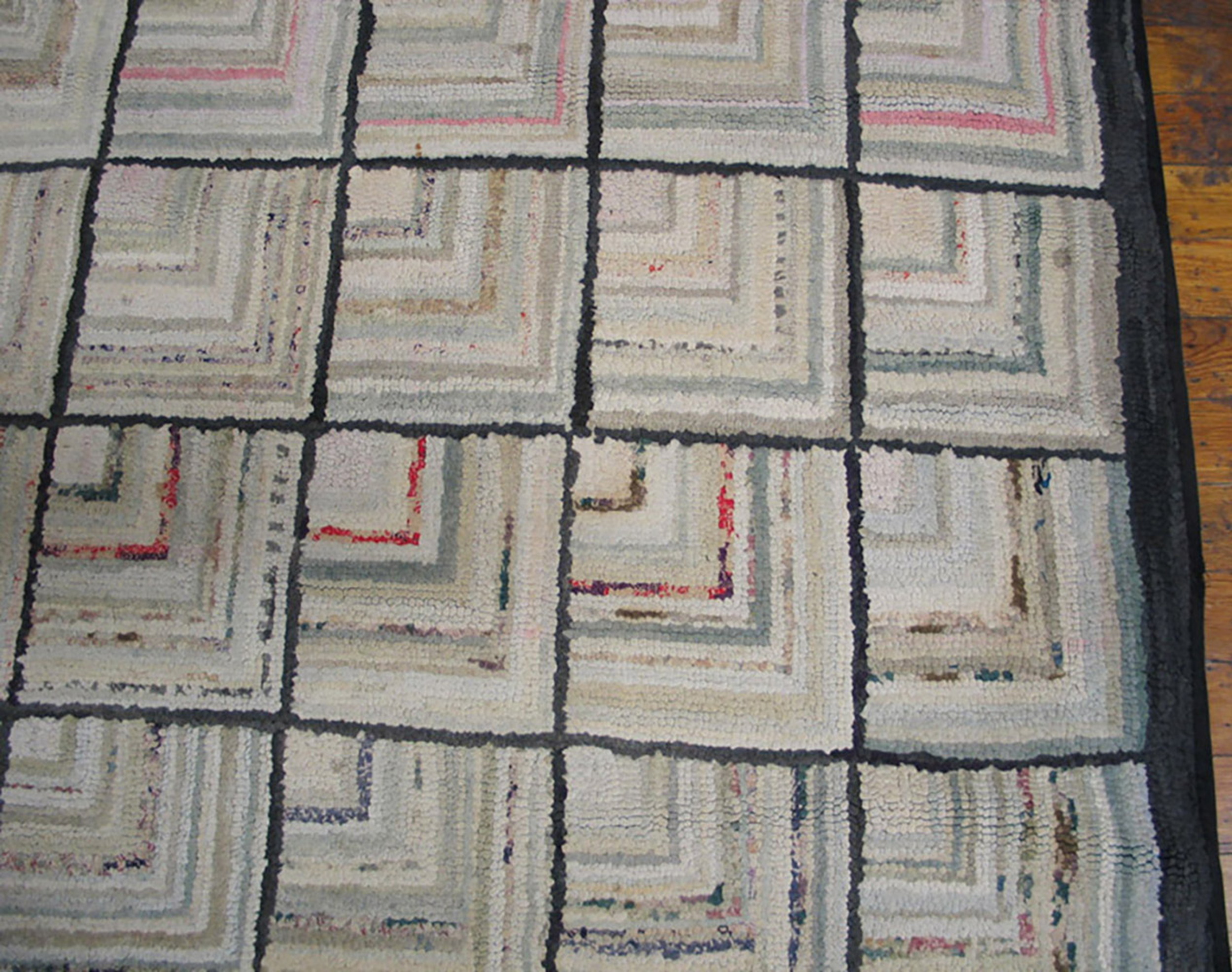The design employs a striking grid arrangement, where individual squares are filled with concentric angles, strongly reminiscent of the “Log Cabin” pattern found in traditional quilting. This repeating, non-directional structure establishes a powerful rhythm across the entire field, classifying it as a masterful example of allover rugs where no central medallion dominates the composition.