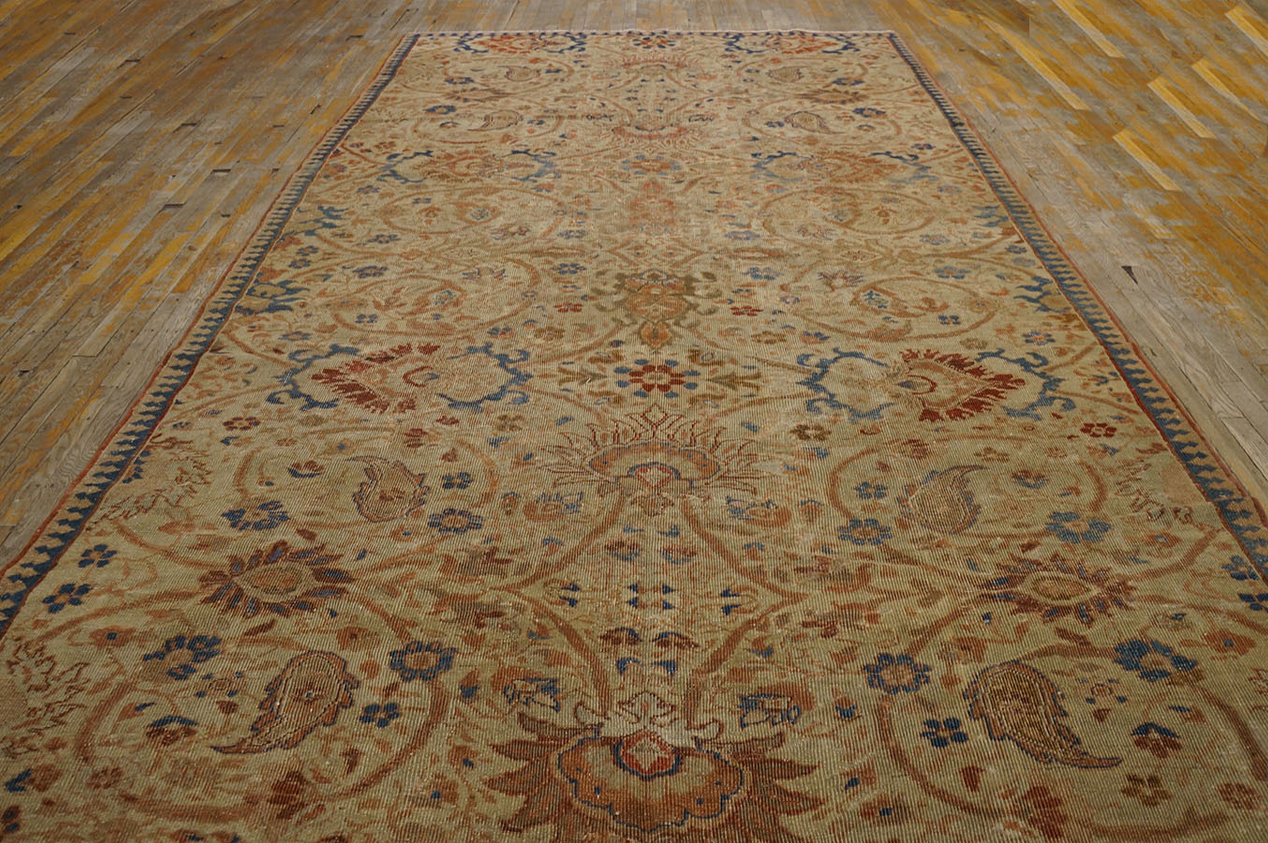 The all-over design features a complex lattice of scrolling vines and oversized palmettes, rendered in a relaxed, curvilinear style typical of late Qajar period weaving. The impressive dimensions of this piece confirm its status as a true room size rug, designed to anchor a substantial living space while providing visual warmth and historical depth.