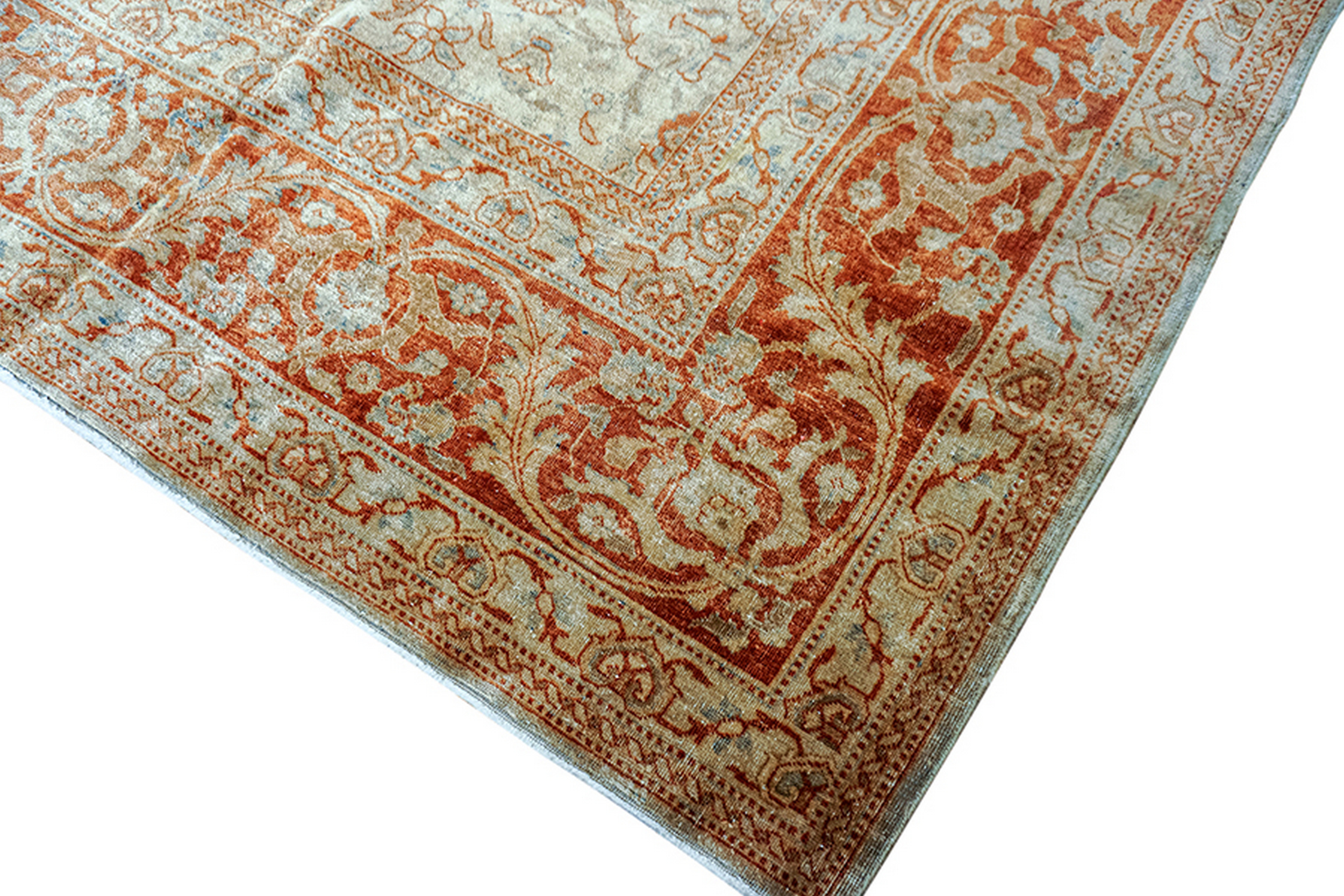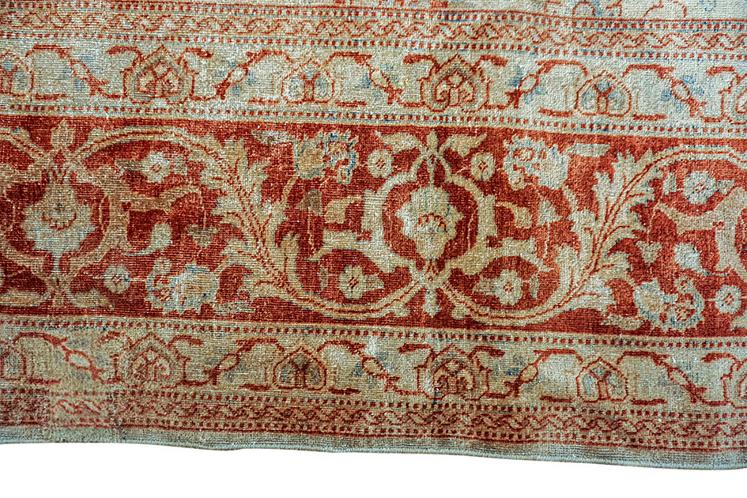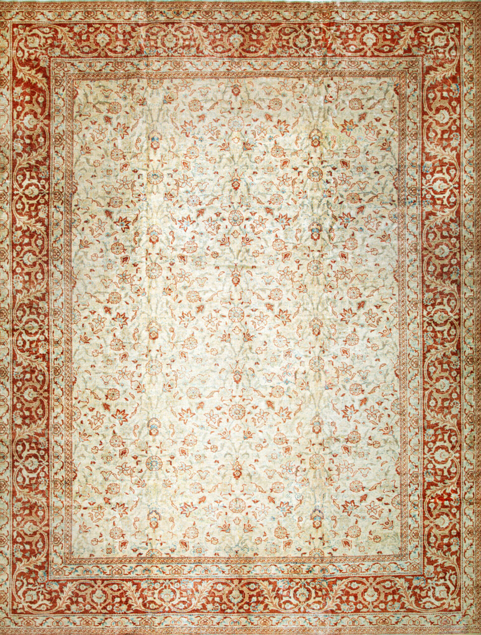 Antique Tabriz Persian 1880s Rug, Country of Origin: Iran / Persia, Circa Date: 1880s. This exceptional example of weaving from the late Qajar period showcases the refined artistry typical of Iranian / Persian rugs. The Tabriz workshop tradition emphasized technical precision and a sophisticated color palette, evident in the subtle interplay of the field and border.