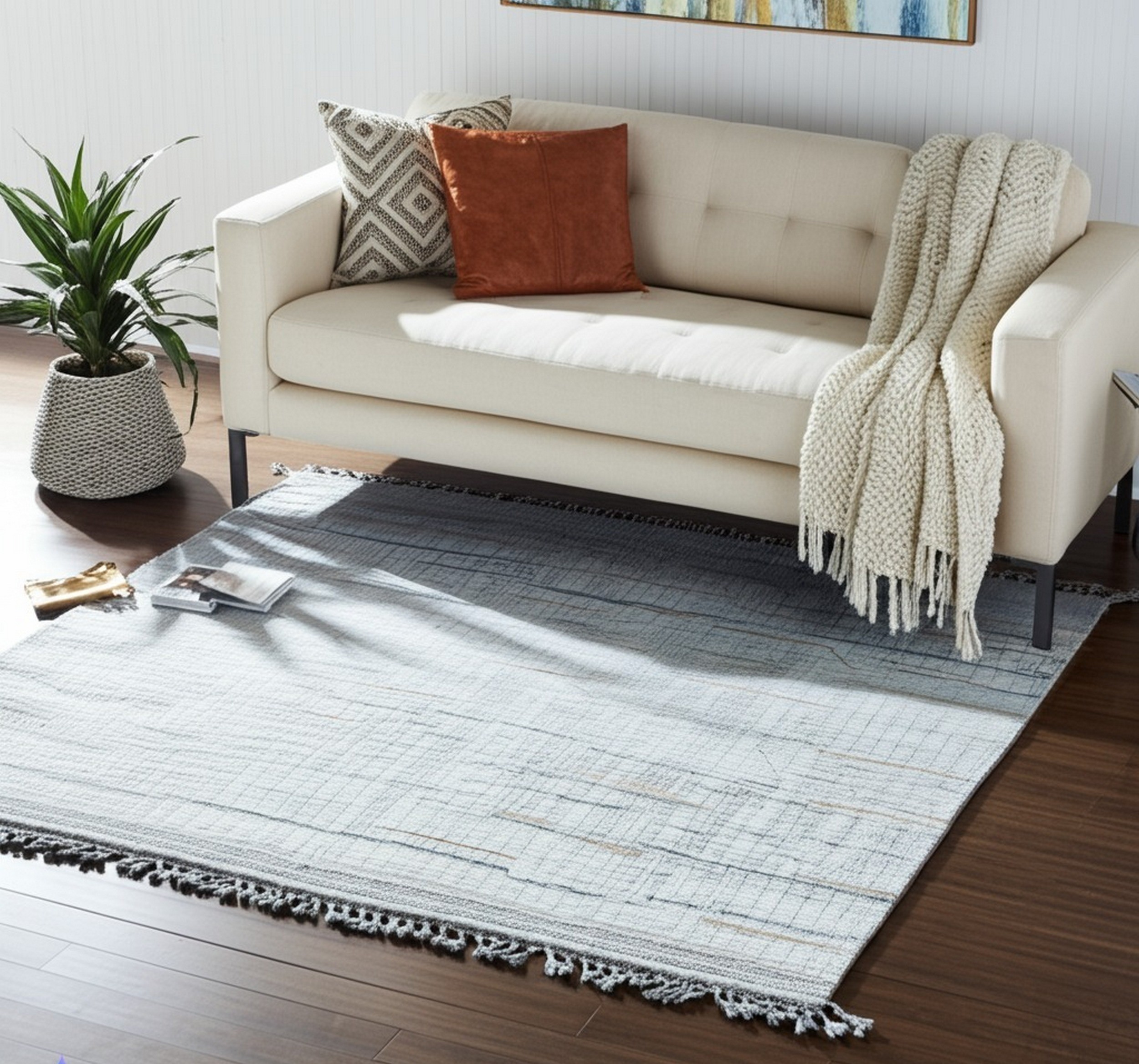 The foundation hue is a pristine, soft ivory, providing a luminous canvas that brightens any space. This delicate base is accented by short, intermittent dashes of muted gray and warm taupe, lending depth without overwhelming the minimalist aesthetic. Explore our full range of color options, including ivory beige cream rugs, for similar calming palettes.