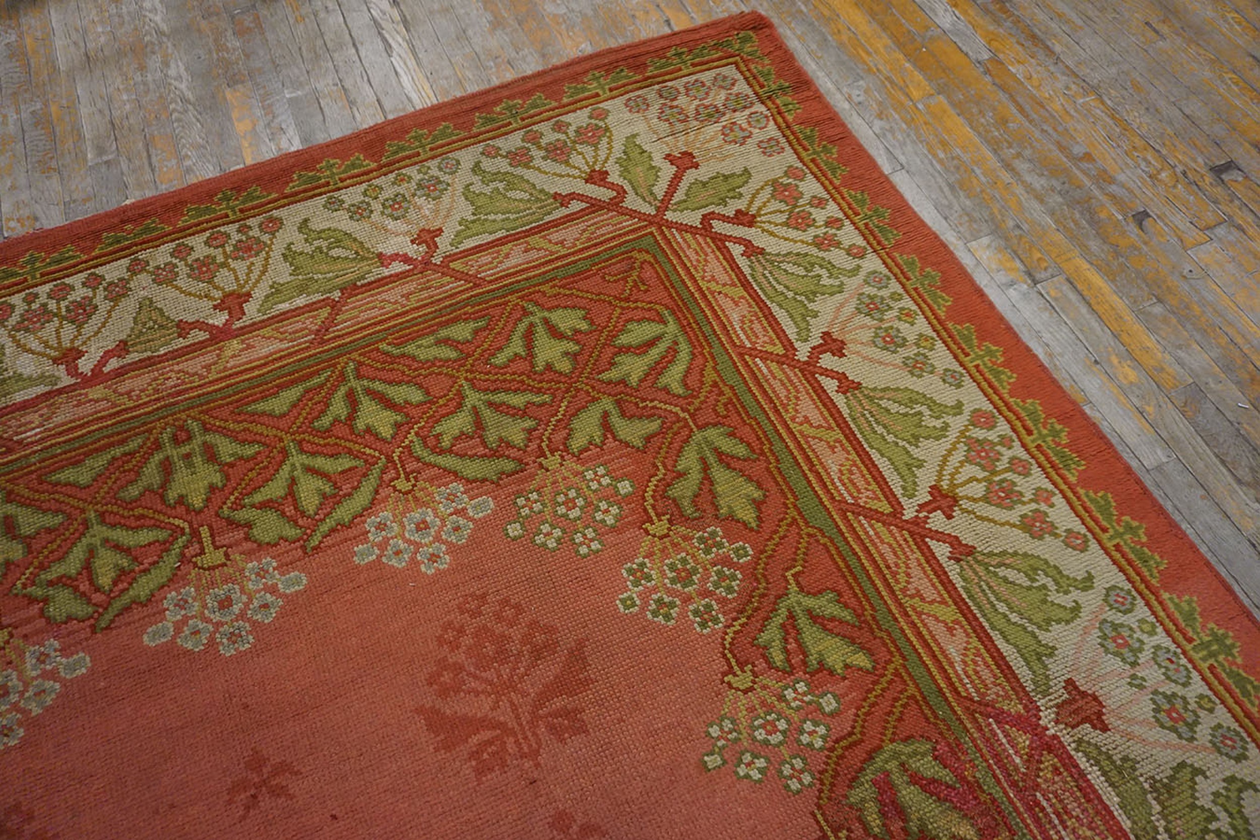 The composition is a classic example of the Arts and Crafts rug design philosophy, likely influenced by the visionary architects Gavin Morton or C.F.A. Voysey. Eschewing the dense, cluttered patterns of the Victorian era, this antique Irish rug prioritizes a rhythmic and spacious arrangement of stylized botanical motifs. These often include “honesty” leaves, Tudor-style roses, or scrolling “Tree of Life” vines, rendered with a bold, two-dimensional clarity. The light pink ground acts as a radiant stage, allowing the saturated greens, ochres, and ivories of the floral elements to “breathe” in a way that feels surprisingly modern.