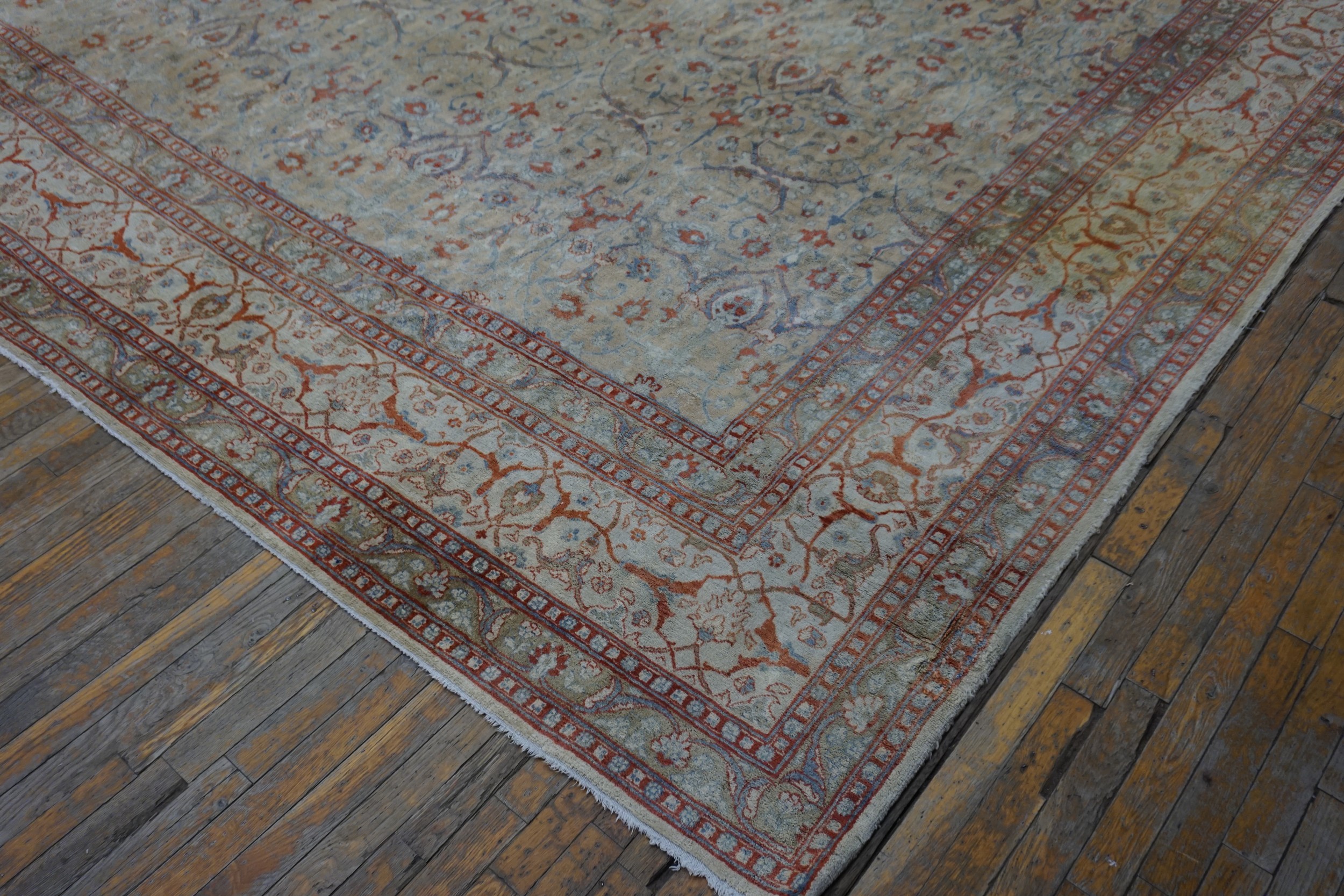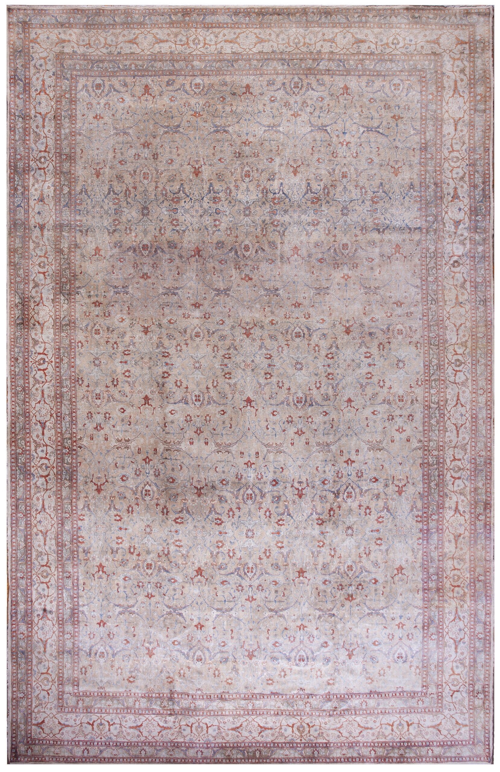Antique Large Tabriz Persian Allover Knotted Rug, Circa Date: 1890s. This exceptional Persian piece from the late Qajar era exemplifies the refined weaving tradition of Tabriz. Its expansive field is characterized by a sophisticated allover design, eschewing a central medallion for a continuous, flowing pattern of stylized palmettes and delicate vine work.