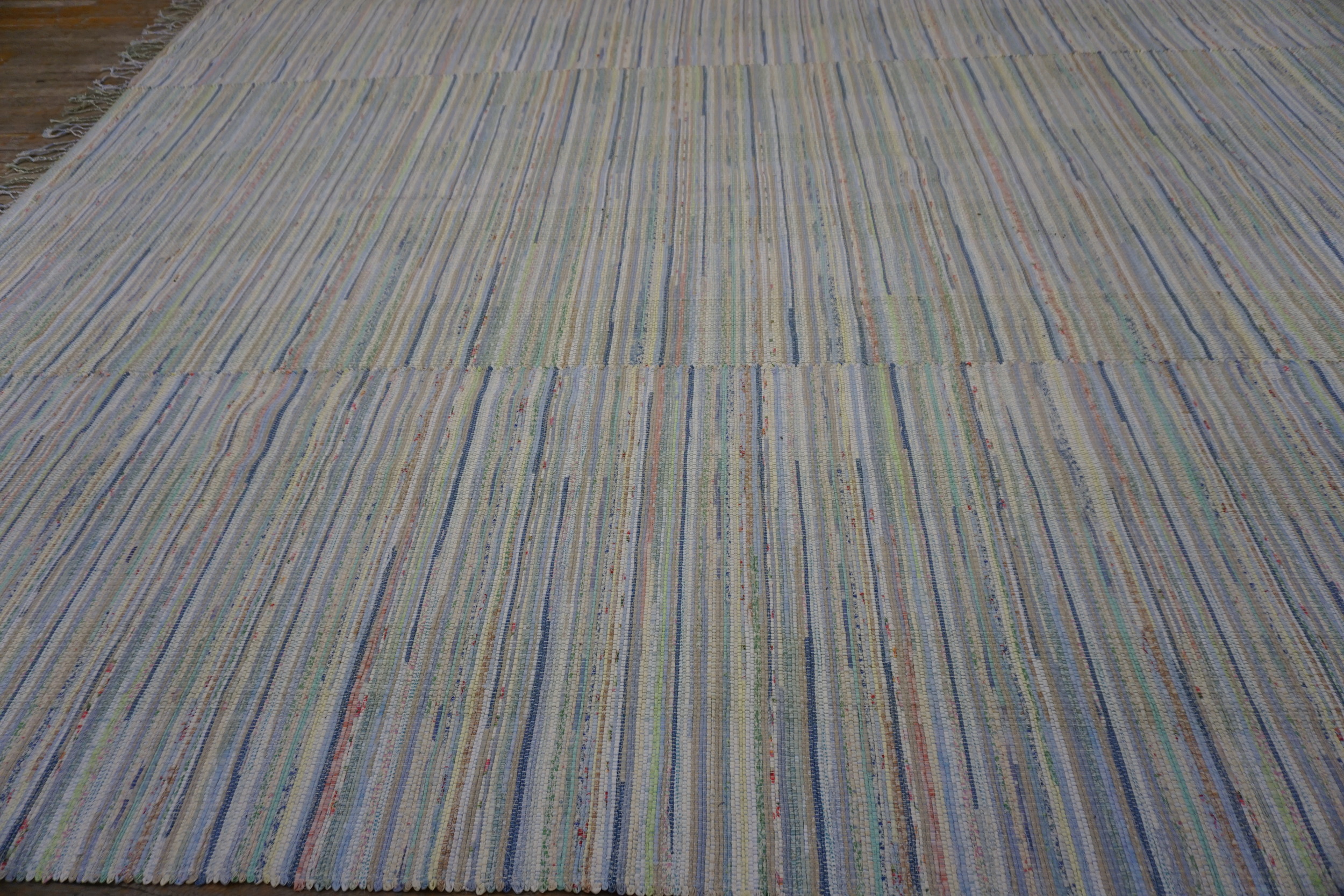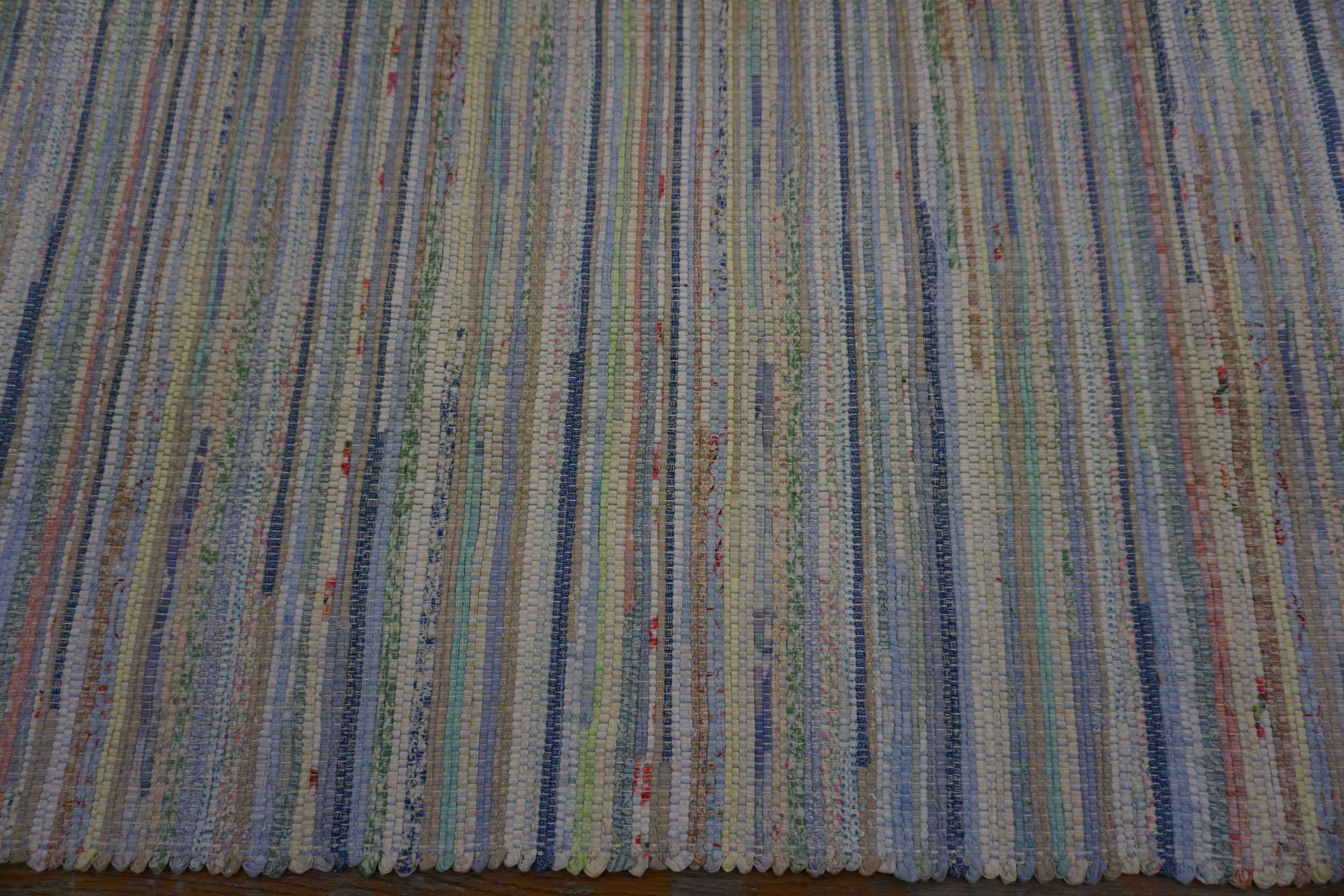 The palette is remarkably soft, dominated by creamy whites and ivories, subtly accented by thin vertical lines of faded pastel hues—pale robin’s egg blue, mint green, and blush pink. This gentle coloration gives the piece a light, airy presence, while the repeating vertical structure establishes an effective allover design that minimizes visual clutter.