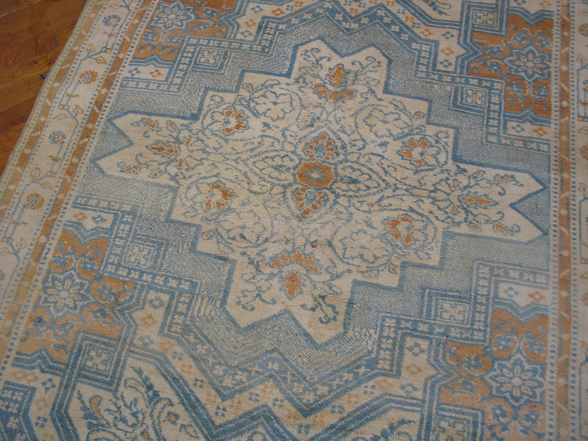 The central medallion structure is rendered in delicate, oxidized tones of cream and peach, sharply contrasted by the striking use of blue color rugs throughout the field and borders. While the overall composition relies on classical symmetry, the stepped outlines and serrated edges introduce pronounced geometric elements that provide structure and visual depth to the otherwise flowing design.