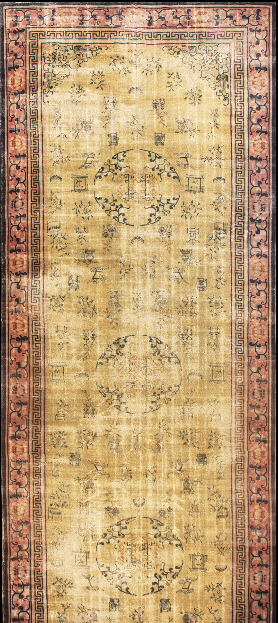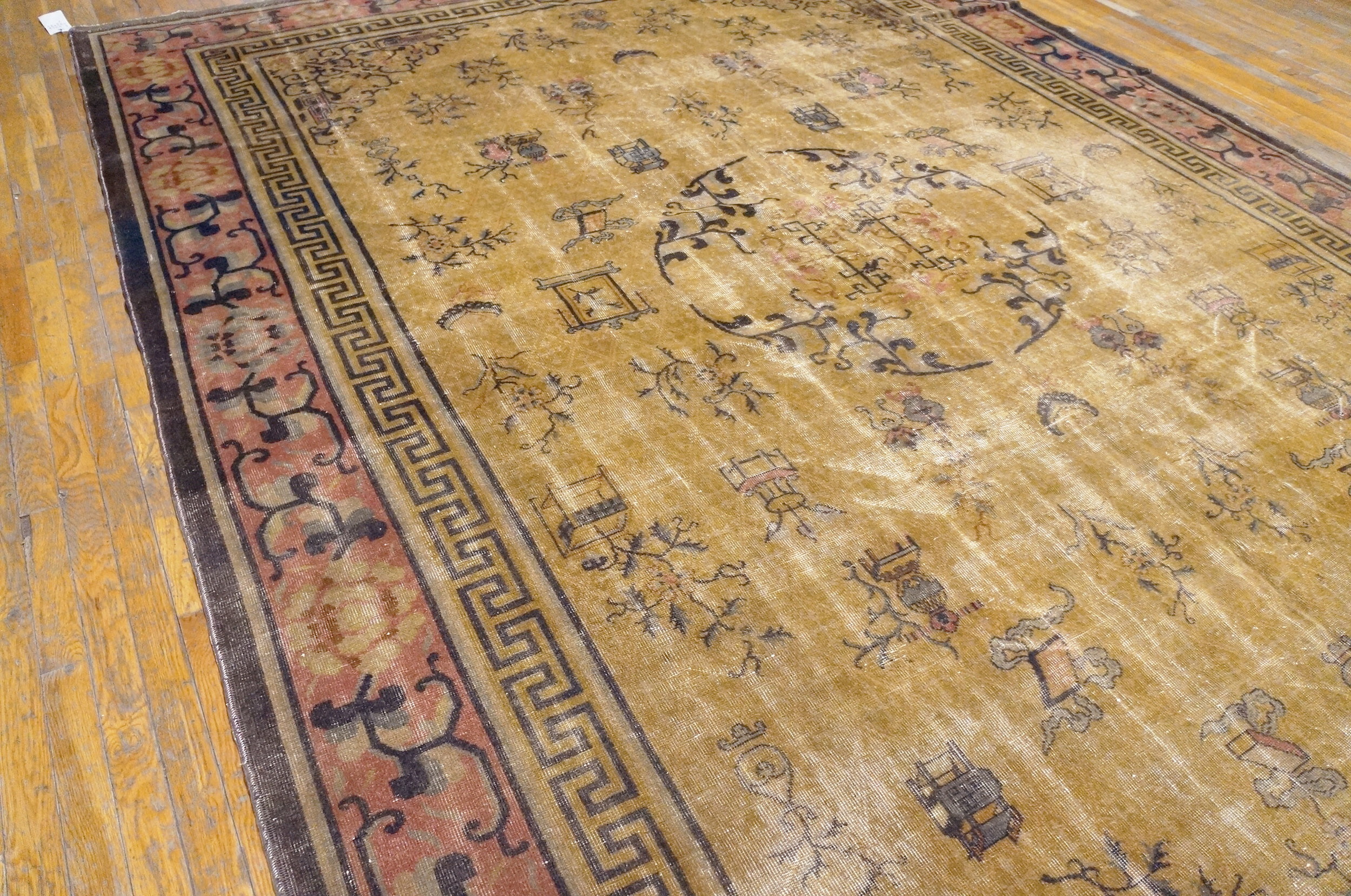 The field is dominated by a luminous, softly oxidized gold hue, placing it among the most desirable gold color rugs of the era. The design employs a sparse, scattered composition of traditional auspicious symbols, including vases, scrolls, and stylized floral sprigs, which float delicately across the expansive ground. This specific weaving technique confirms its status as a genuine Chinese Knotted Rug.