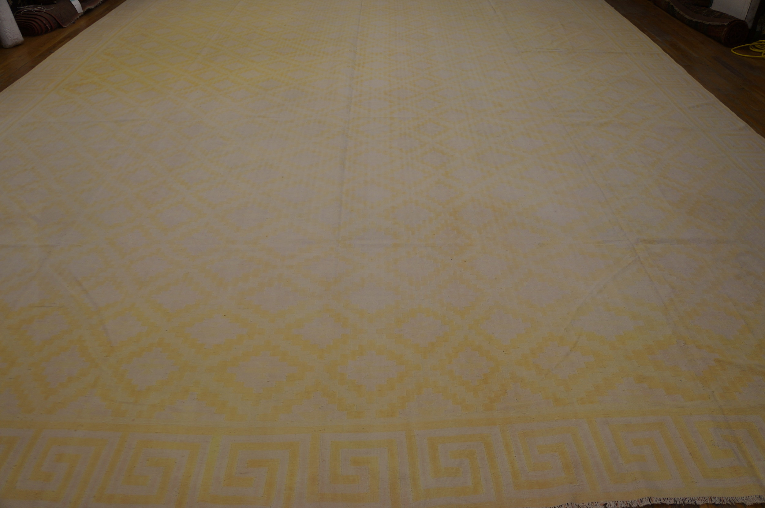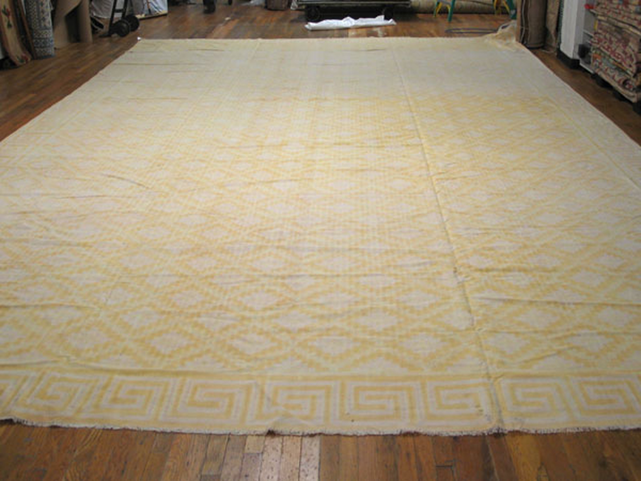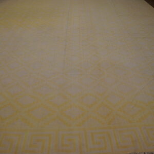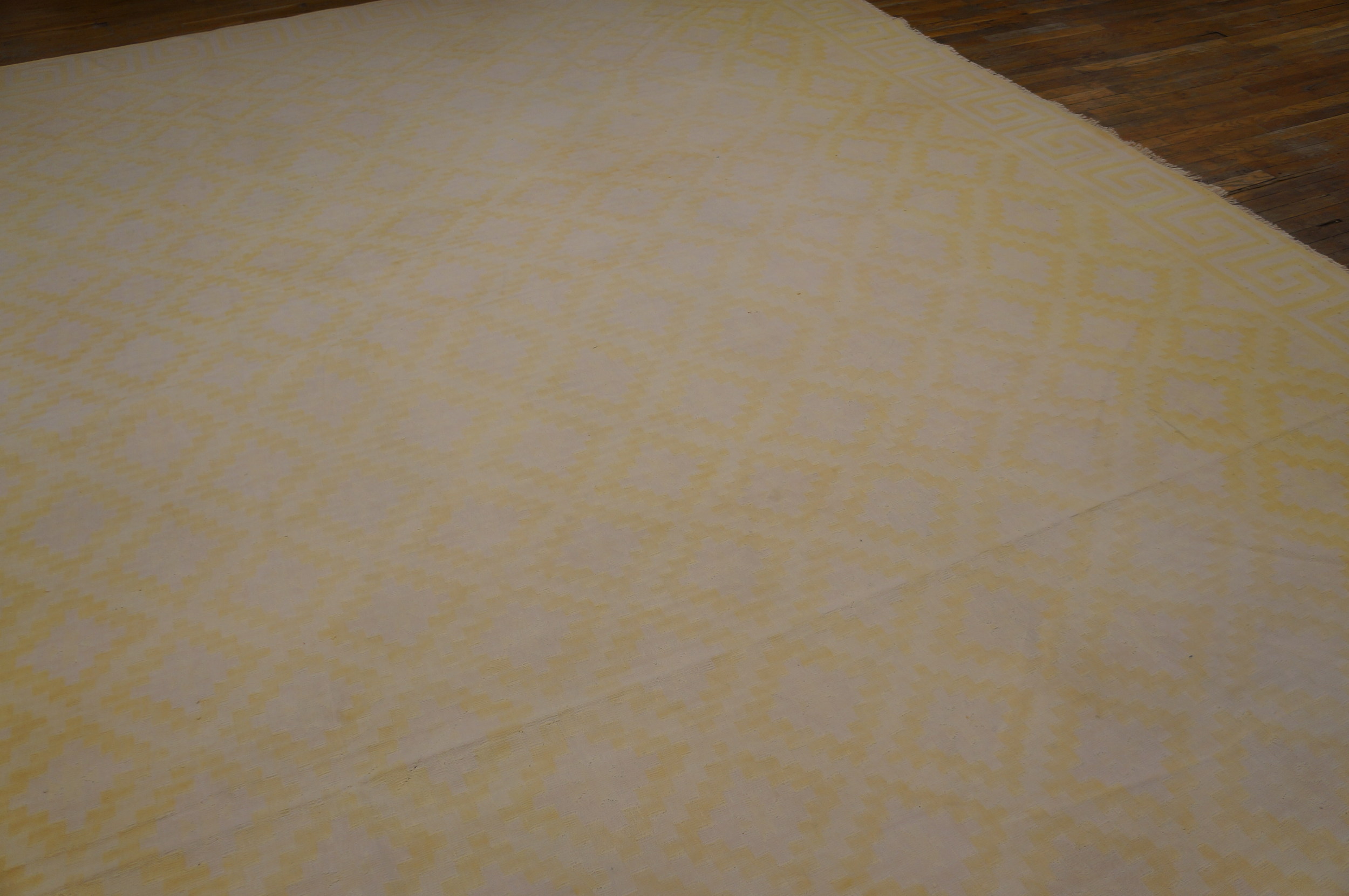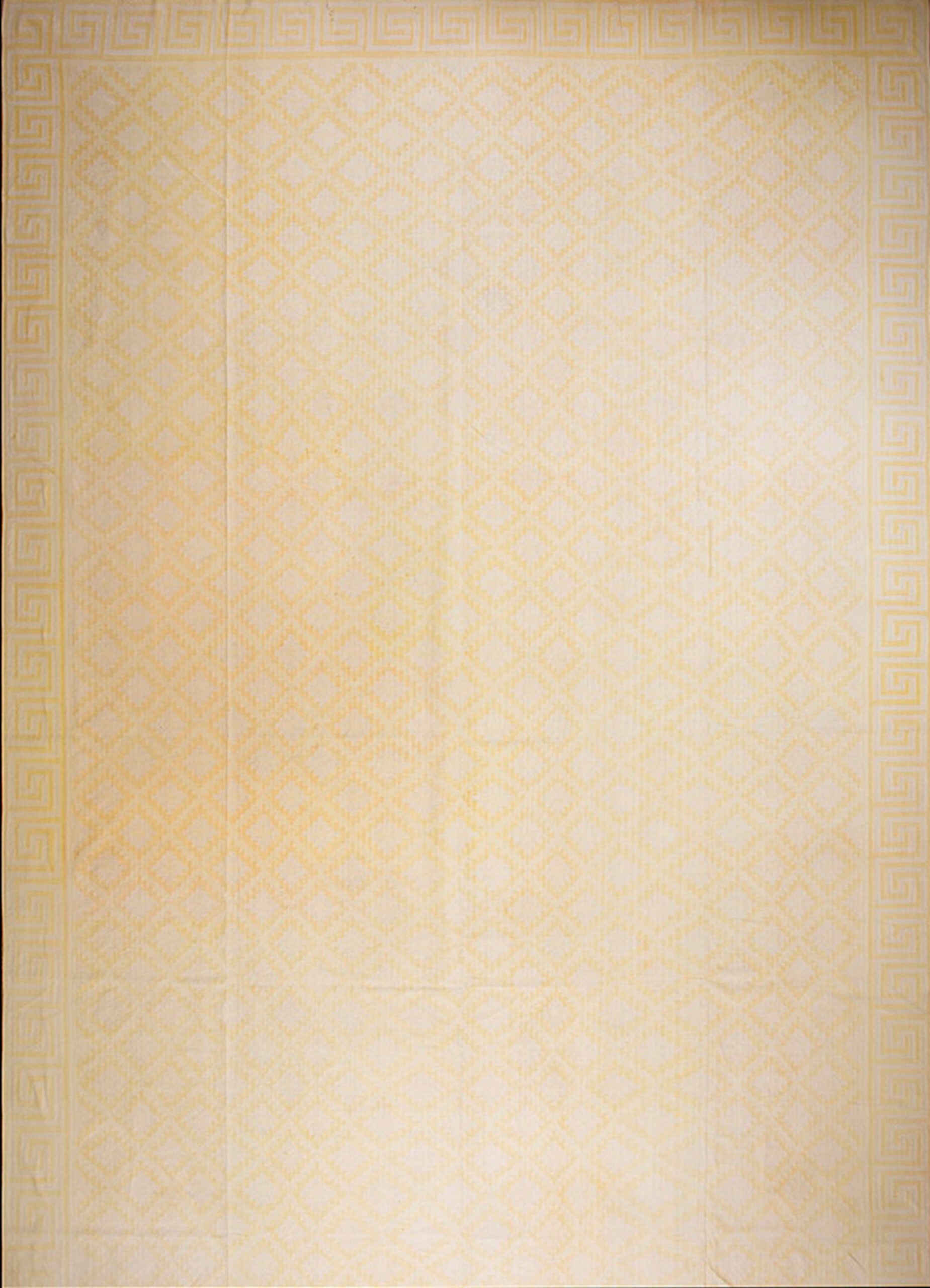 This light yellow gold color antique Indian flatweave geometric oversized cotton dhurrie rug is a striking example of traditional rug weaving from India that pairs artful simplicity with broad decorative appeal. Crafted using classic flatweave rug weaving techniques, this oversized dhurrie features a subtle yet engaging geometric design set against a warm light yellow gold ground, creating a balanced and inviting visual presence for large interior spaces.