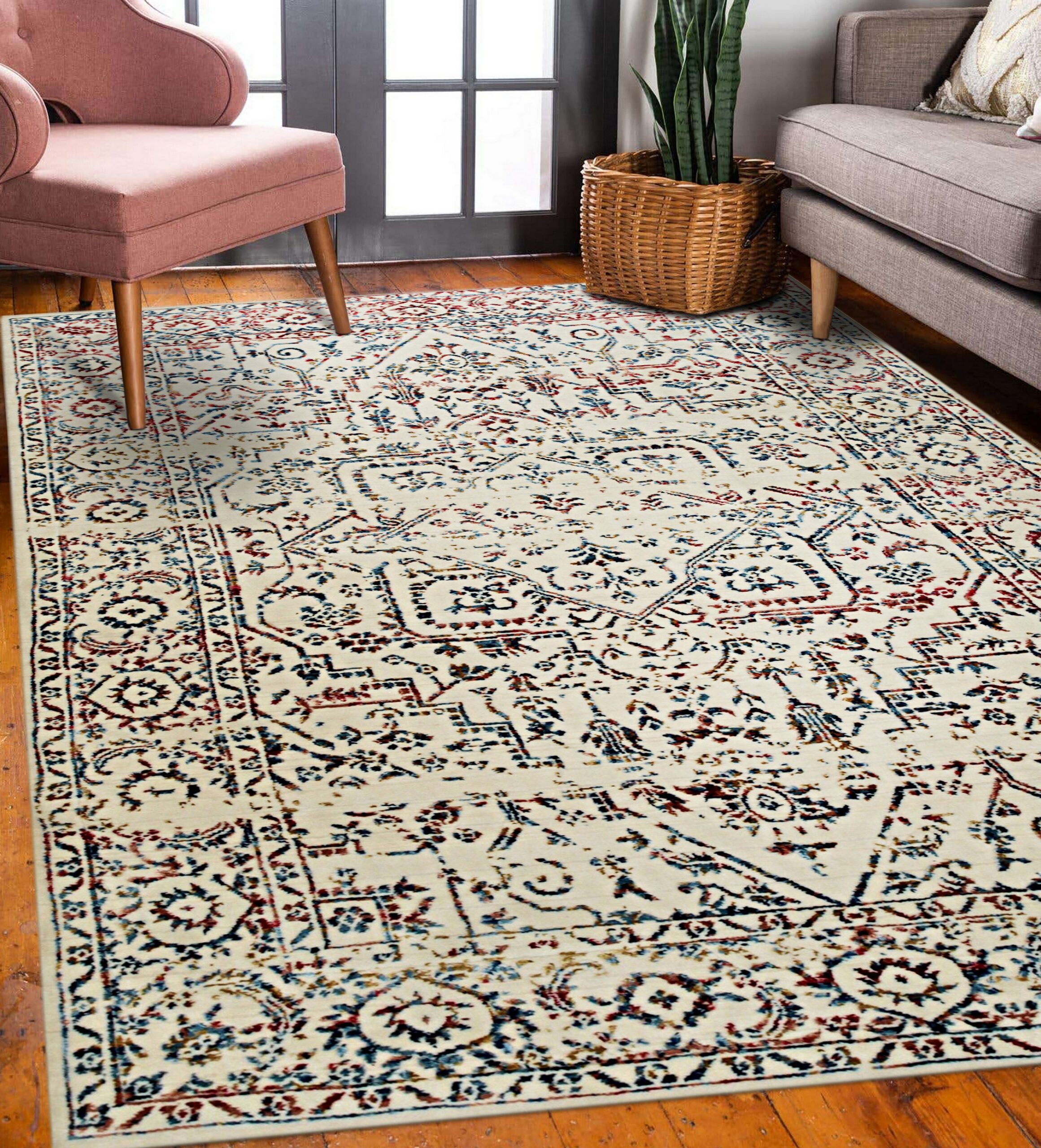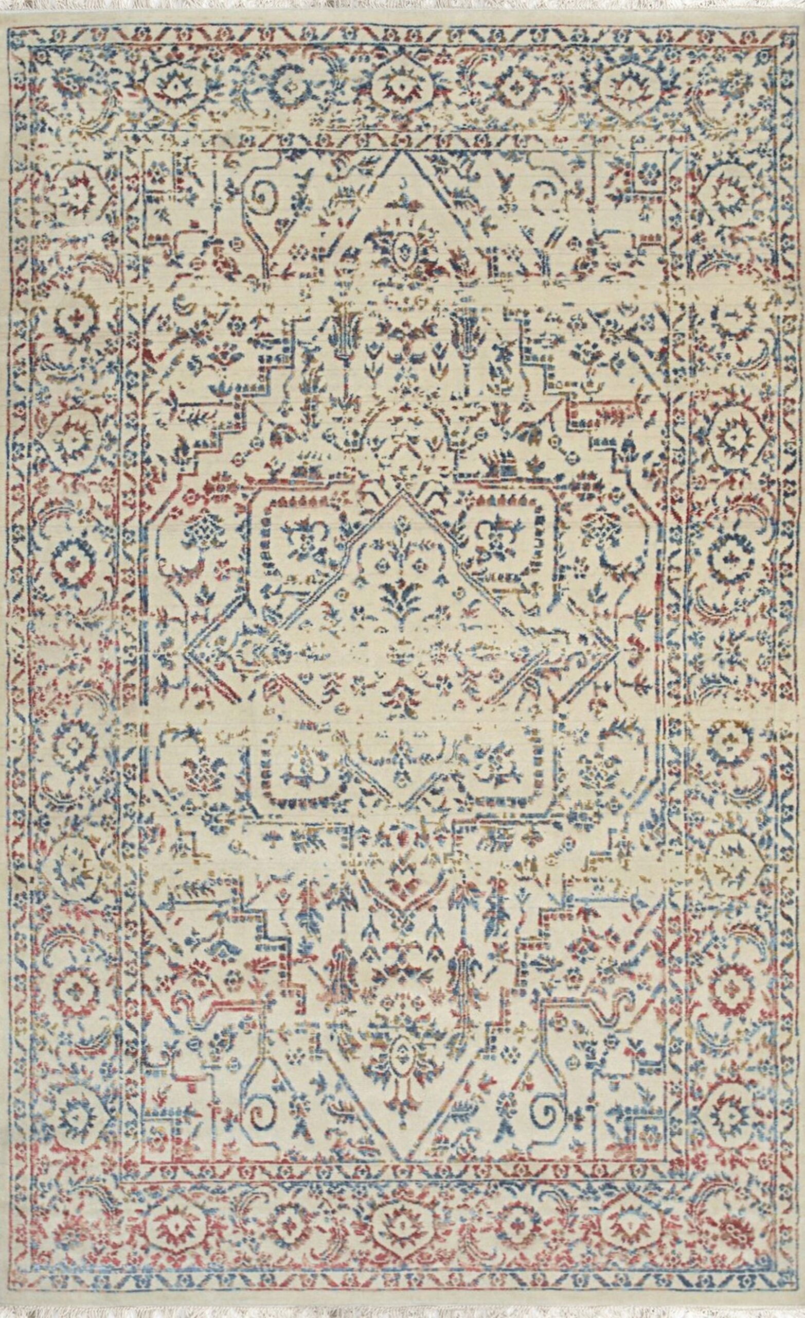 The palette is grounded by a serene field of ivory beige cream, providing a neutral canvas that highlights the intricate, faded patterning. Traditional motifs are rendered in muted shades of denim blue and soft terracotta, creating a subtly aged, transitional aesthetic that complements both classic and modern decor schemes.