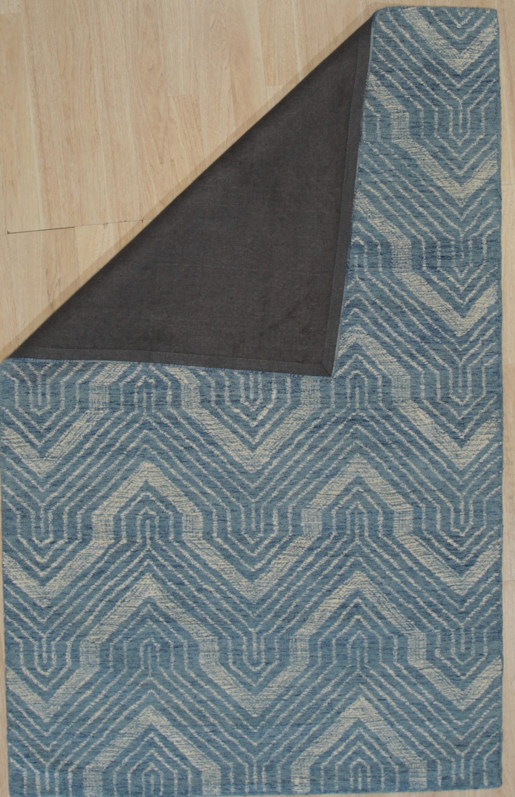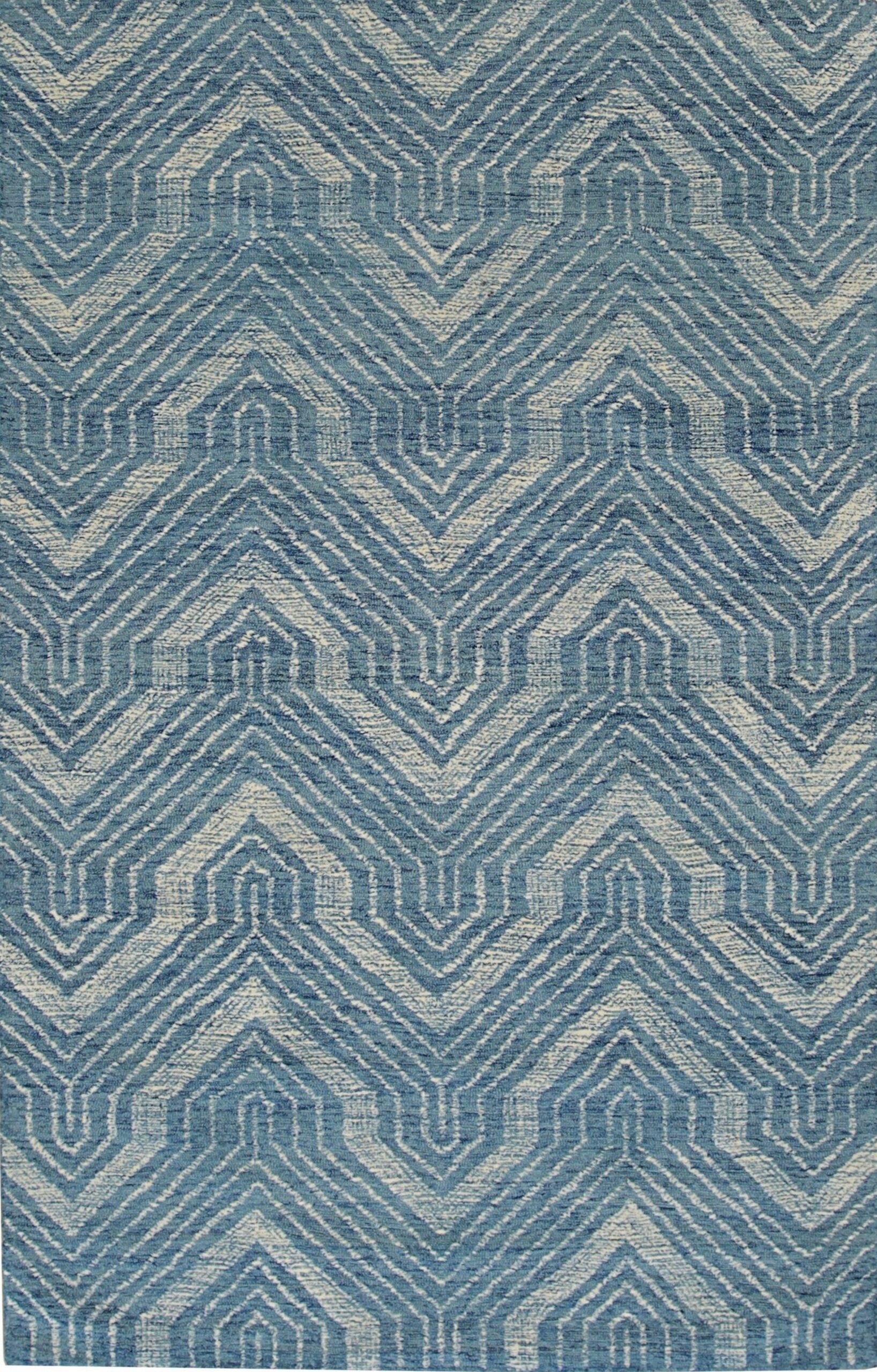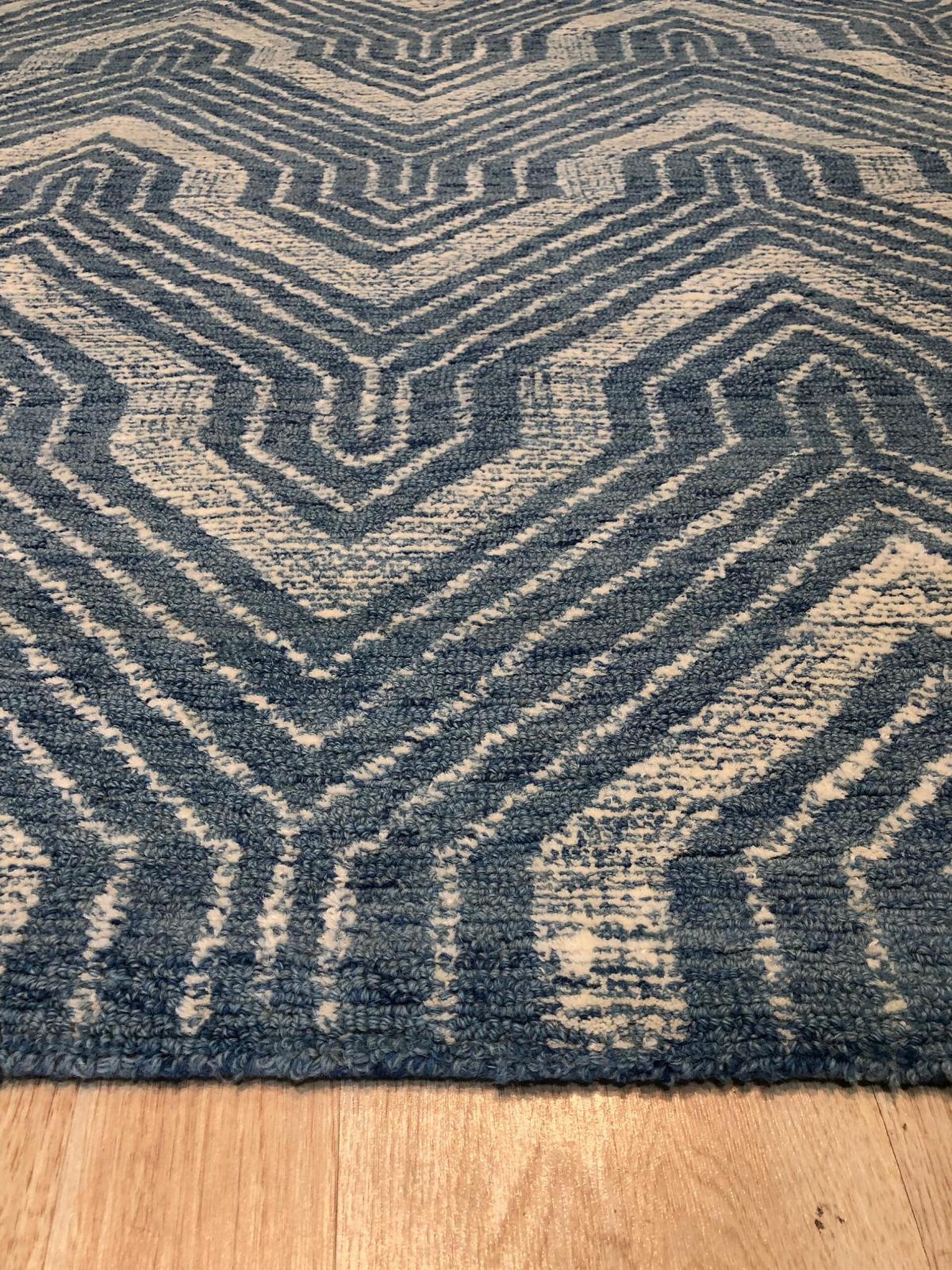 The Lila Dahlia features a dynamic, repeating chevron motif overlaid with subtle architectural arches, creating an optical depth that anchors any space. The rich, variegated tones of indigo and cerulean establish it as a premier selection among blue color rugs, providing a sophisticated yet calming visual foundation for contemporary interiors.