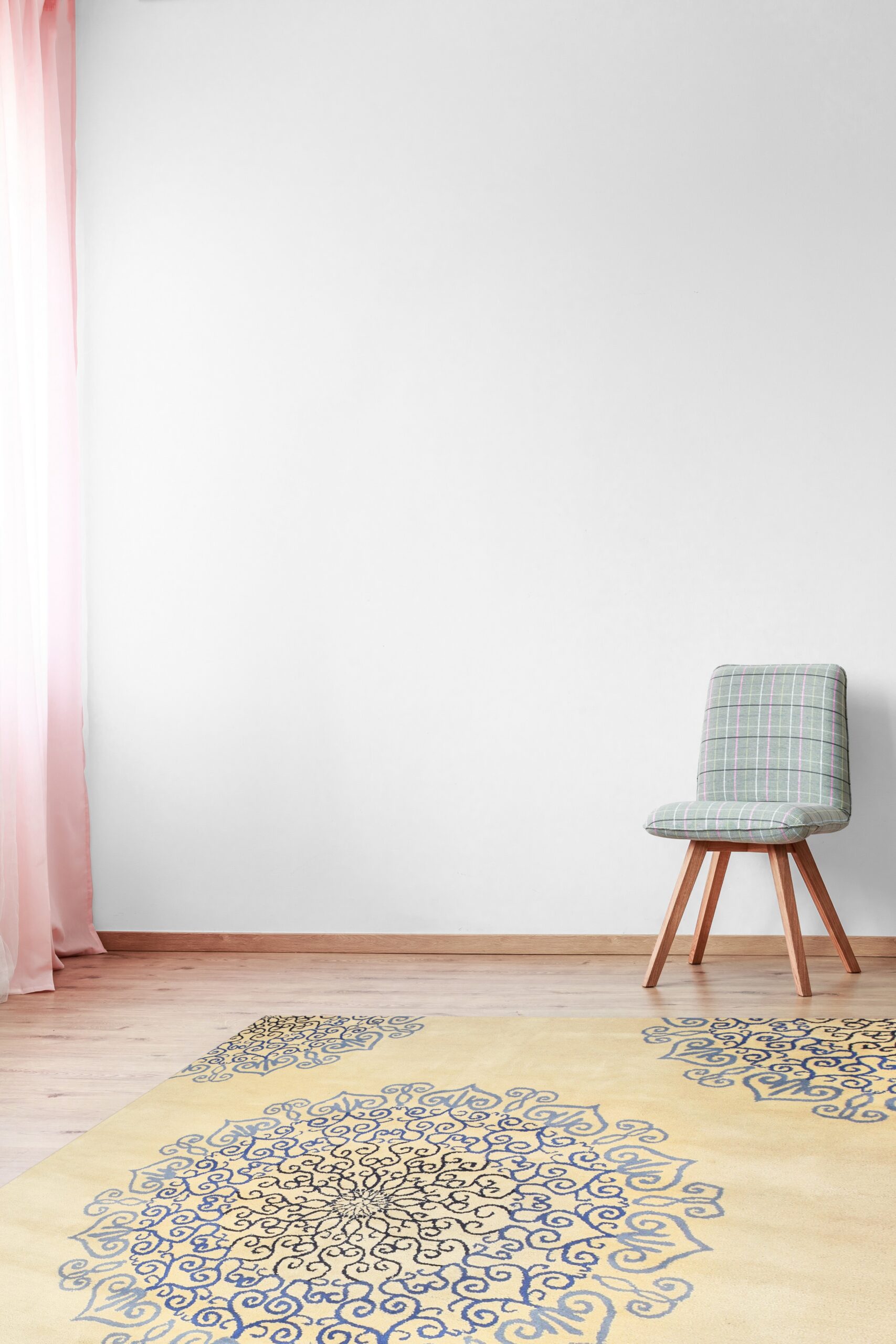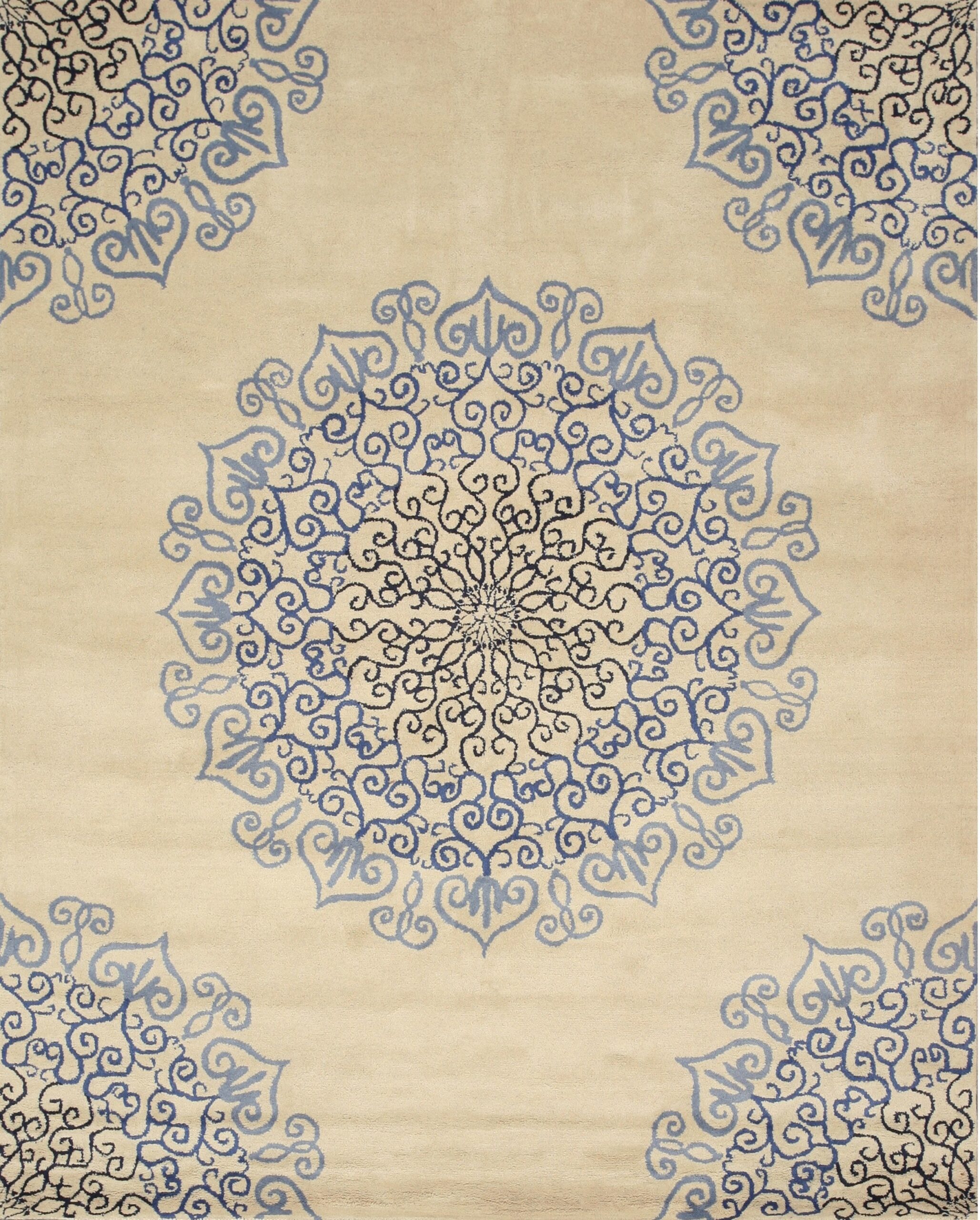 Louie Sloane Blue Hand Tufted Wool Rug, Country of Origin: India. This luxurious piece showcases a striking transitional design, melding classic mandala structure with contemporary, free-flowing arabesques. The quality of the hand tufting highlights the plush wool pile, representing the fine craftsmanship characteristic of Indian rugs.