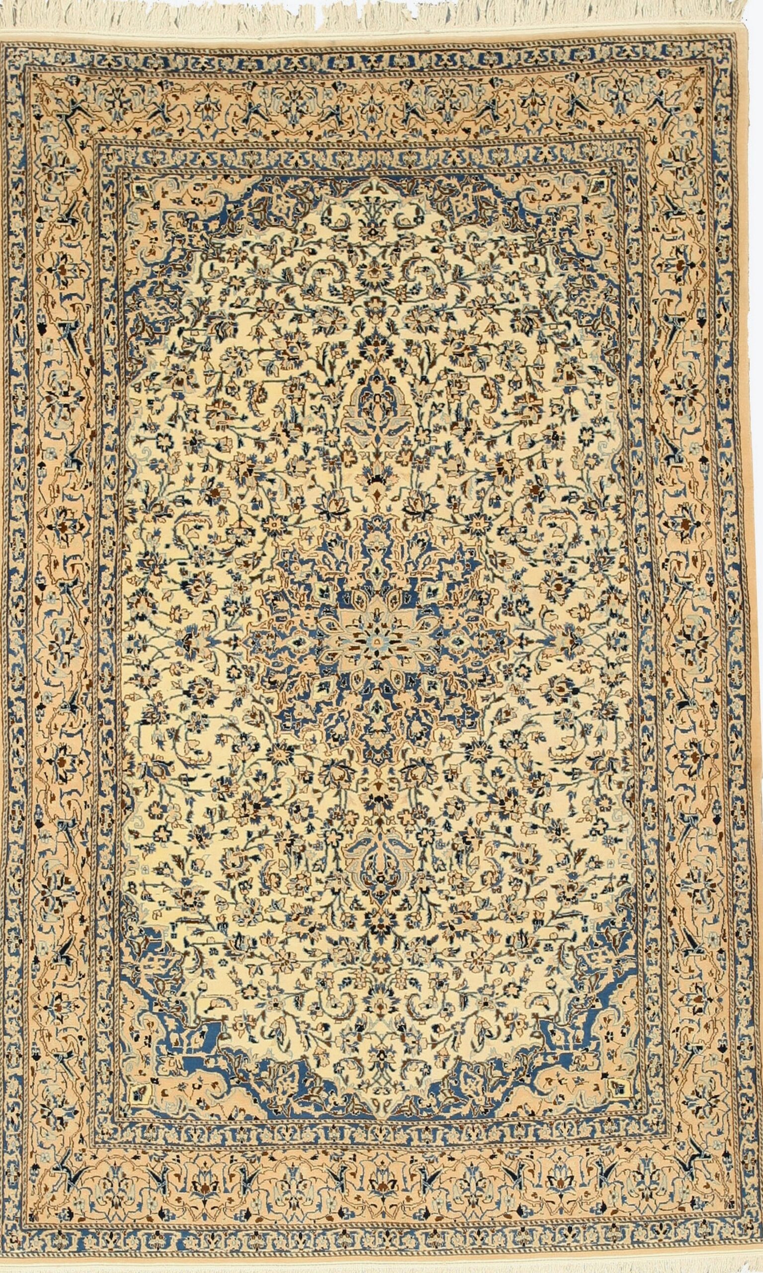 The palette is restrained yet impactful. The primary ivory field is framed by soft beige borders, while deep sapphire and cobalt blues are strategically employed to define the intricate floral motifs and the main border lines. This precise use of color adds depth without overwhelming the rug’s inherent lightness, making it an adaptable centerpiece.