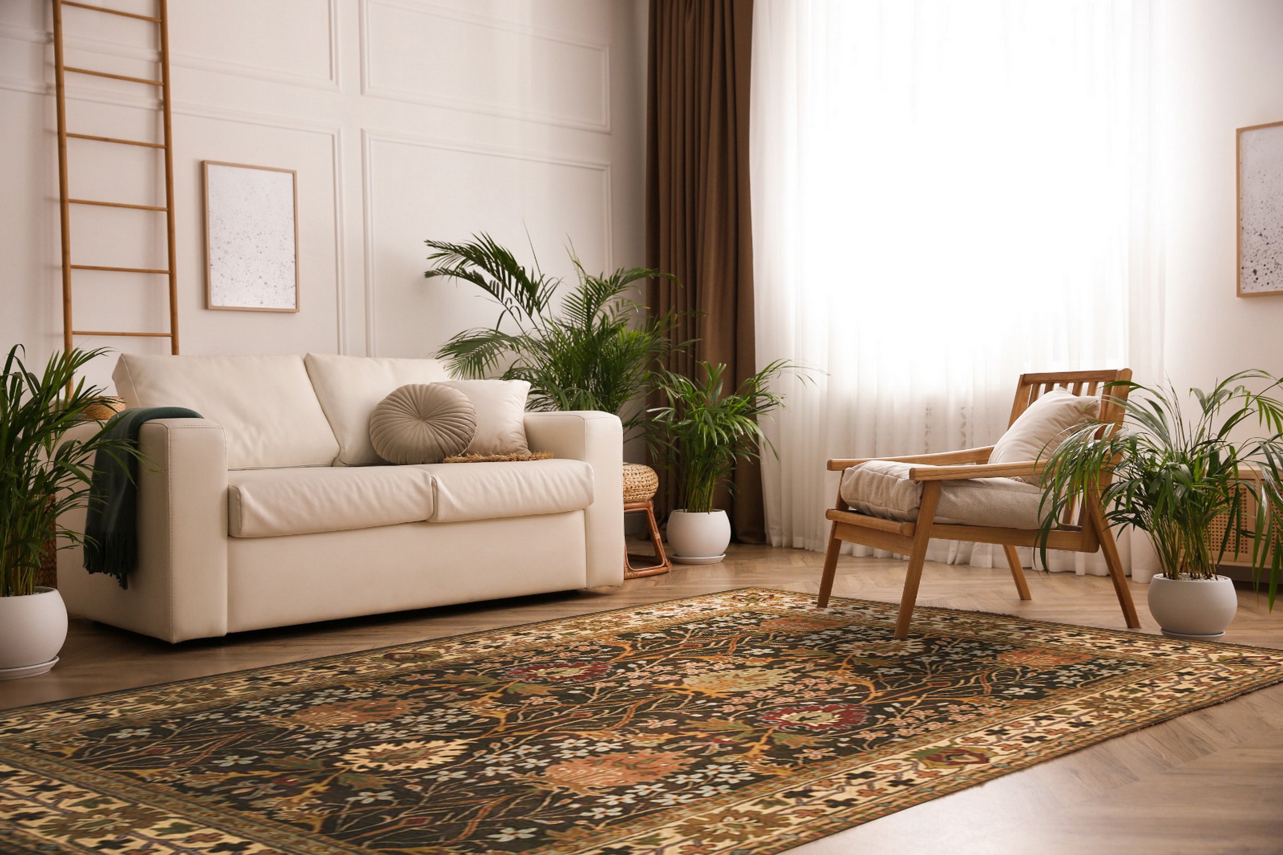 The field presents a highly saturated, near-black ground, providing a dramatic canvas for the intricate botanical motifs. The palette is expertly restrained, featuring deep reds, moss greens, and soft blues, harmonizing within the overall scheme of rich brown earth tone color rugs. This depth of color ensures the rug anchors any space with stately elegance.