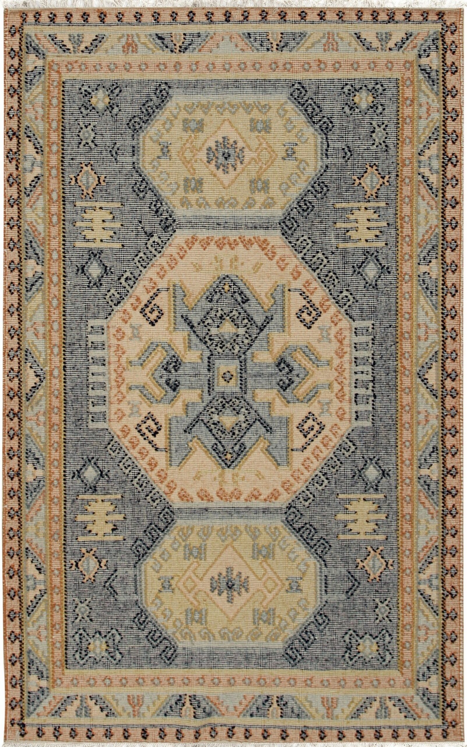 Luna Kilim Blue Hand Knotted Wool Rug, Country of Origin: India. This exceptional piece, originating from Indian rugs, showcases the enduring appeal of flat-woven textiles, presenting a sophisticated interpretation of traditional tribal geometry. The dense wool construction provides a substantial texture, while the kilim weave ensures durability and a low profile suitable for contemporary interiors.