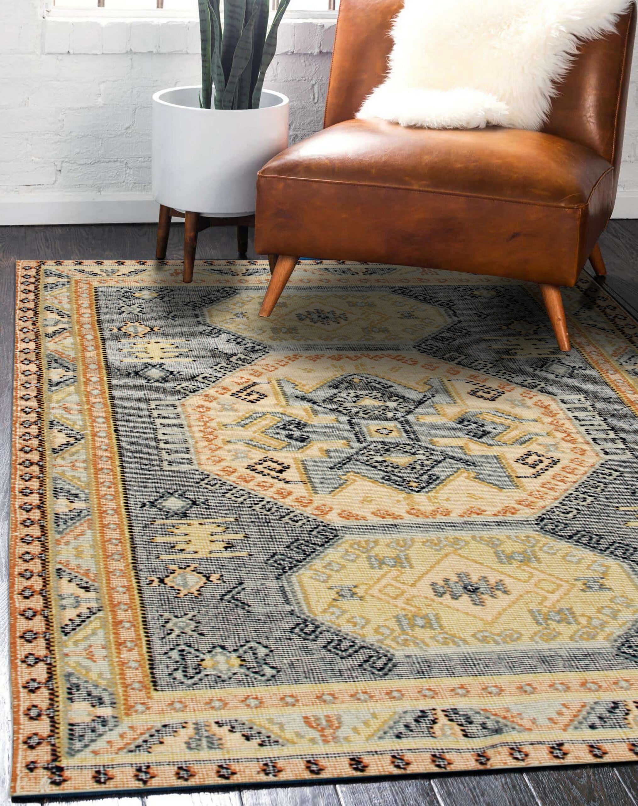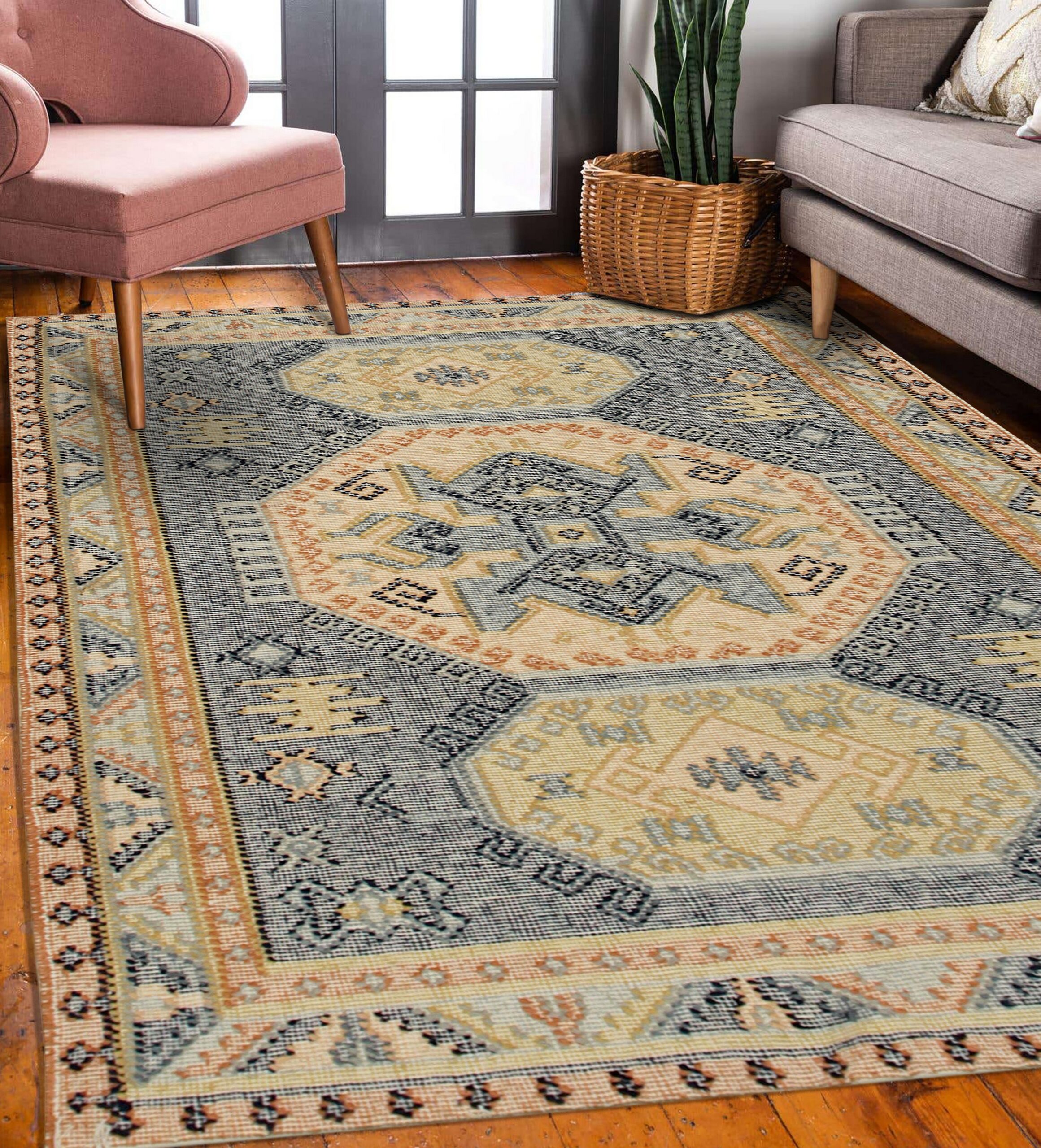 The palette is anchored by a rich, deep slate blue field, which provides a striking visual contrast to the warm, sun-bleached tones of cream and soft gold defining the central medallions. This strategic use of color highlights the intricate, stepped motifs that characterize the rug’s design. The prevalence of blue color rugs in sophisticated contemporary spaces makes this piece highly versatile.