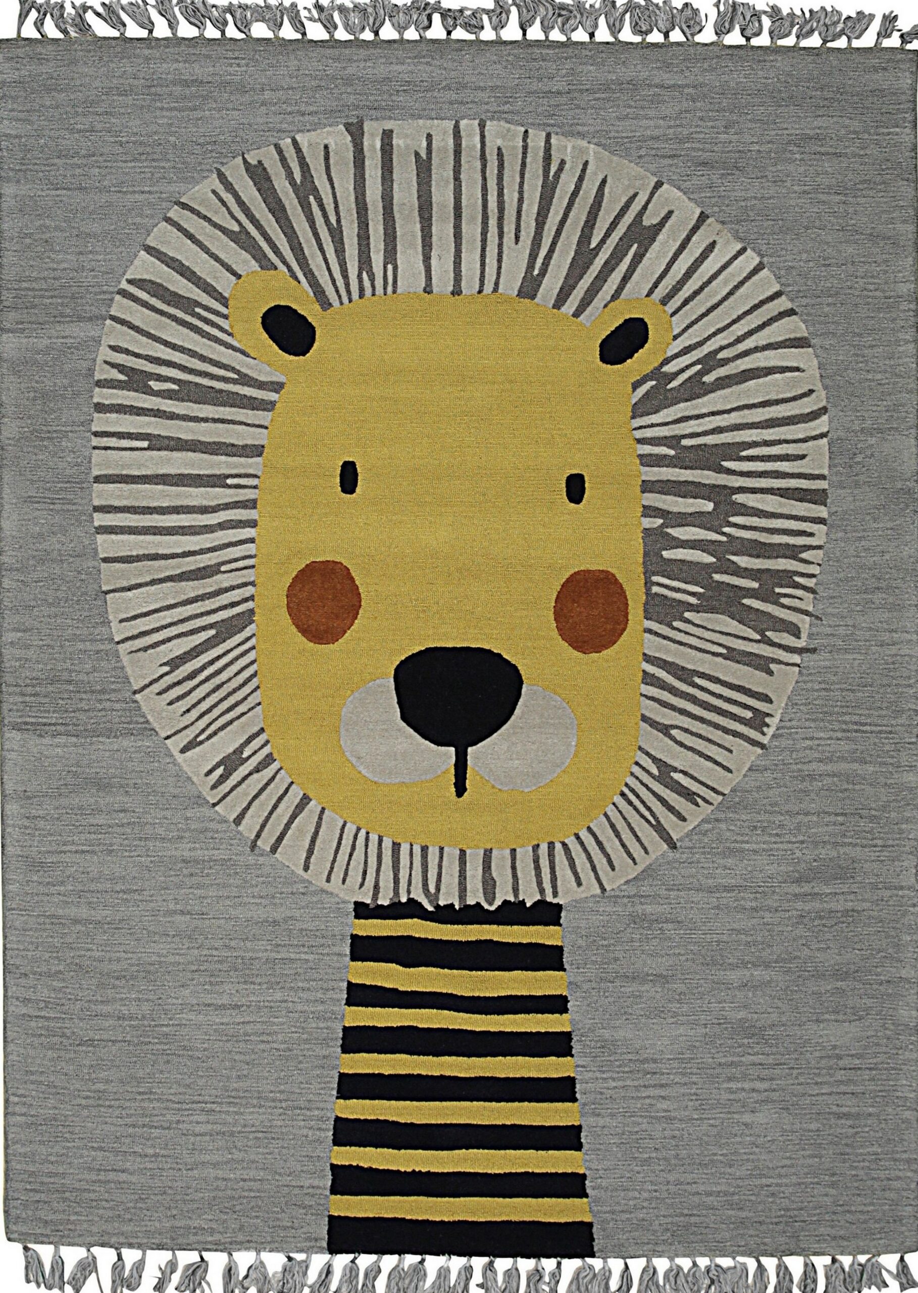 Lush Graceful Gray Hand Tufted Wool Rug, Country of Origin: India. This charming piece showcases a whimsical, oversized depiction of a lion’s face, rendered in a striking modern graphic style. Crafted with precision using the hand-tufting technique, this rug offers a dense, luxurious pile. The vibrant yellow of the lion’s head contrasts sharply with the subtle field, reflecting the skilled textile heritage of Indian rugs.