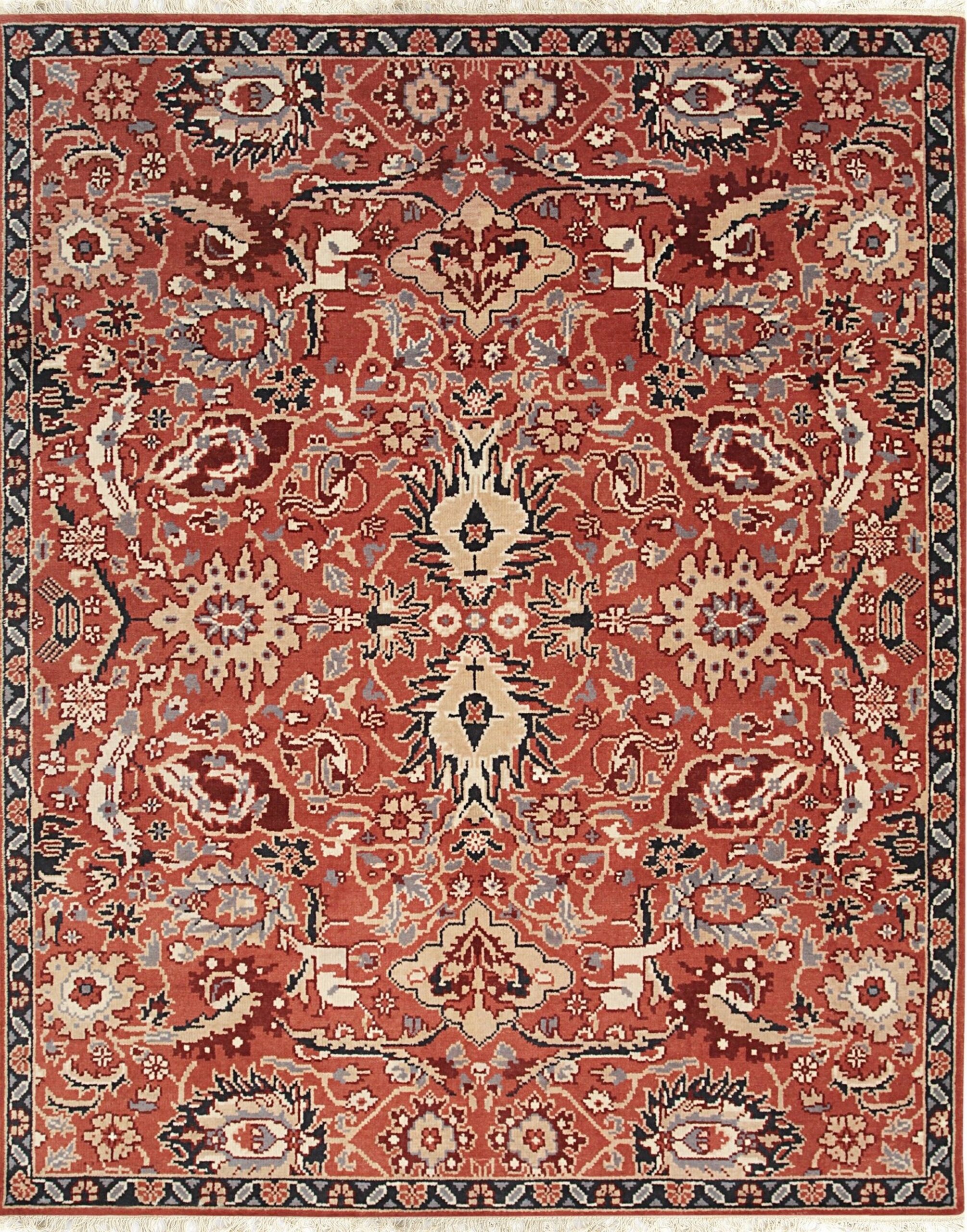 The primary color field is a rich, saturated rust—a deep terracotta hue that provides warmth and grounding to any interior space. This complex shade, which borders on the salmon, coral, pink spectrum, is beautifully contrasted by secondary elements rendered in soft cream, taupe, and slate gray, lending the design exceptional depth and dimension. The hand-knotted wool pile ensures a luxurious underfoot experience and lasting durability.