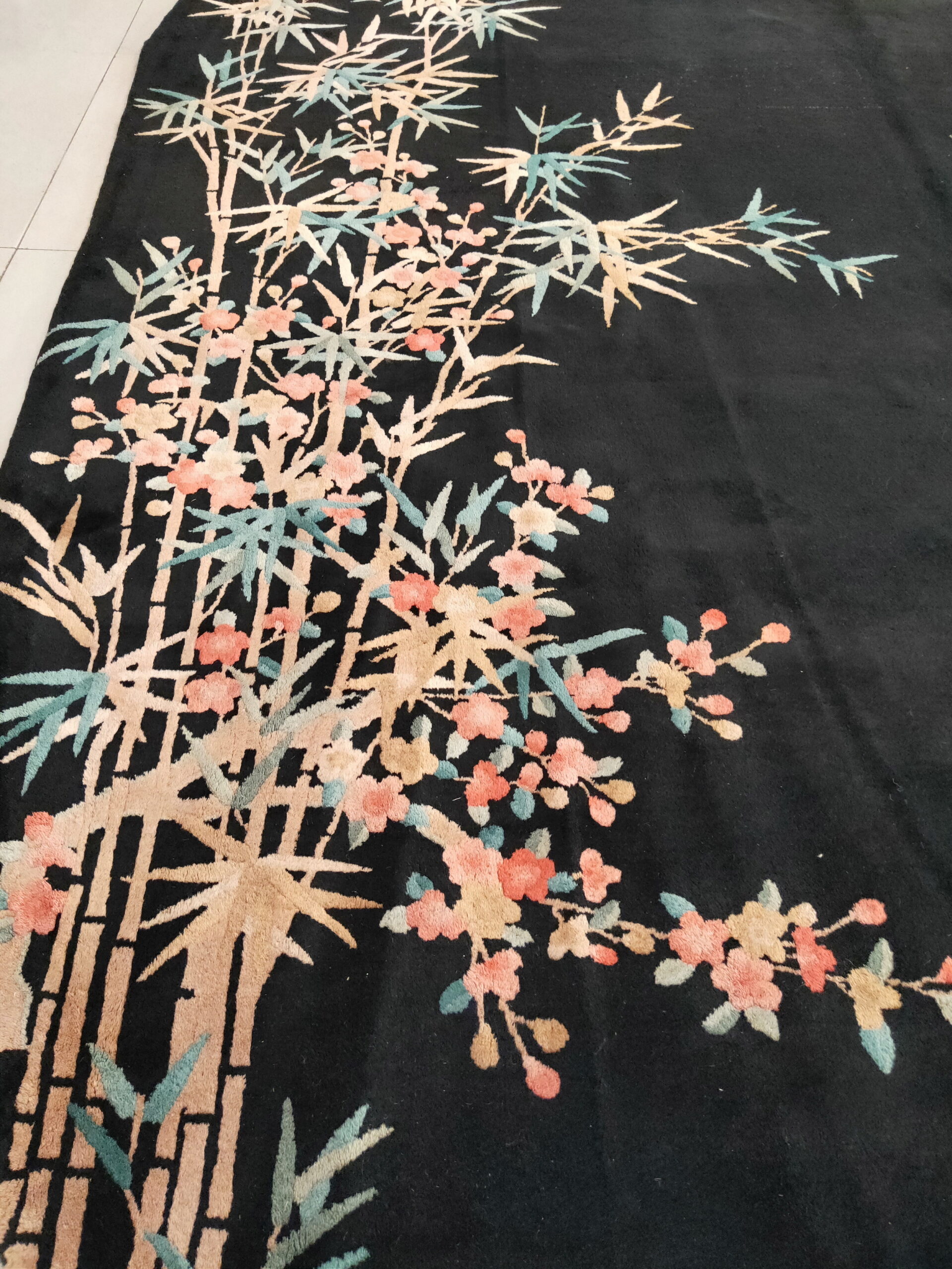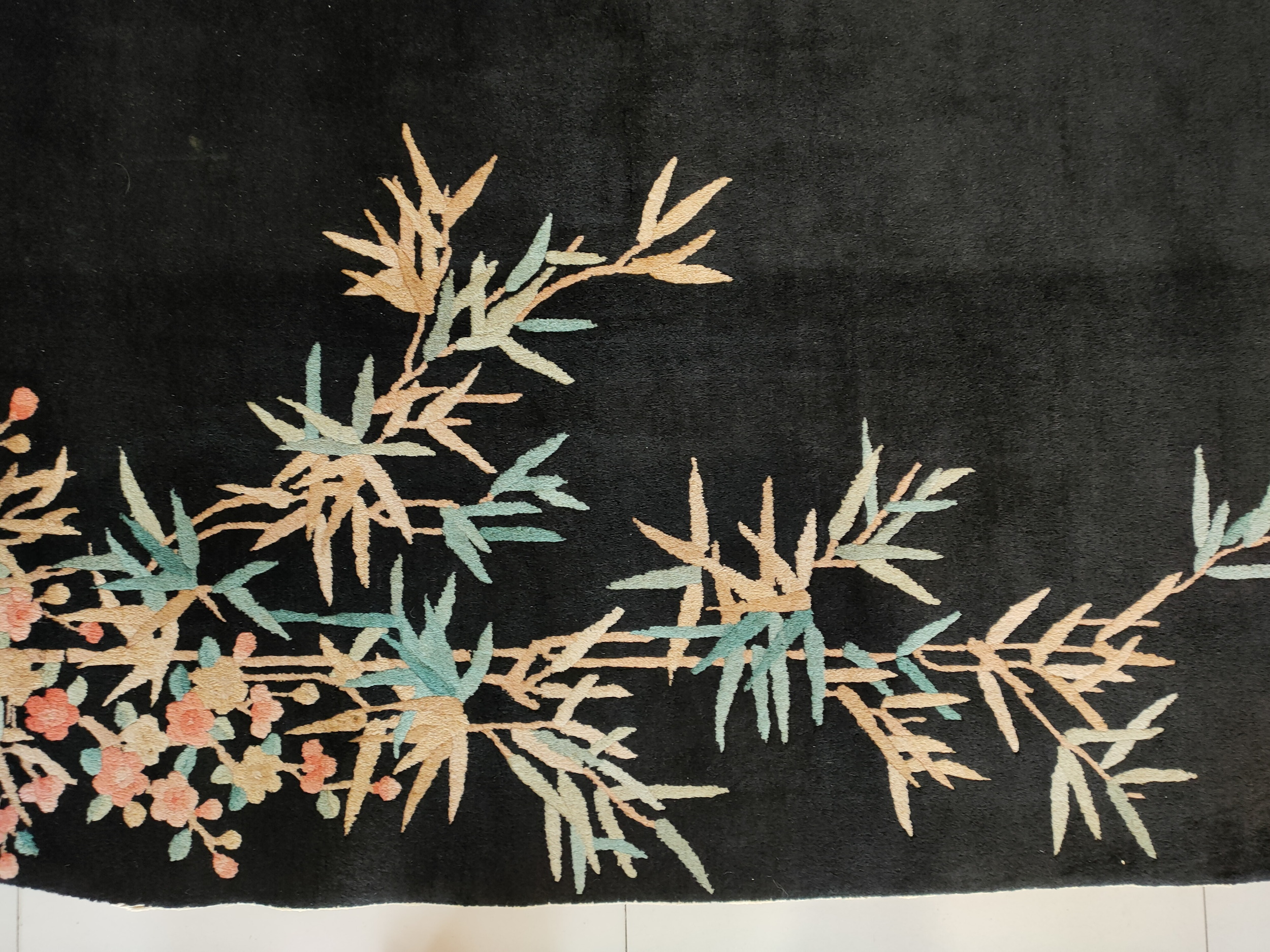 The dramatic, deep pile is rendered in a saturated, velvety black, providing a stunning contrast to the delicate botanical elements. This use of a stark field color was revolutionary for the time, emphasizing the graphic quality inherent in the Art Deco style. Such commanding black color rugs are highly sought after for their ability to anchor a contemporary or period interior with unparalleled drama.
