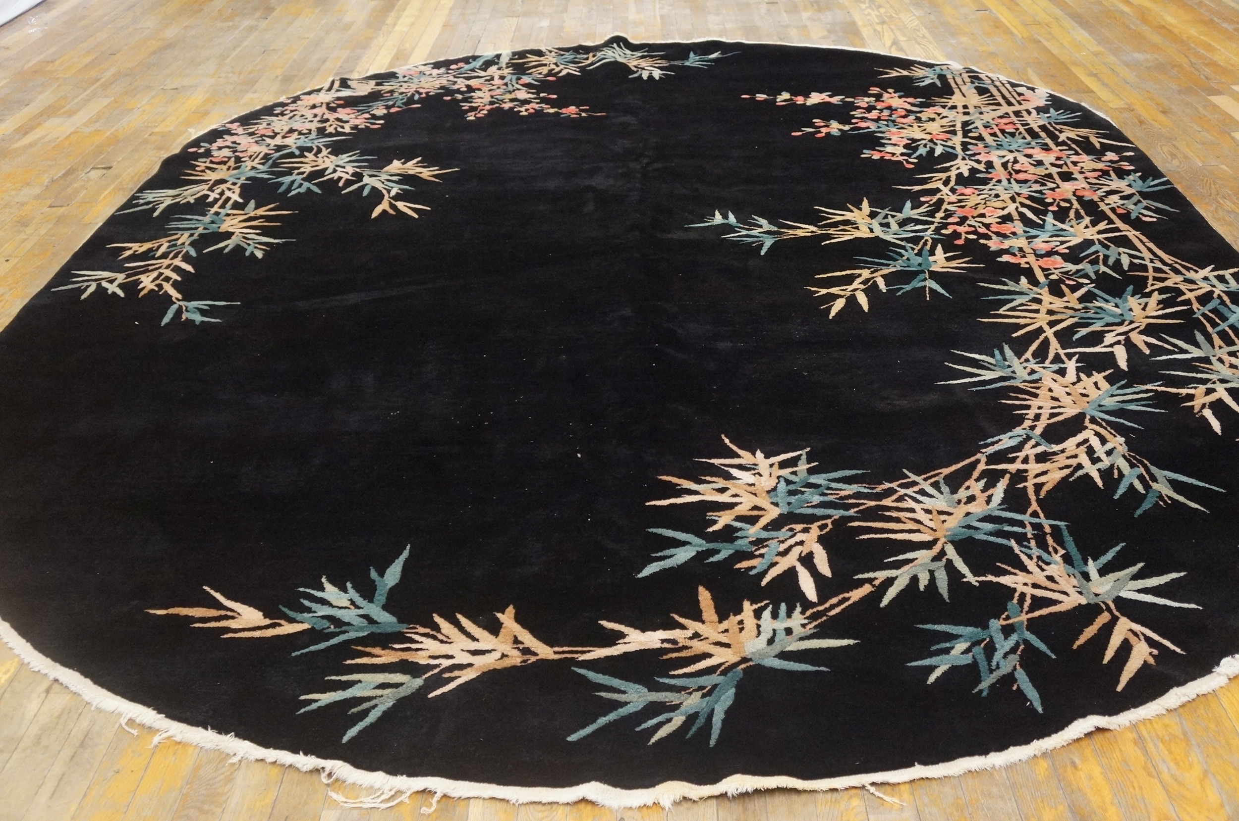Antique Chinese – Art Deco Black 1920s Rug, Circa Date: 1920s. This exceptional oval carpet represents the zenith of 1920s design, merging traditional East Asian iconography with the bold, modern aesthetic of the Art Deco movement. Its rarity and sophisticated execution place it among the most desirable antique rugs of the period.
