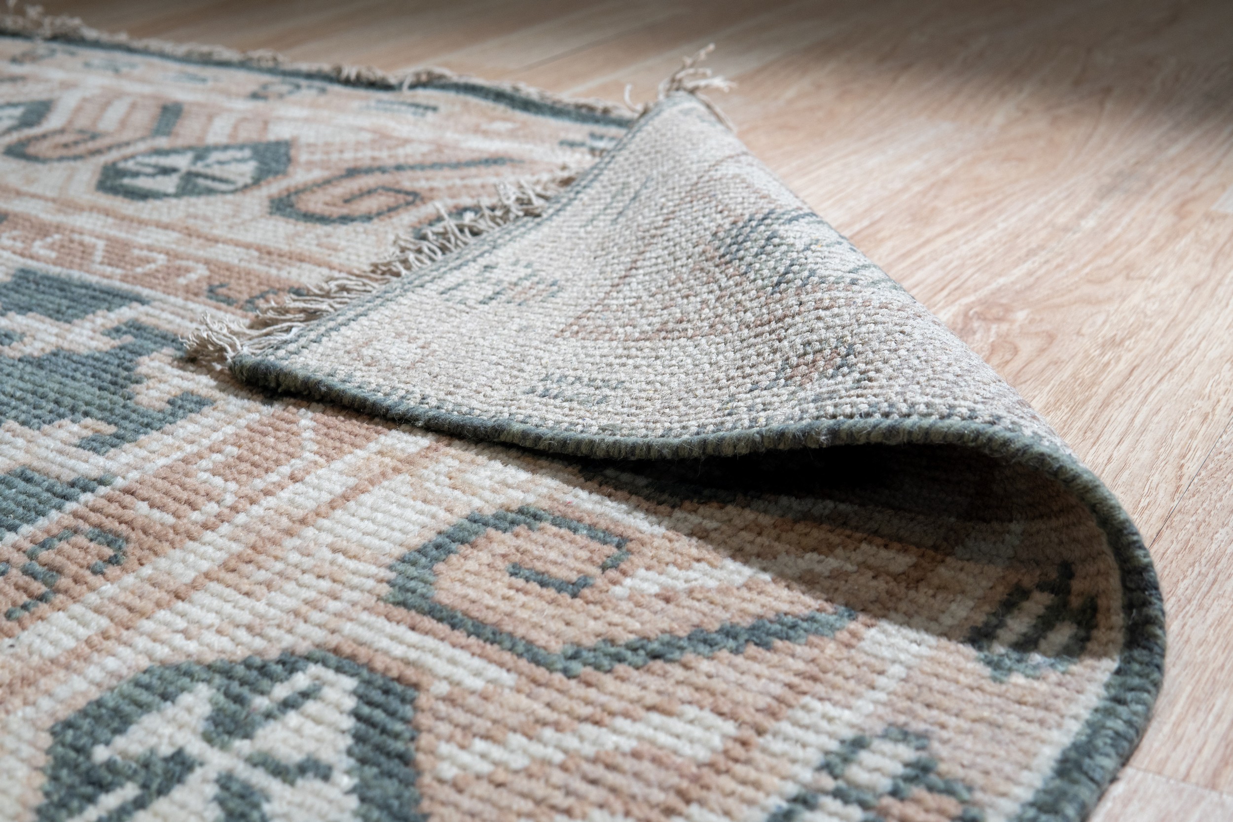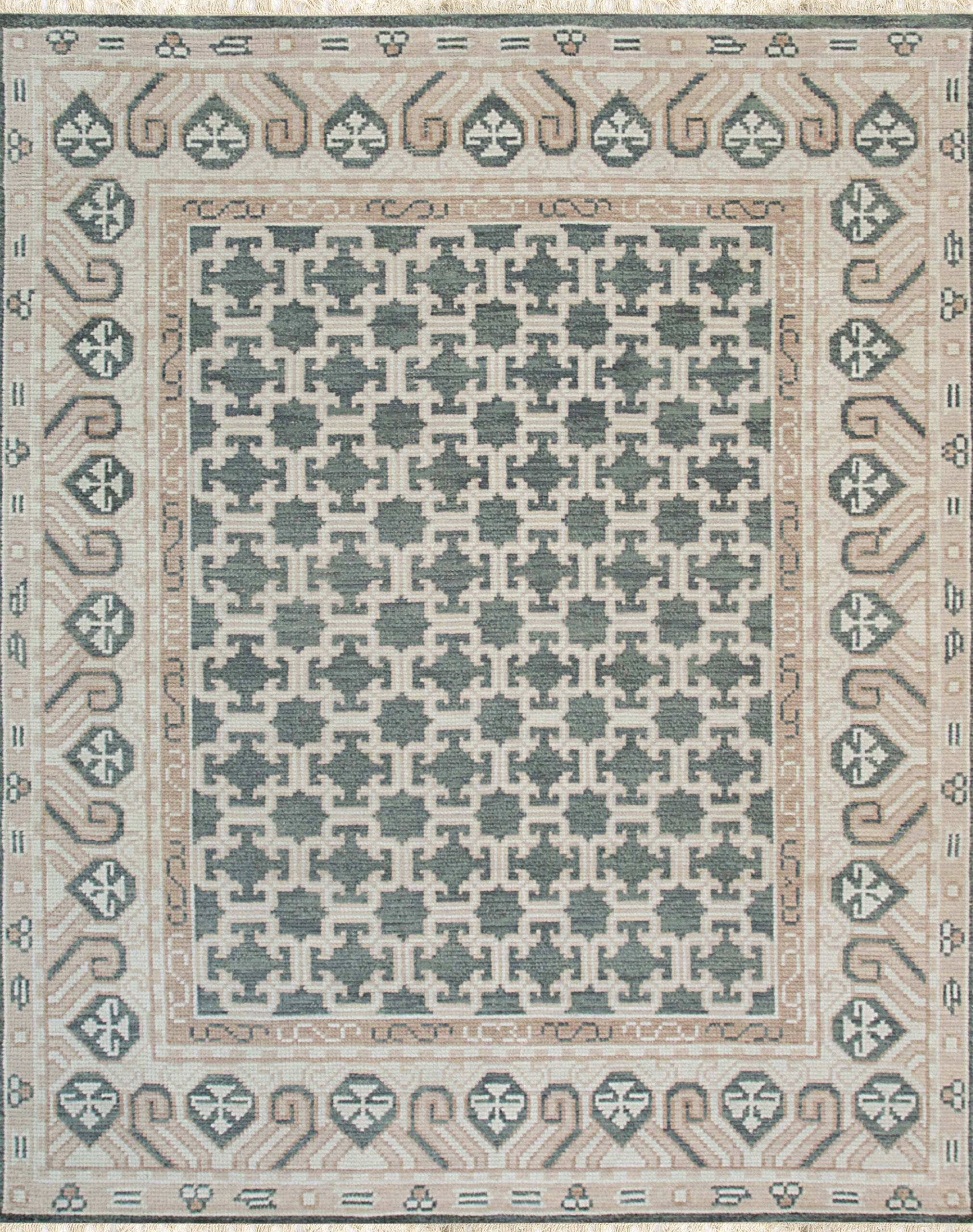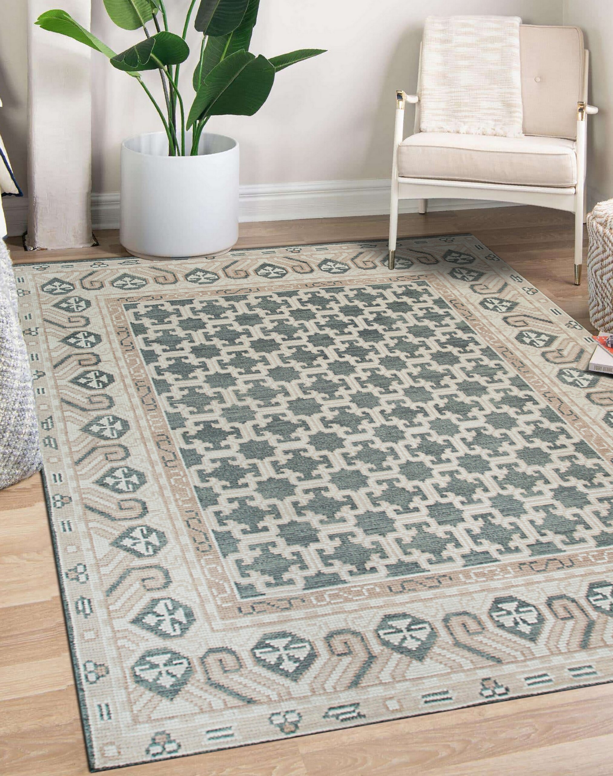 The palette is defined by a serene, muted sage or deep moss, a sophisticated tone that anchors the design. This elegant use of color ensures the piece complements both traditional and contemporary decor schemes, providing an excellent choice among our collection of green color rugs. The soft, neutral secondary tones of blush and cream delineate the sharp geometric patterning.