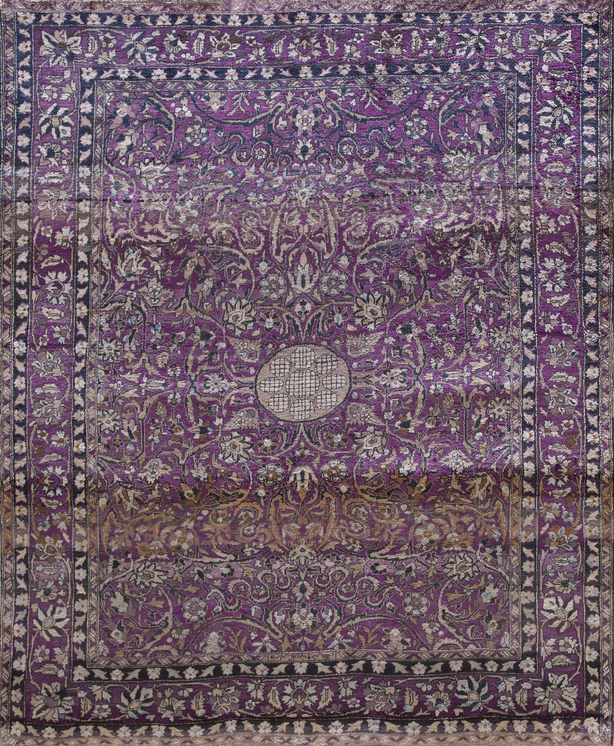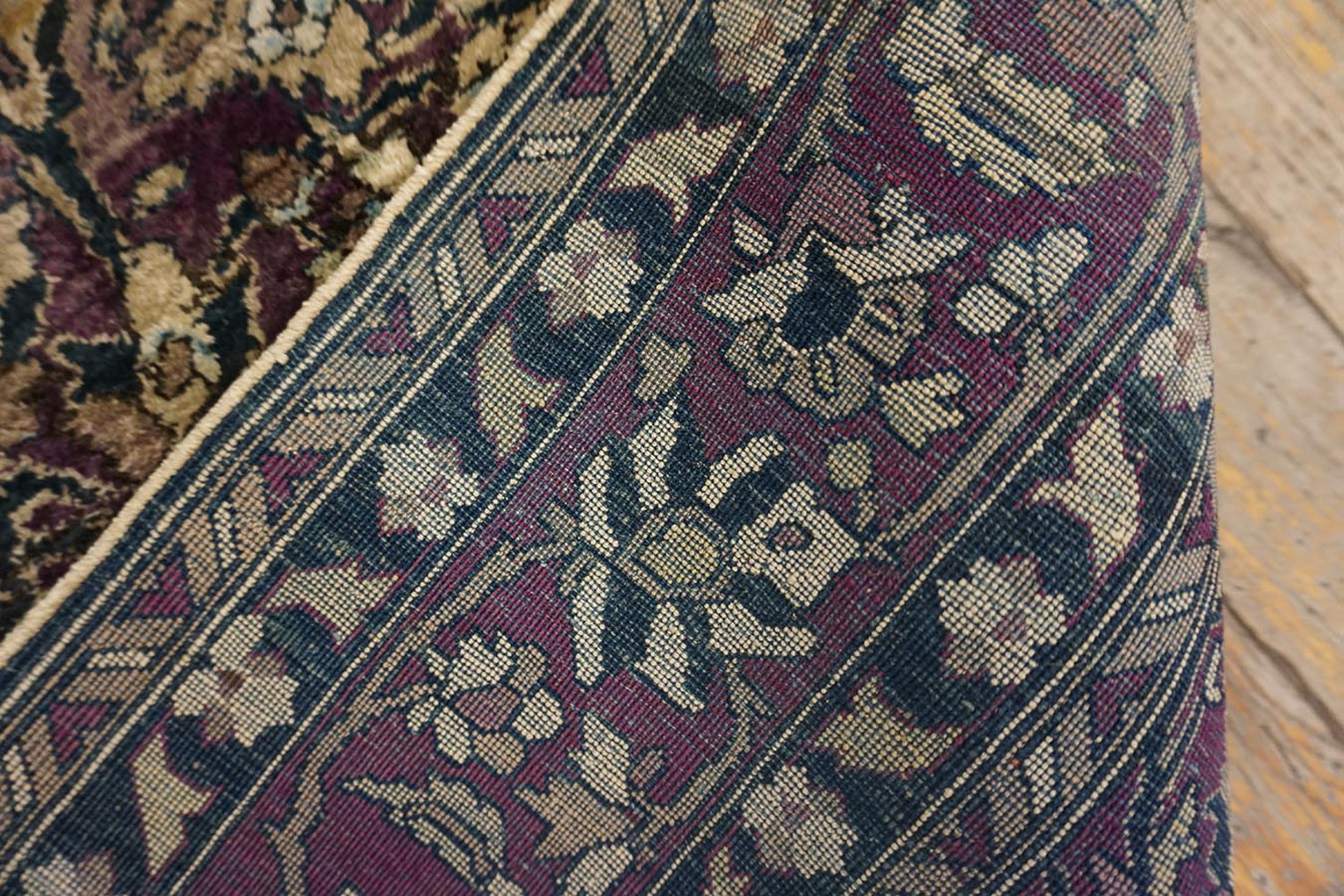 Antique Kashan – Silk Hallway Runner Purple Rug, Circa Date: 1890s. This exquisite piece, woven entirely of silk in the late 19th century, is a stunning example of Kashan rugs known for their luxurious pile and intricate design work, immediately establishing its provenance as a genuine antique rug.