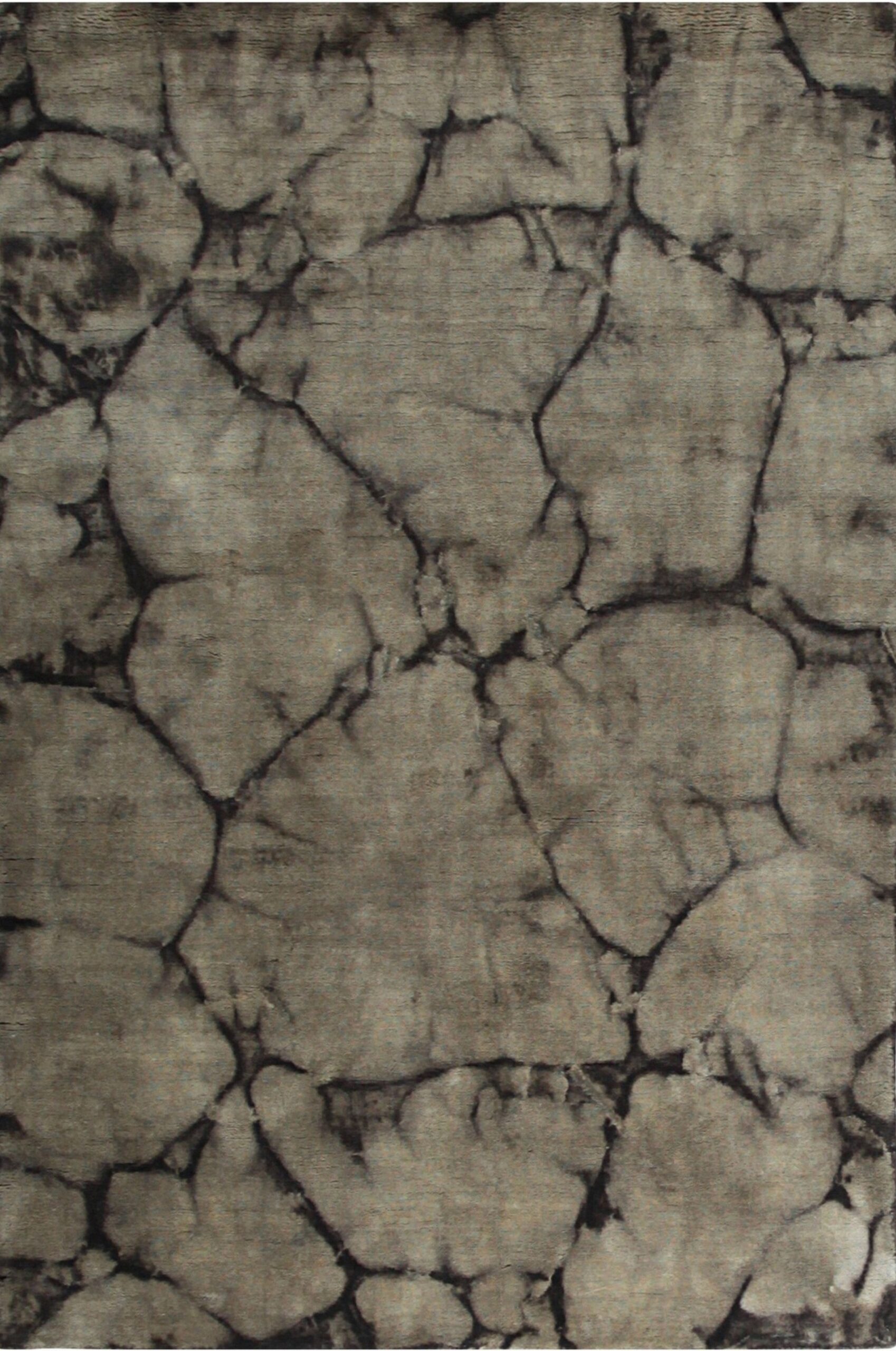 The abstract composition is characterized by large, irregular shapes separated by dark, crackled veins, evoking the natural beauty of geological formations or distressed marble. The pattern coverage is expansive, utilizing an immersive allover rugs design that ensures visual interest across the entire surface.