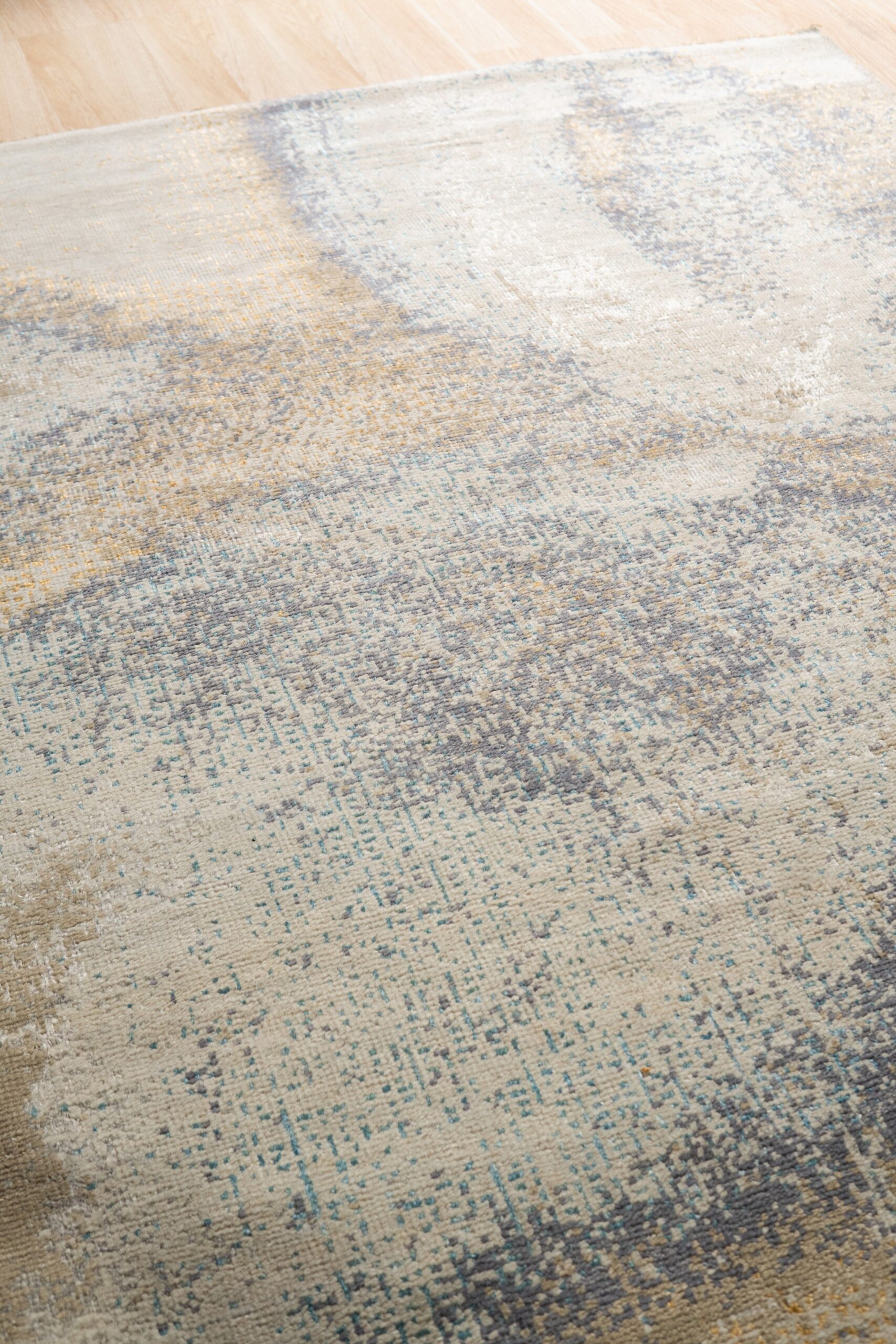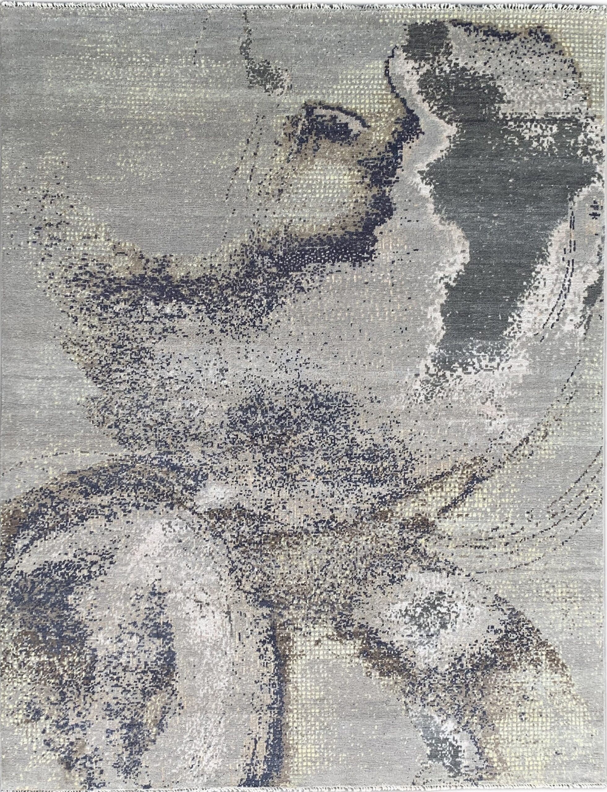 Lydia Cassandra Gray Hand Knotted Wool Rug, Country of Origin: India. This exceptional piece blends traditional hand-knotting techniques with a thoroughly contemporary design sensibility, reflecting the dynamic evolution of Indian rugs in the modern market.