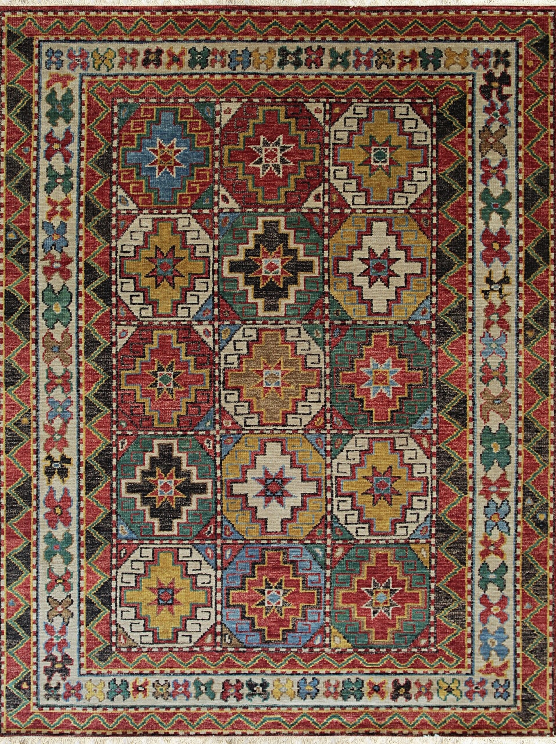 Lydia Kazak Brown Hand Knotted Wool Rug. This exceptional piece is a contemporary interpretation of the classic Caucasian Kazak style, renowned for its bold geometry and striking use of color. The field is organized into a precise grid of twelve distinct medallions, each featuring complex, stepped outlines and central star motifs. As part of our curated selection of new area rugs, this piece offers enduring traditional aesthetics combined with modern construction quality.