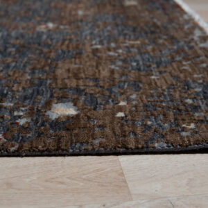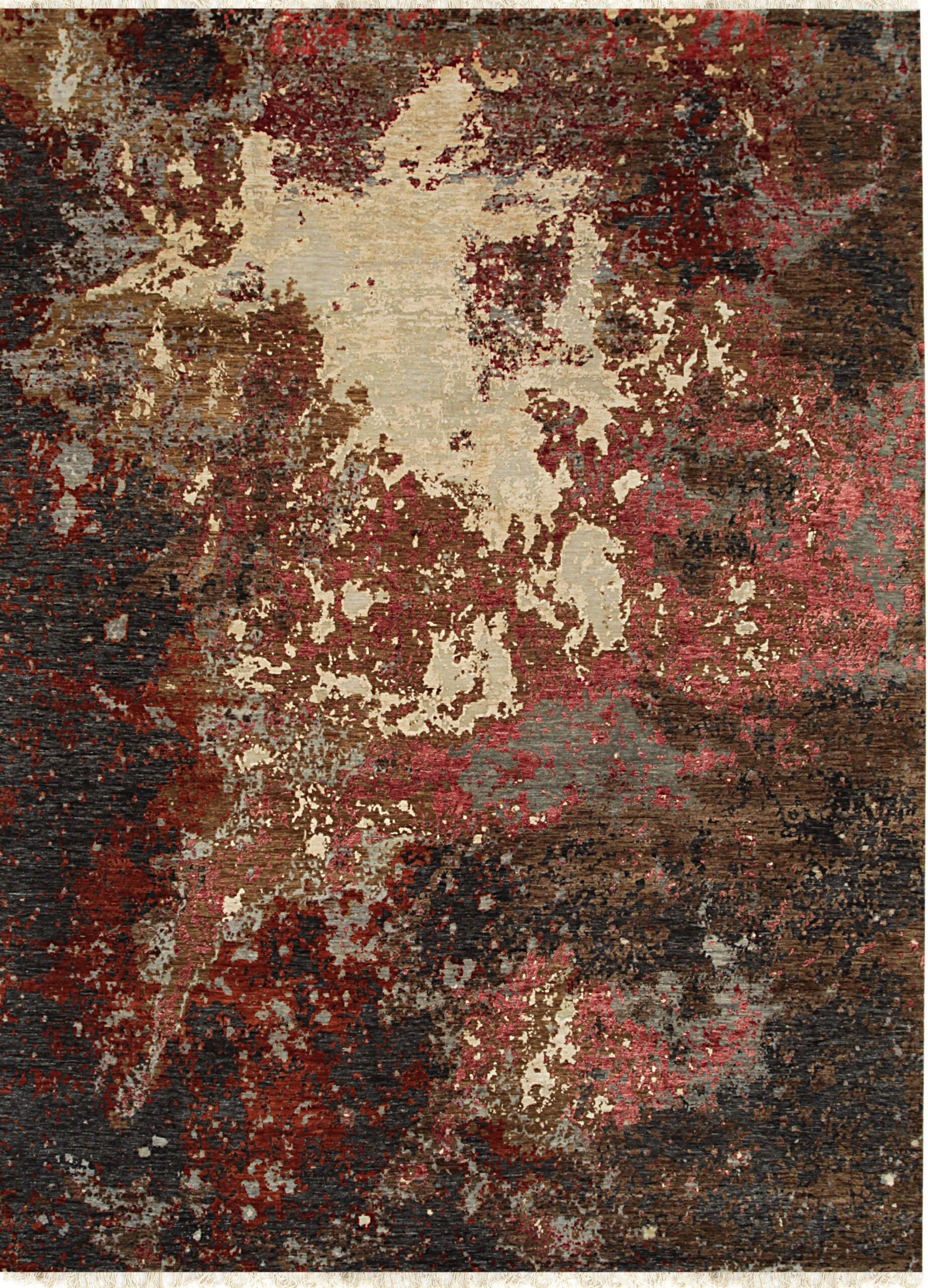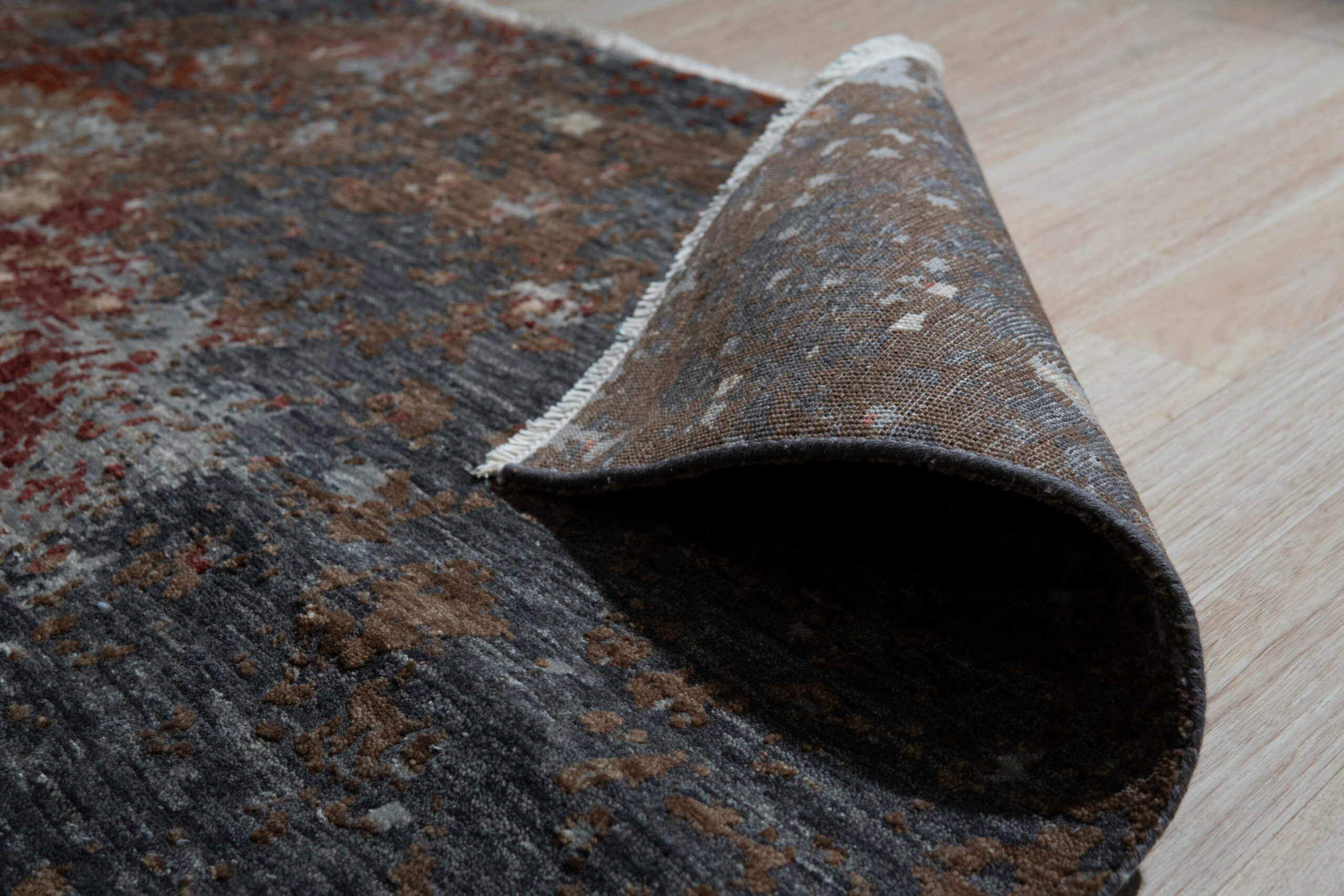 The abstract composition features a dynamic interplay of texture and hue, reminiscent of a weathered fresco or an aerial landscape. A cool base of slate gray and pale cream is dramatically interrupted by rich, textural bursts of copper, terracotta, and deep mahogany. This careful balance of cool and warm tones allows the rug to integrate seamlessly into environments favoring brown earth tone color rugs while retaining a distinctly contemporary edge.