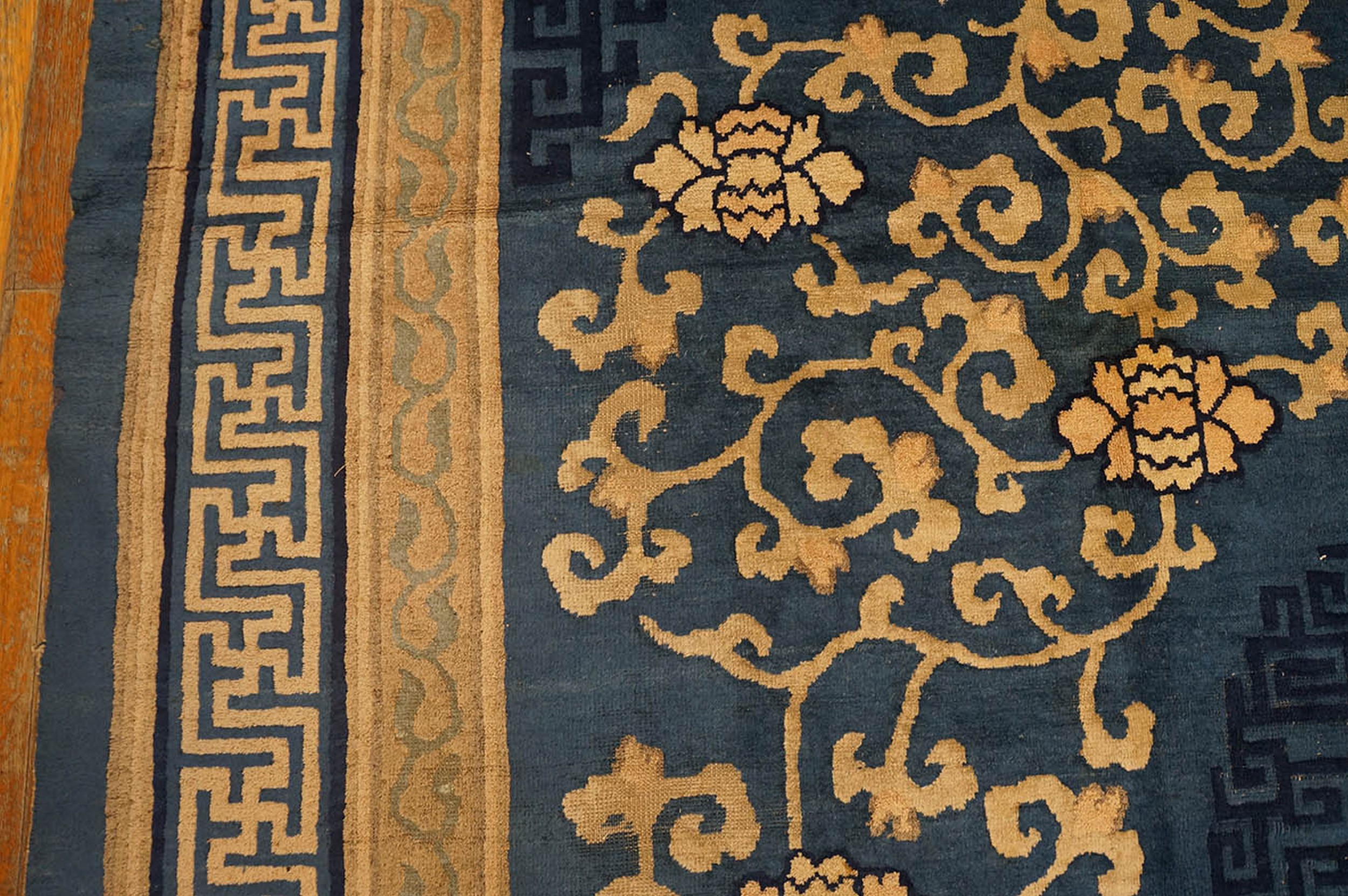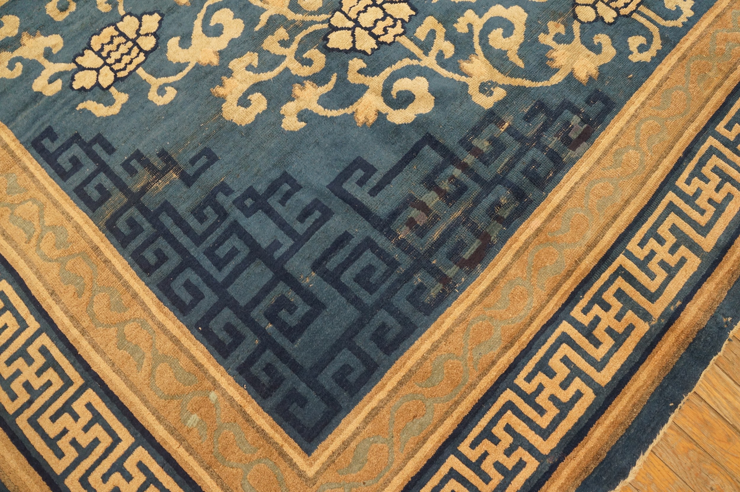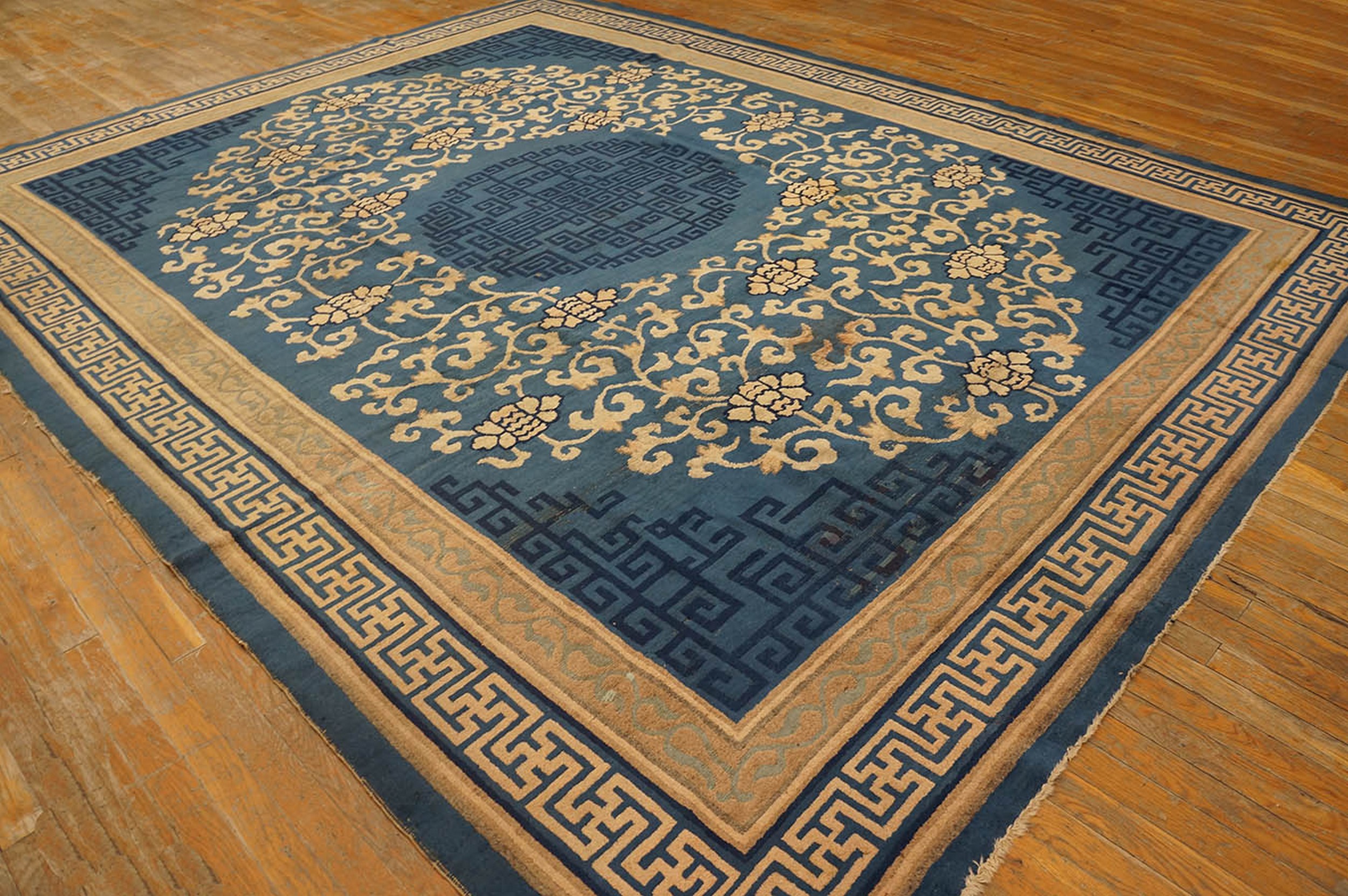 Antique Peking Chinese Medallion Blue 1900s Blue Rug, Circa Date: 1900s. This exemplary Peking rug, woven during the early 20th century, showcases the refined aesthetic of Chinese court weaving. The design centers on a magnificent open medallion framed by elegant scrolling vines and stylized blossoms, characteristic of the era’s departure from highly dense patterns. This piece represents a superb example of antique rugs from the period.