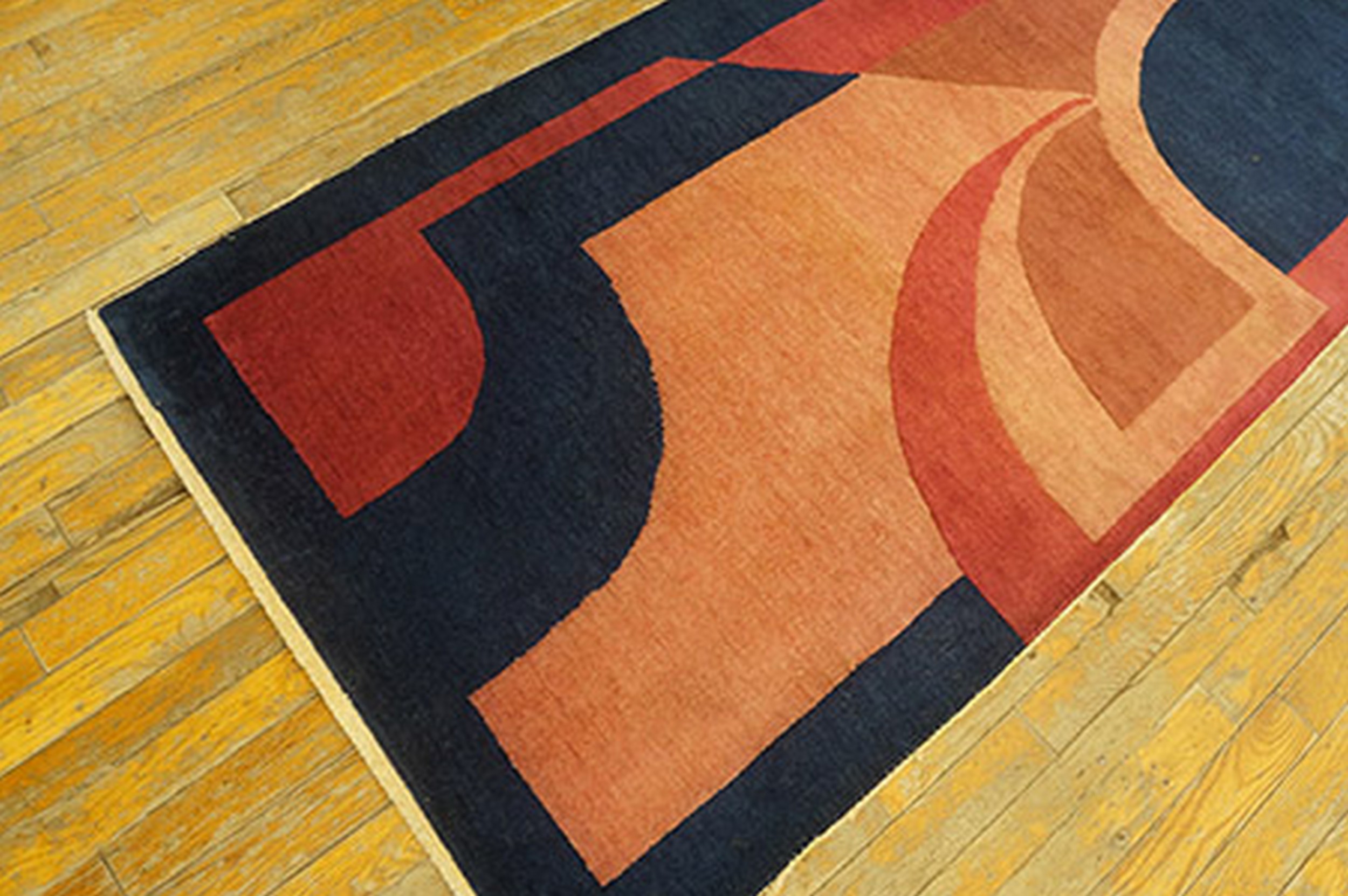Woven in high-quality wool, the palette is both sophisticated and dramatic. Deep indigo fields contrast sharply with layers of rich magenta, berry, and softer blush tones. The overall effect is a striking blend of hues, classifying this textile among the most desirable multicolor jewel tone rugs of the Art Deco era.