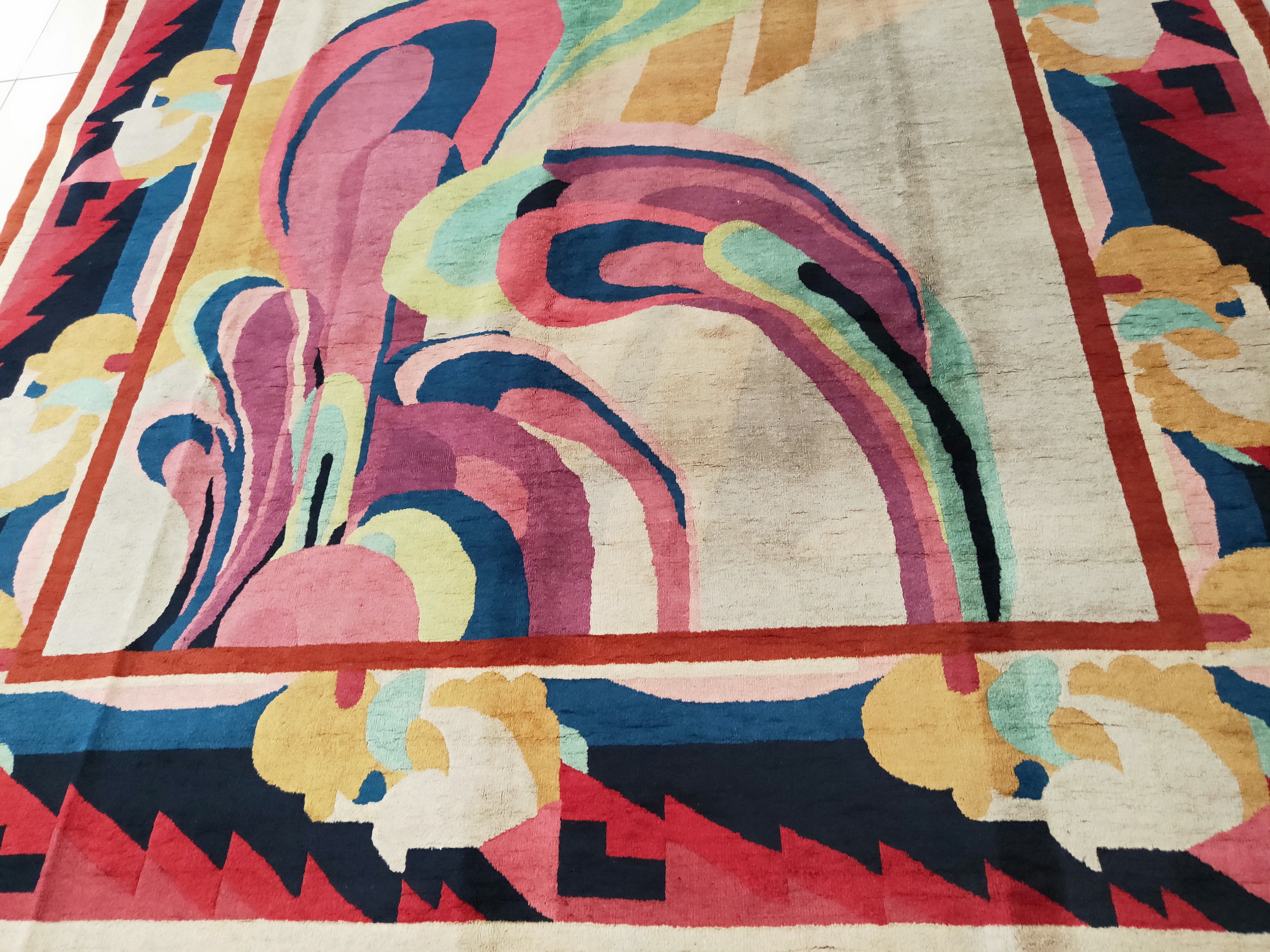The expansive central field utilizes a luminous shade of ivory, providing a sophisticated counterpoint to the intense saturation of the primary motifs. A dramatic, sweeping design dominates the center, rendered in vibrant magenta, deep cobalt, and soft aqua curves that suggest stylized waves or abstract botanicals, showcasing the era’s departure from strict pictorial representation.