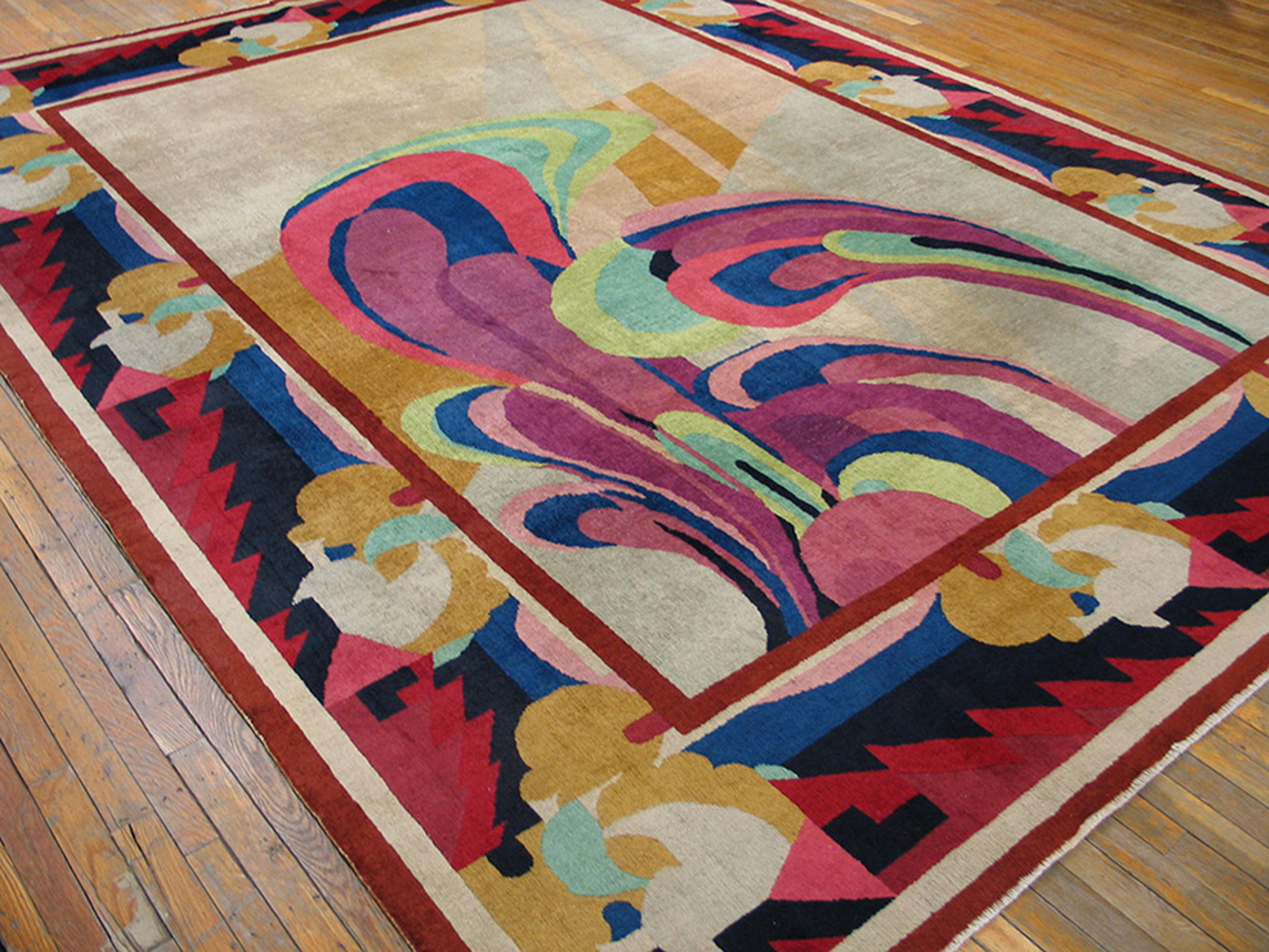 Antique Chinese – Art Deco Chinese Ivory 1930s Rug, Circa Date: 1930s. This exceptional piece represents the pinnacle of the Art Deco movement as interpreted by master weavers in China during the early 20th century. The dynamic composition and bold use of color distinguish it instantly among antique rugs of the period, offering a sophisticated blend of traditional Chinese craftsmanship and Western modernism.