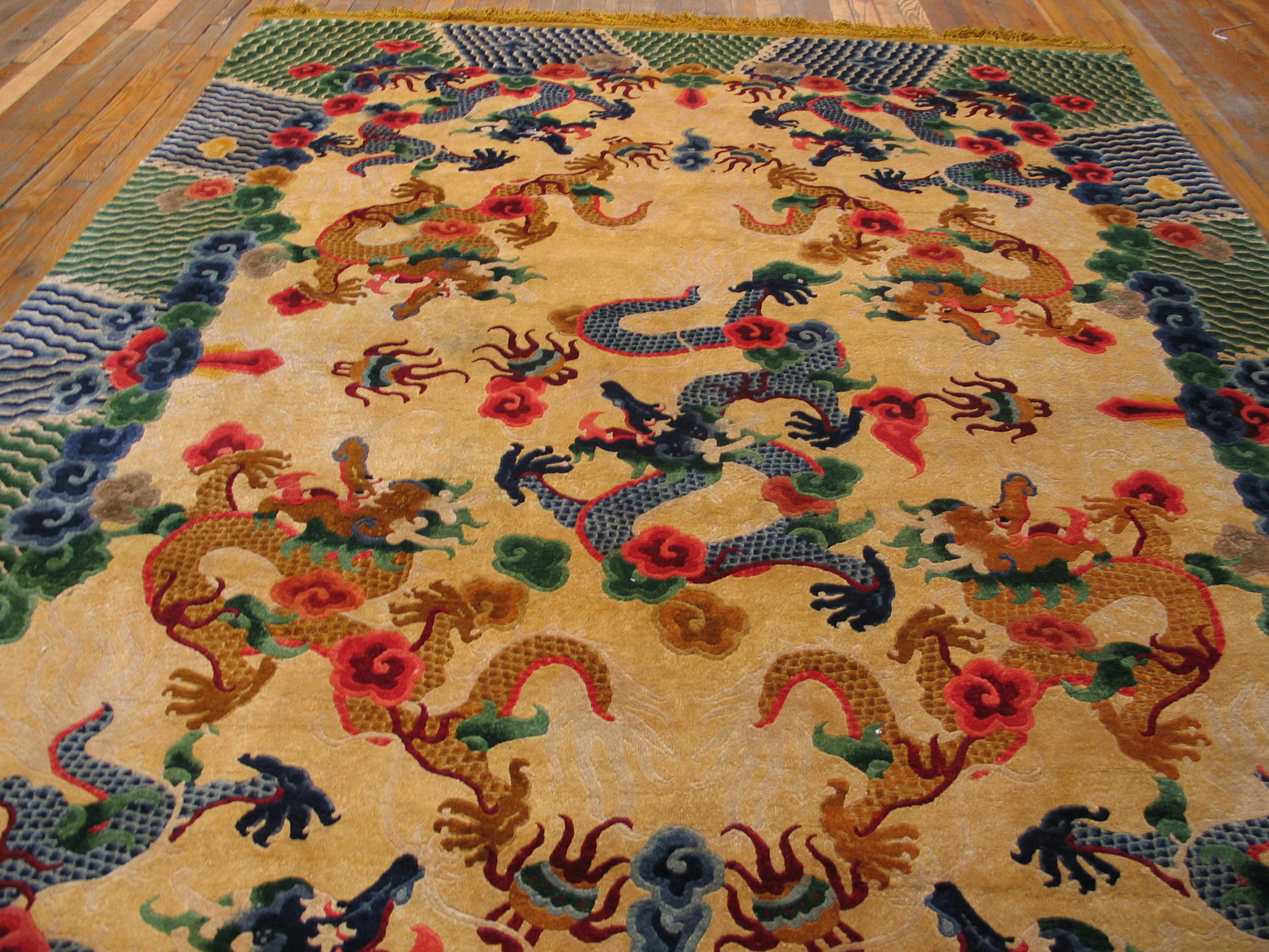 Antique Chinese – Silk Chinese Knotted Rug, Circa Date: 1920s. This exceptional example of Chinese weaving is a testament to the enduring tradition of high-quality antique rugs. The design, executed in lustrous silk, features a highly symbolic arrangement of imperial motifs, reflecting the highest standards of the craft.