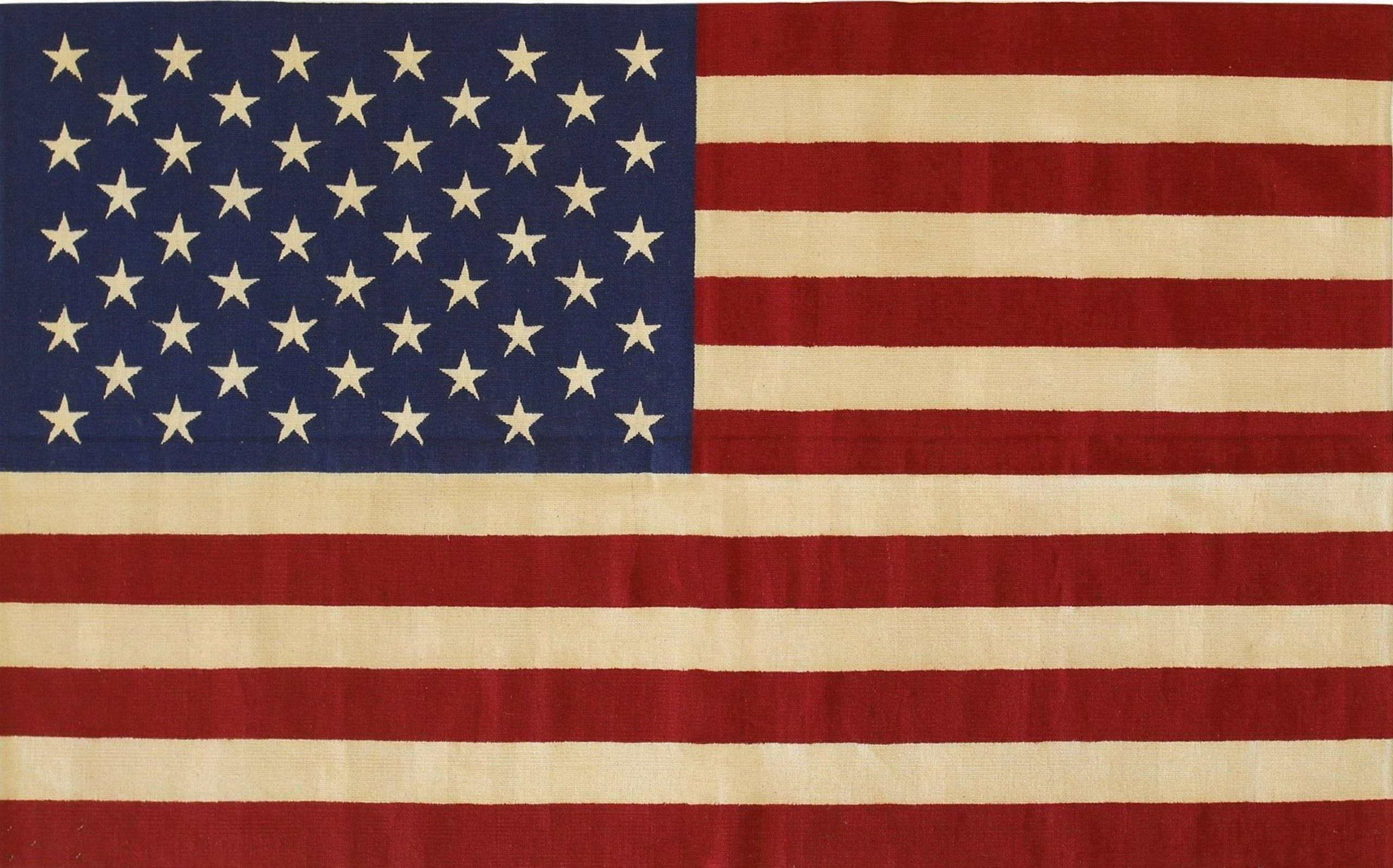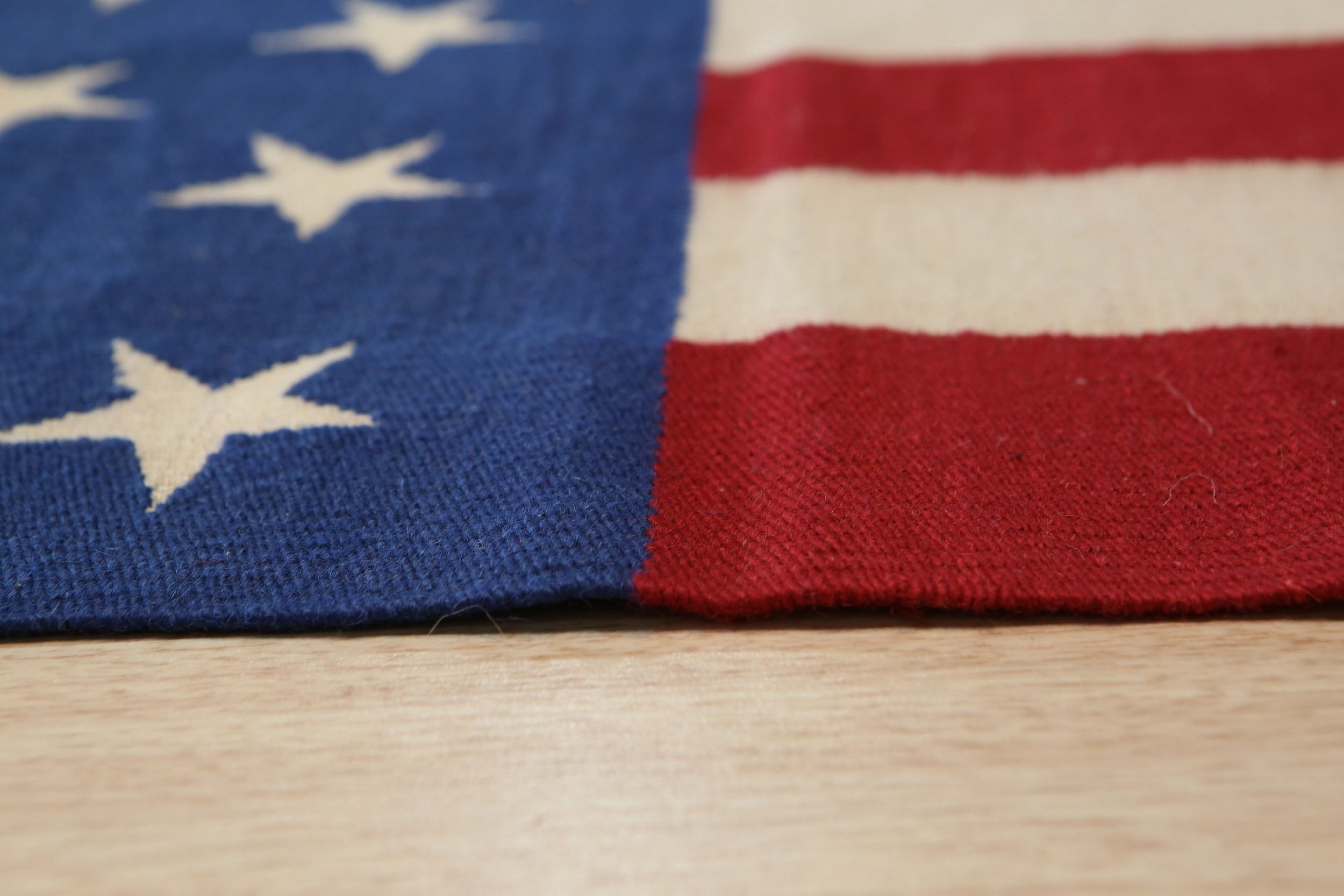 Maya Dazzling Usa Flatweave Wool Rug, Country of Origin: China. This striking flatweave piece offers a bold, graphic interpretation of a classic American motif. Hand-woven with meticulous care, the rug features crisp lines and a powerful design, showcasing the versatility and technical skill often found in contemporary Chinese rugs.