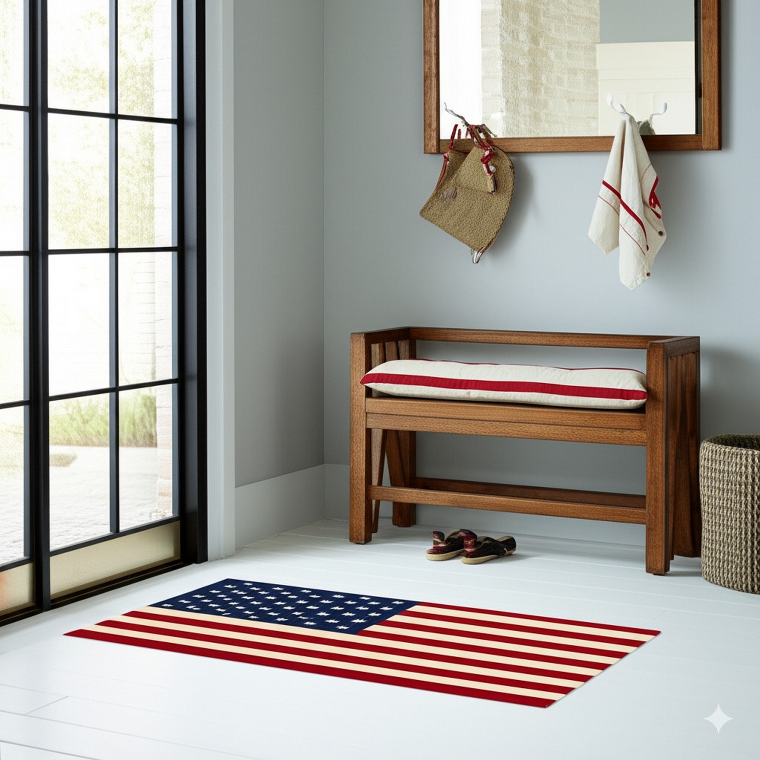 The compelling visual impact is achieved through a carefully balanced, patriotic color scheme. The deep navy field contrasts sharply with the cream stars, while the bold, alternating stripes utilize a rich, saturated red. This striking red tones palette provides a dramatic focal point for any room, lending an air of confident, celebratory style.