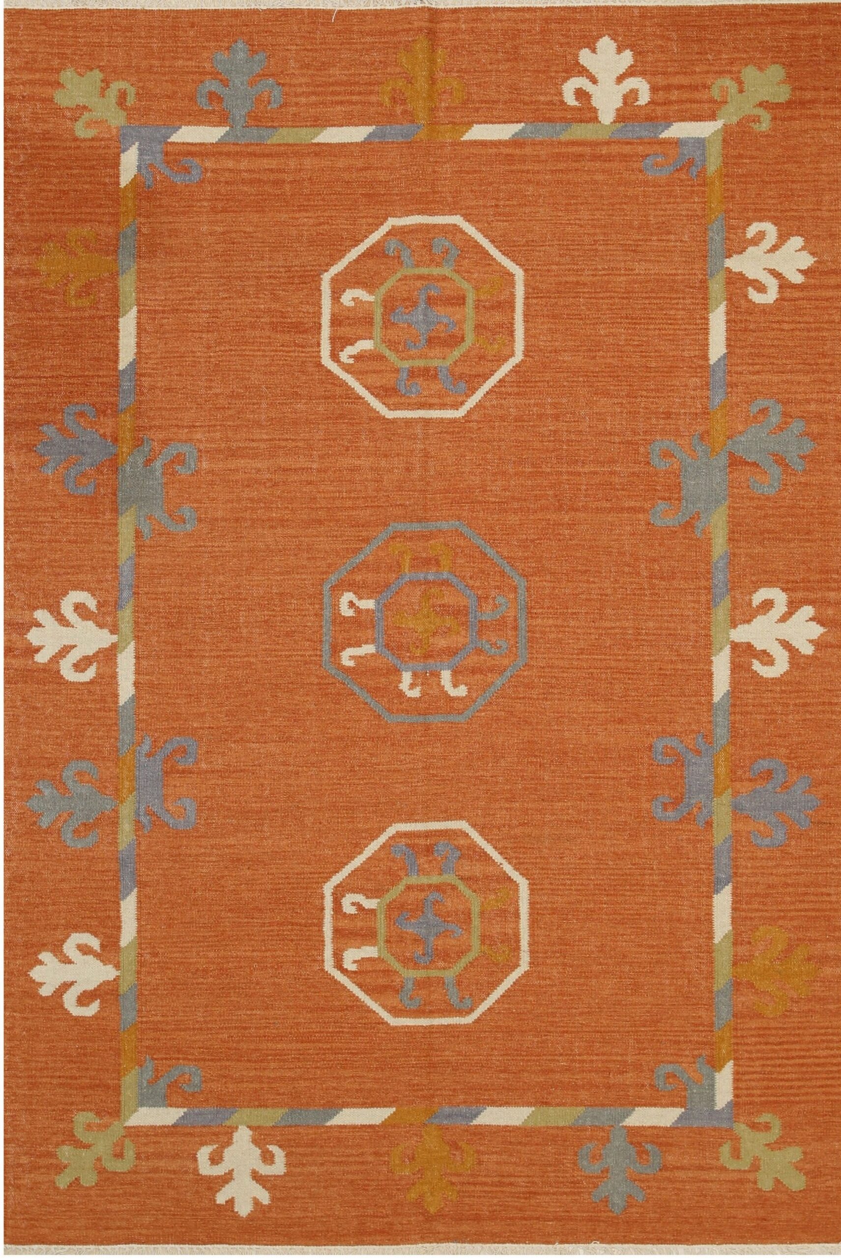 The field is punctuated by a vertical arrangement of three octagonal medallions, rendered in pale blue-gray, cream, and soft sage green. This striking palette leans toward the rich salmon coral pink color rugs spectrum, offering a sophisticated counterpoint to the more muted tones often found in traditional kilims.