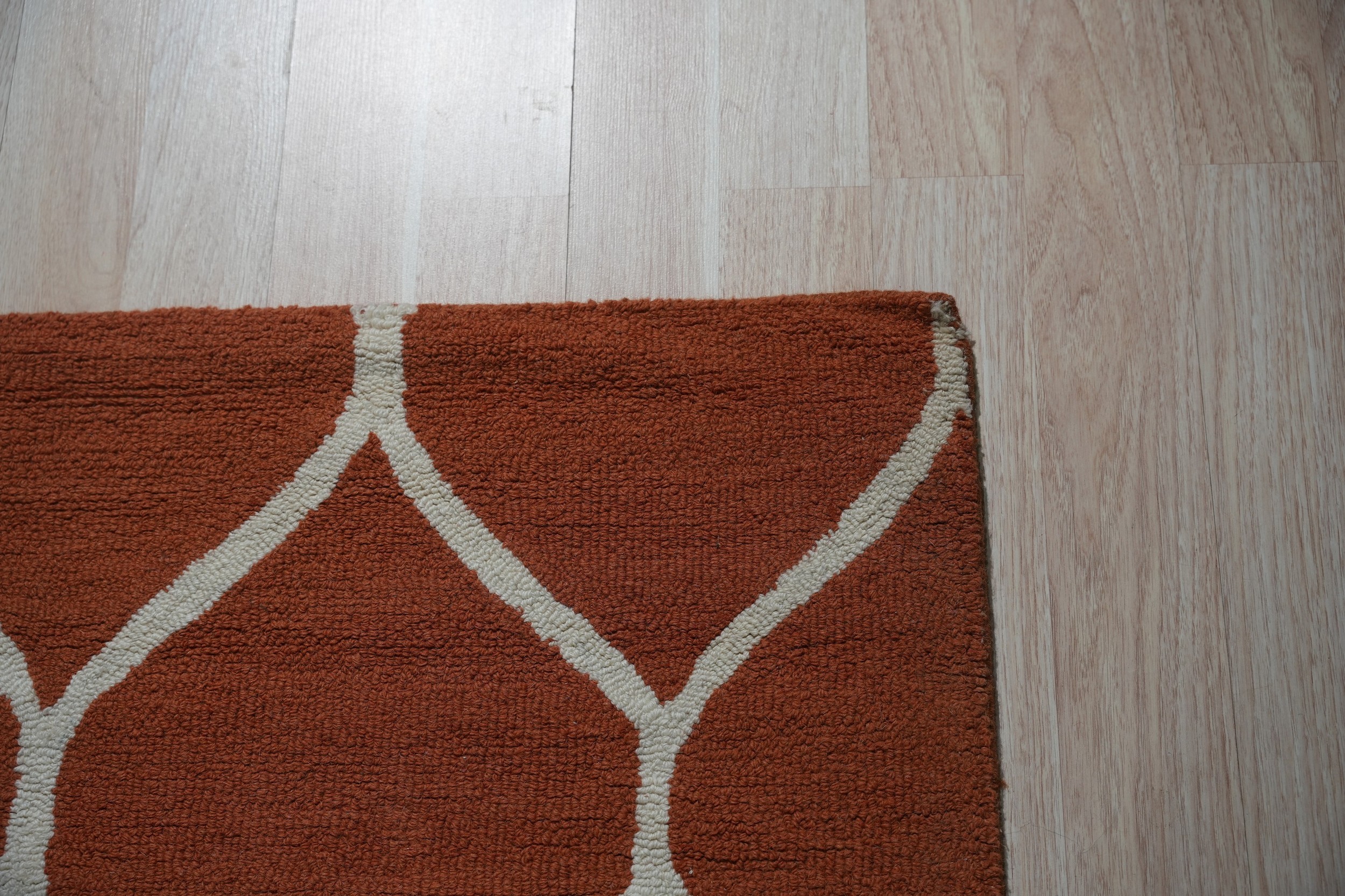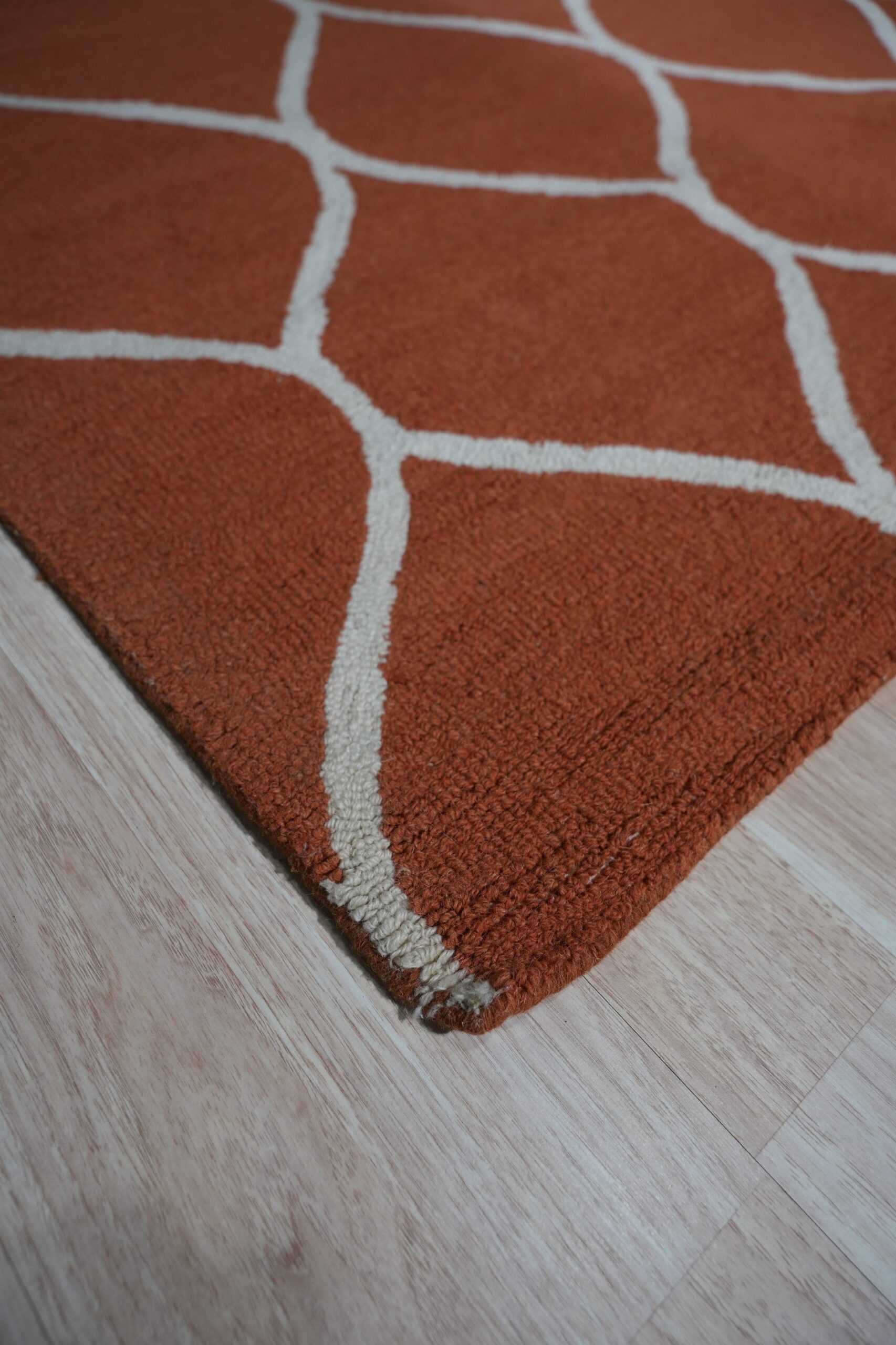 The striking geometric design features an oversized ogee trellis pattern rendered in crisp white, providing a sharp contrast against the warm, earthy field. This vibrant, rustic tone places the piece firmly within the highly sought-after category of orange color rugs, offering a sophisticated pop of color without overwhelming the surrounding d?cor.