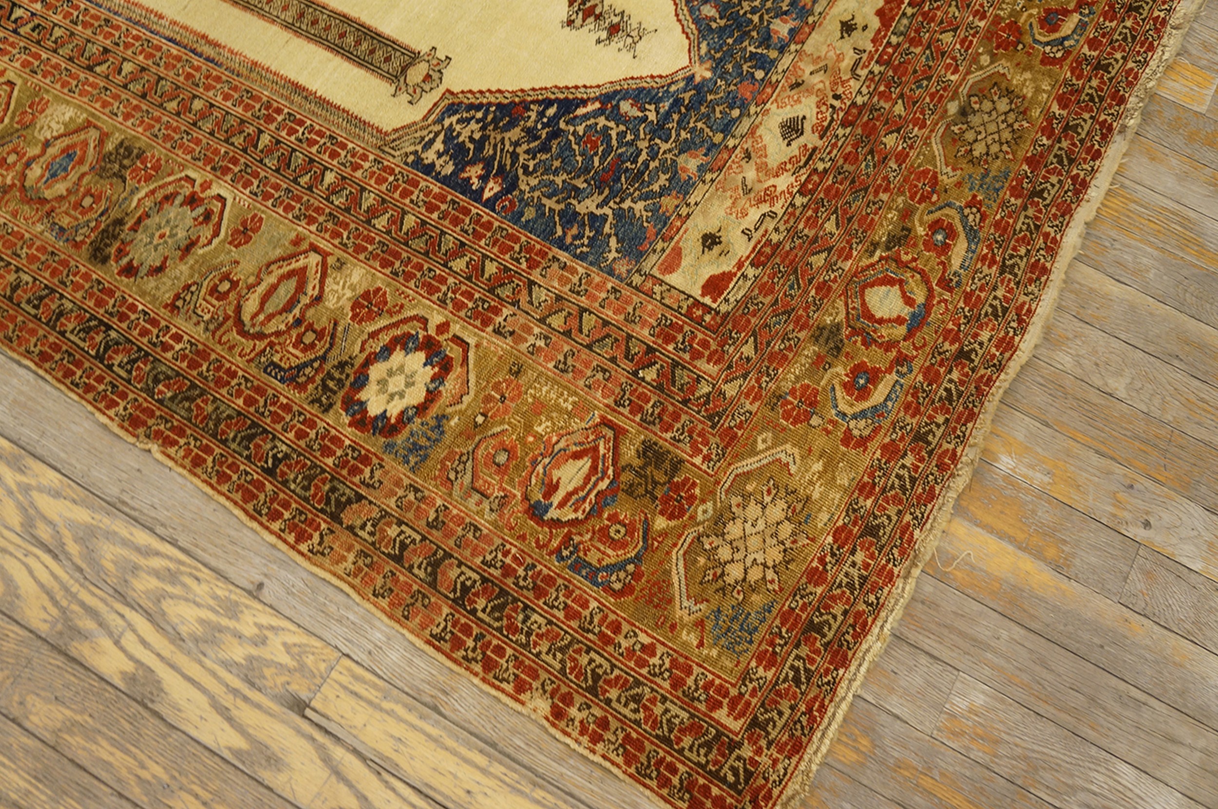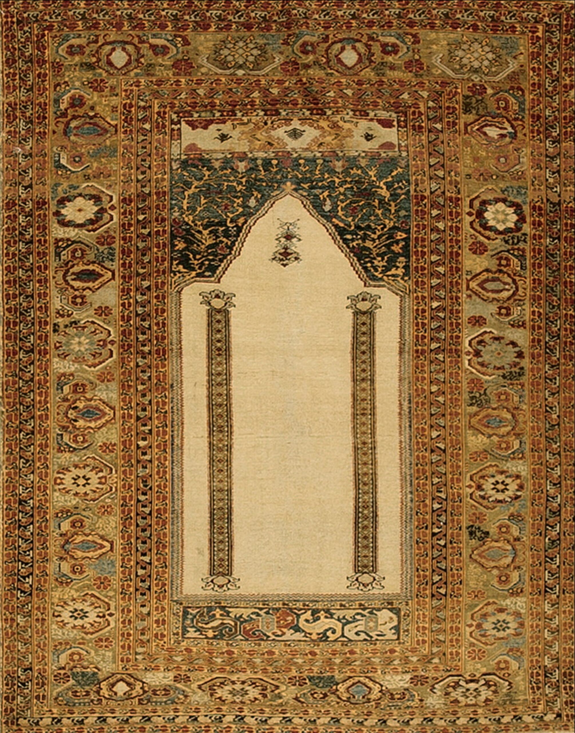The palette is refined, utilizing natural dyes that have achieved a beautiful patina over centuries. The main field of the mihrab is a luminous, uncluttered ivory field, flanked by slender columns that visually support the arch. This reserved use of color in the center highlights the dramatic complexity of the surrounding borders.