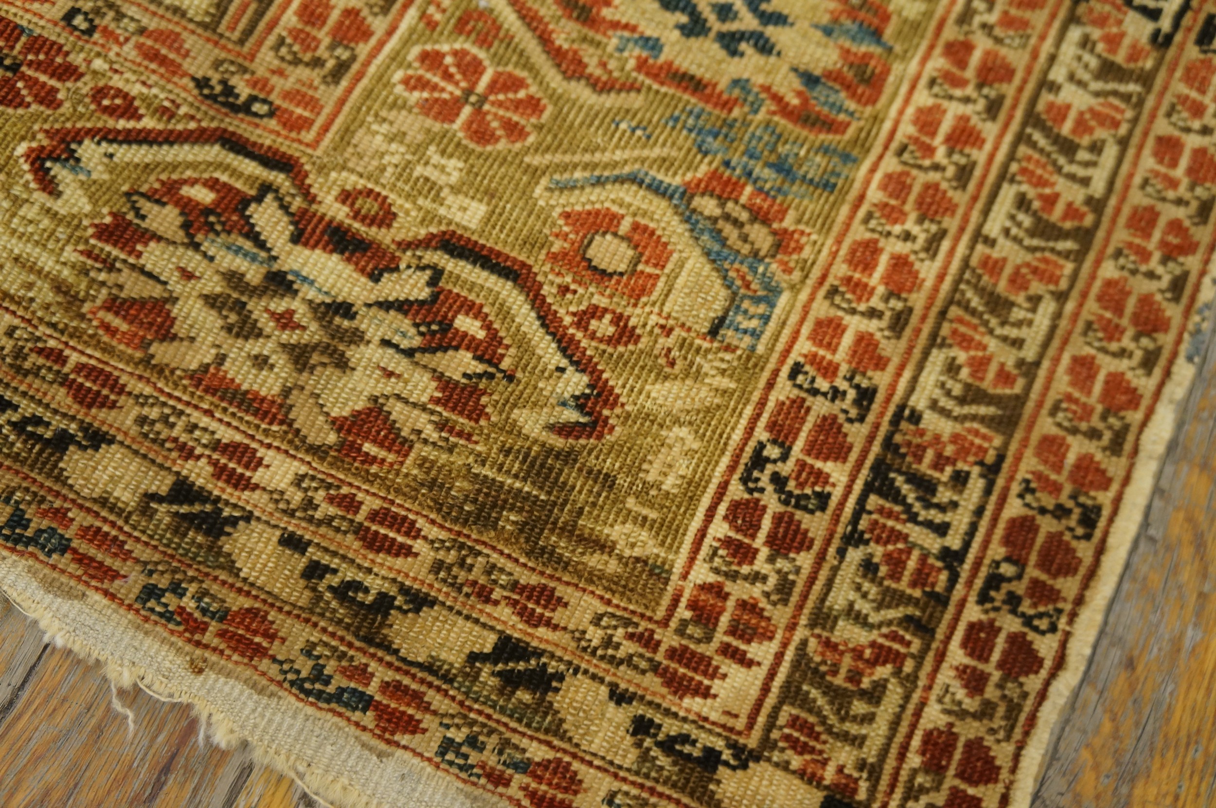 A sophisticated system of multiple guard borders frames the composition, featuring repeating geometric medallions and stylized blossoms rendered in rich terracotta, saffron, and muted blues. Given its dimensions, this piece functions perfectly as a refined accent or small scatter size piece, offering a profound statement of history and craftsmanship in any setting.