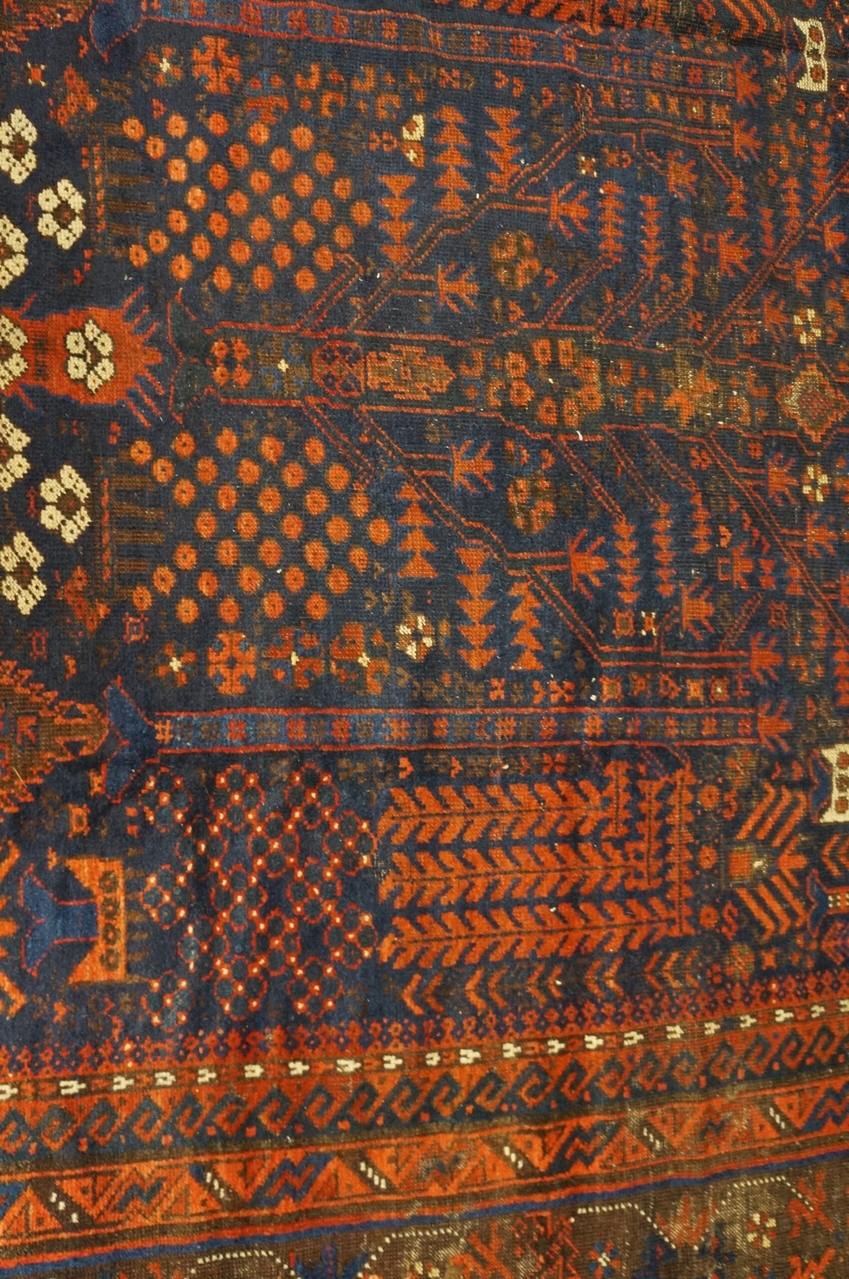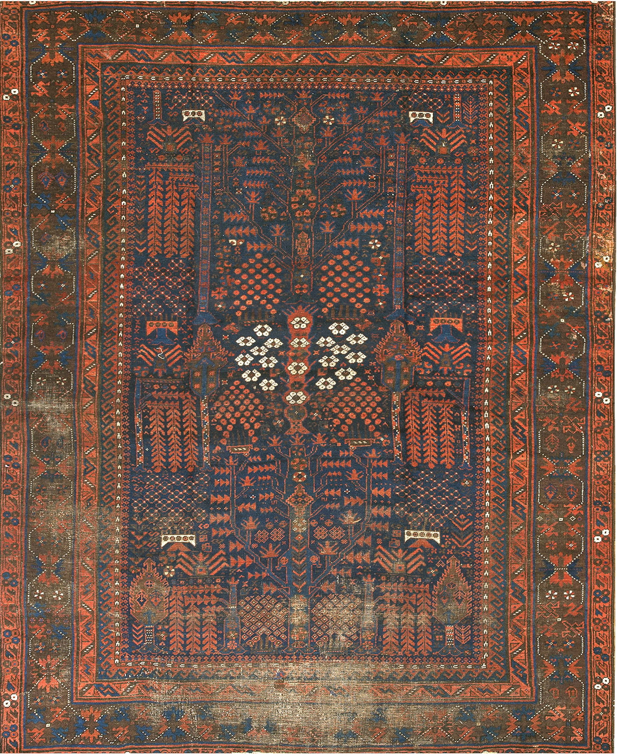 Antique Baluch Afghanistan Blue 1850s Rug, Circa Date: 1850s. This exceptional example of baluch rugs showcases the intense, saturated dyes characteristic of mid-19th century nomadic weaving. The field is dominated by a deep indigo ground, providing a striking contrast to the secondary colors of rust and terracotta.