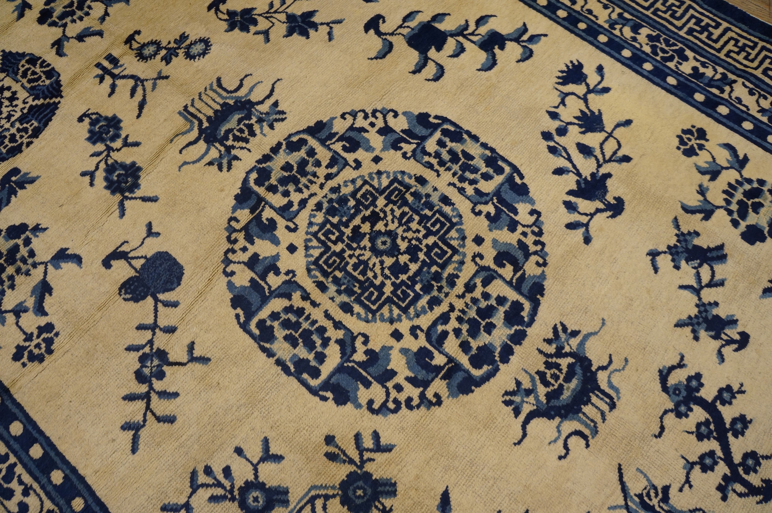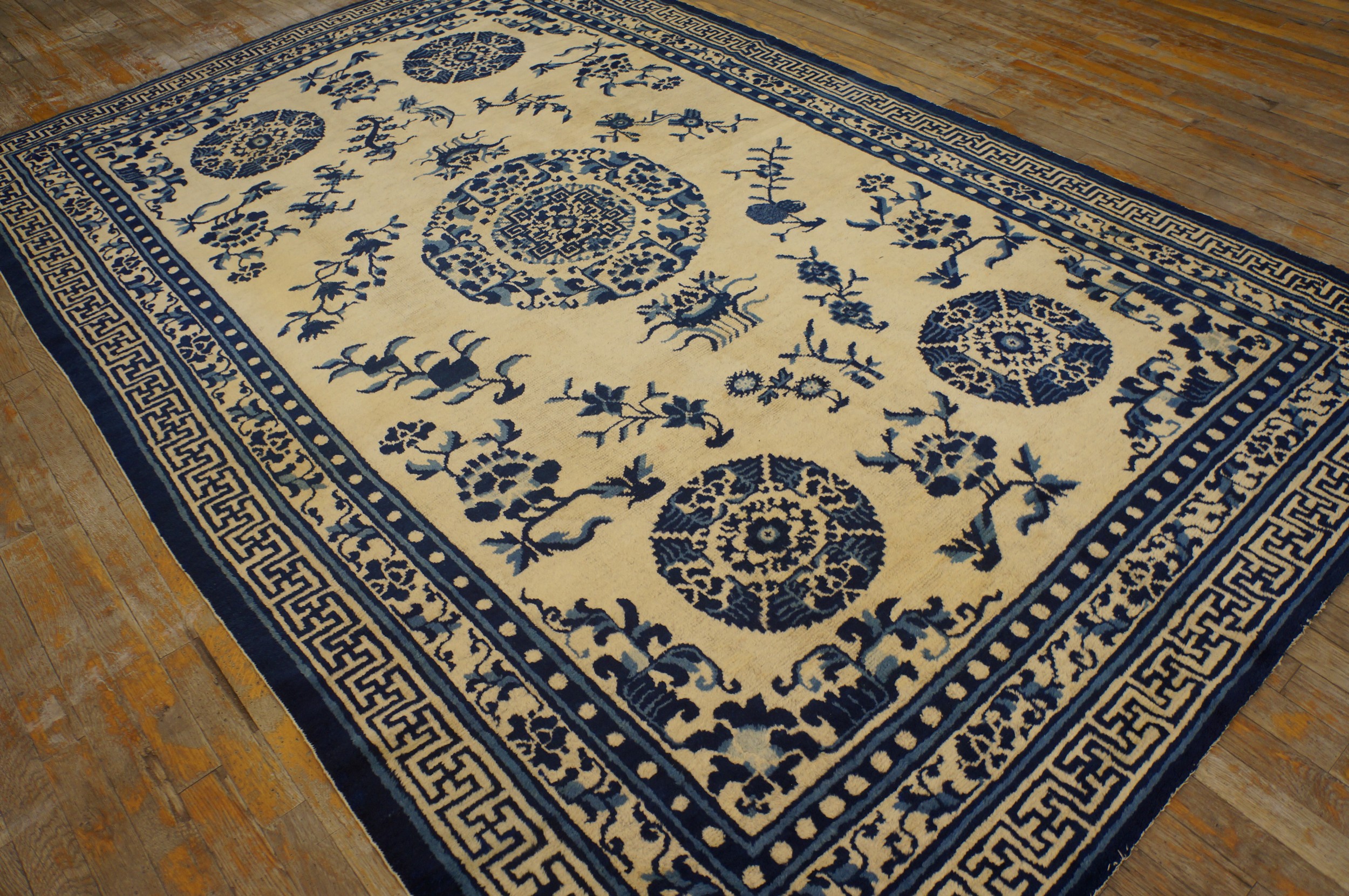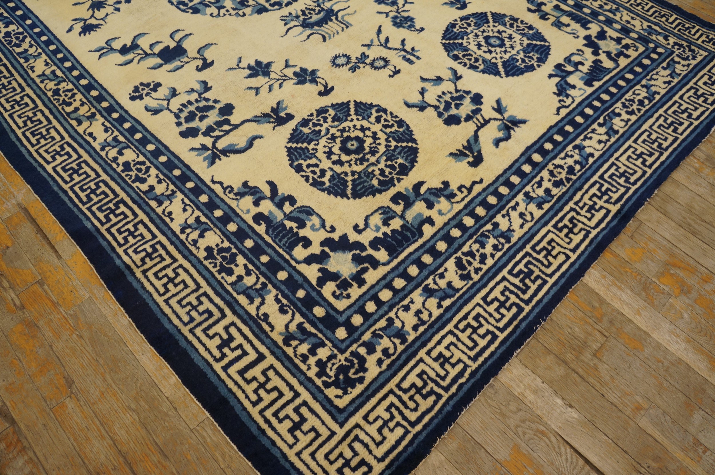 Antique Chinese – Ningxia Chinese Floral, Medallion Knotted Rug, Circa Date: 1850s. This exceptional mid-19th-century weaving from the Ningxia region exemplifies the sophisticated artistry of Imperial Chinese textiles. The striking contrast of deep cobalt blue against the luminous ivory ground creates a visual clarity rarely matched in other antique rugs.
