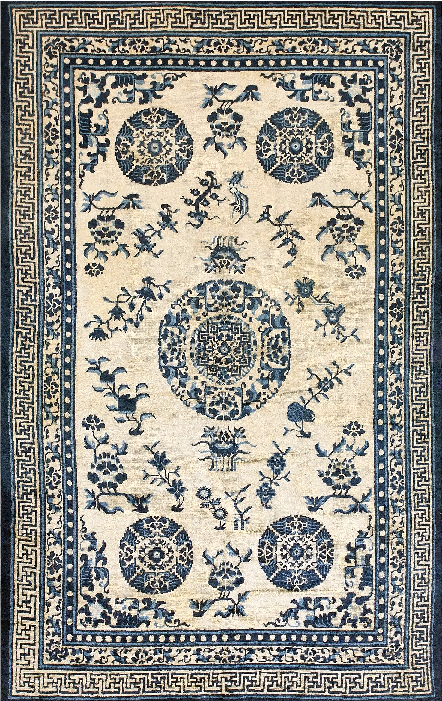 The field is densely populated with scattered floral sprays, stylized birds, and auspicious symbols, surrounding five distinct circular medallions. These complex designs are framed by a powerful, multi-layered border system featuring the classic Greek key fret, providing a structured counterpoint to the organic movement within the central panel.