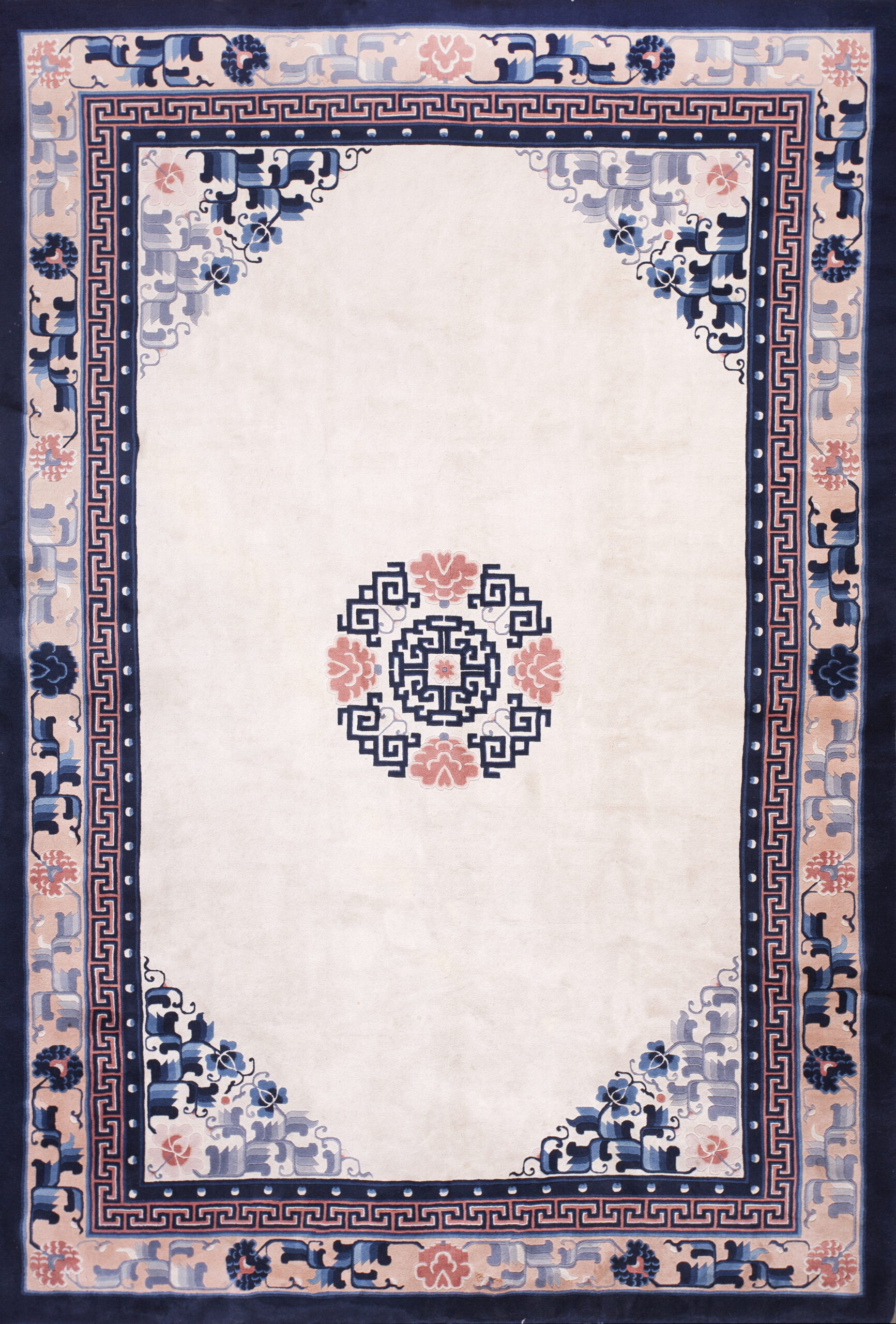 The visual anchor of the rug is the central medallion, which, along with the inner guard border, employs the classic Chinese fret motif. This precise, interlocking pattern emphasizes the formal structure inherent in the design, classifying it firmly within the tradition of geometric rugs. The overall composition balances traditional symbolism with the clean lines favored in mid-century design.