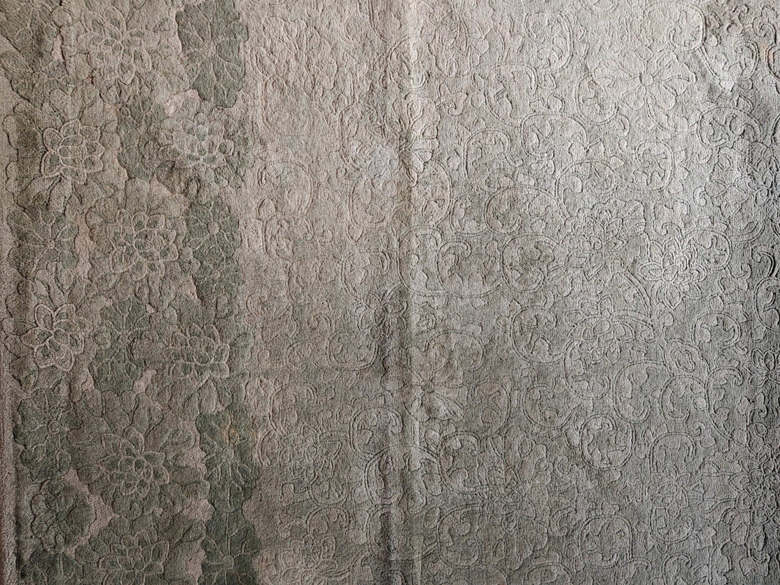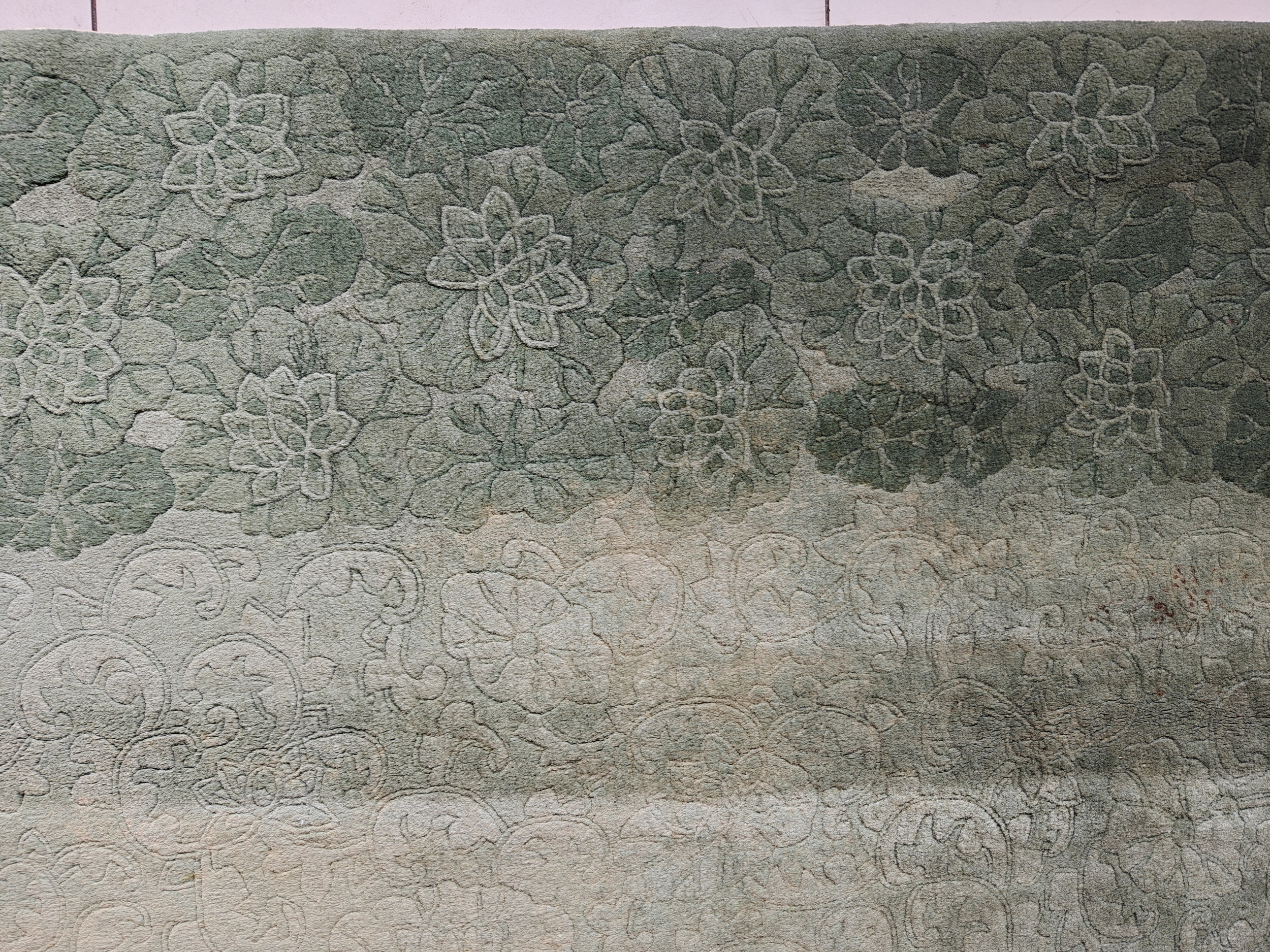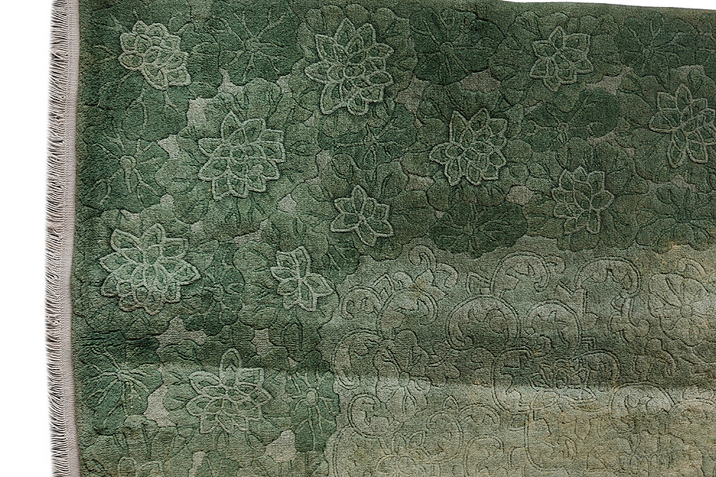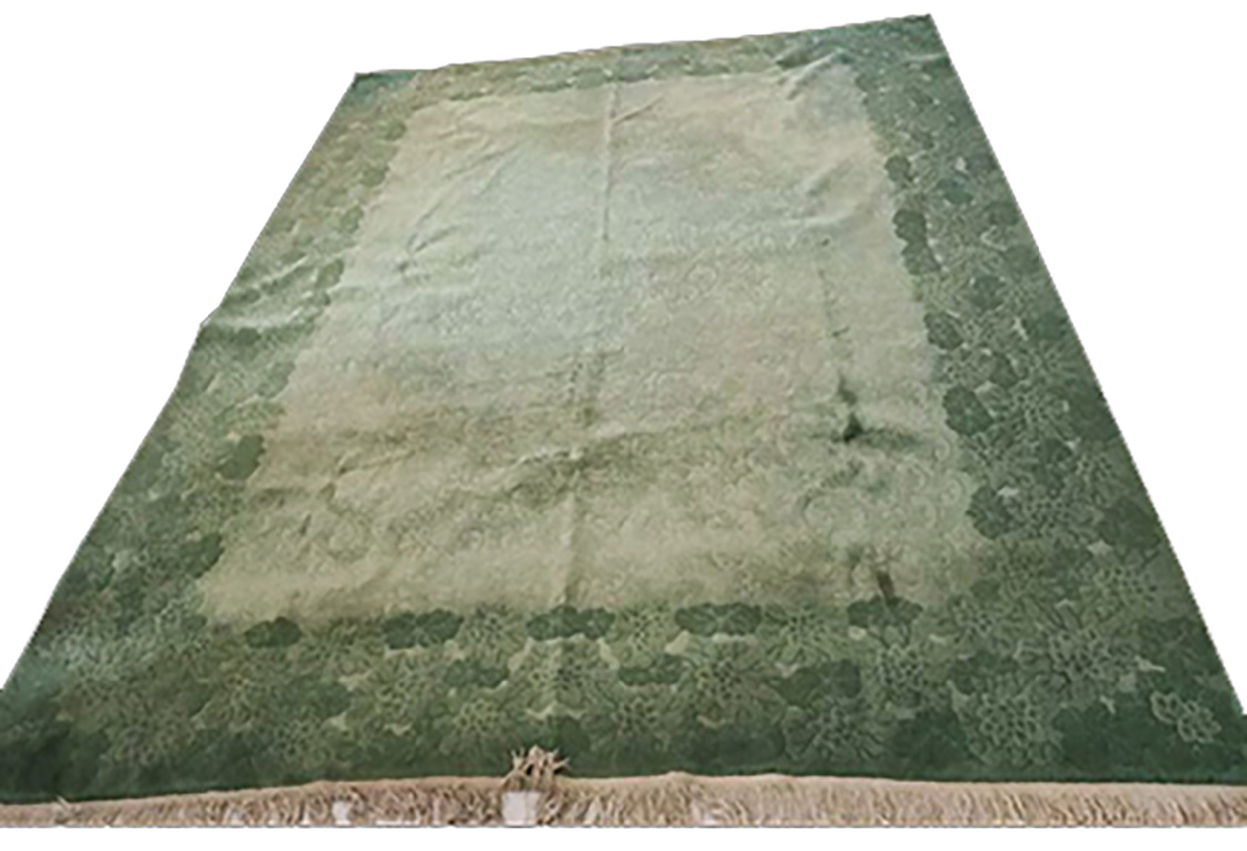 Woven in the 1930s, this carpet perfectly encapsulates the bold, yet restrained aesthetic of the era. The monochromatic jade green field, achieved through subtle shifts in tone and abrash, provides a sophisticated backdrop for the stylized motifs. Such masterful use of color is a hallmark of the finest Chinese Art Deco rugs, distinguishing them from other contemporary styles. This piece confirms the enduring legacy of Chinese rugs during this transitional period.