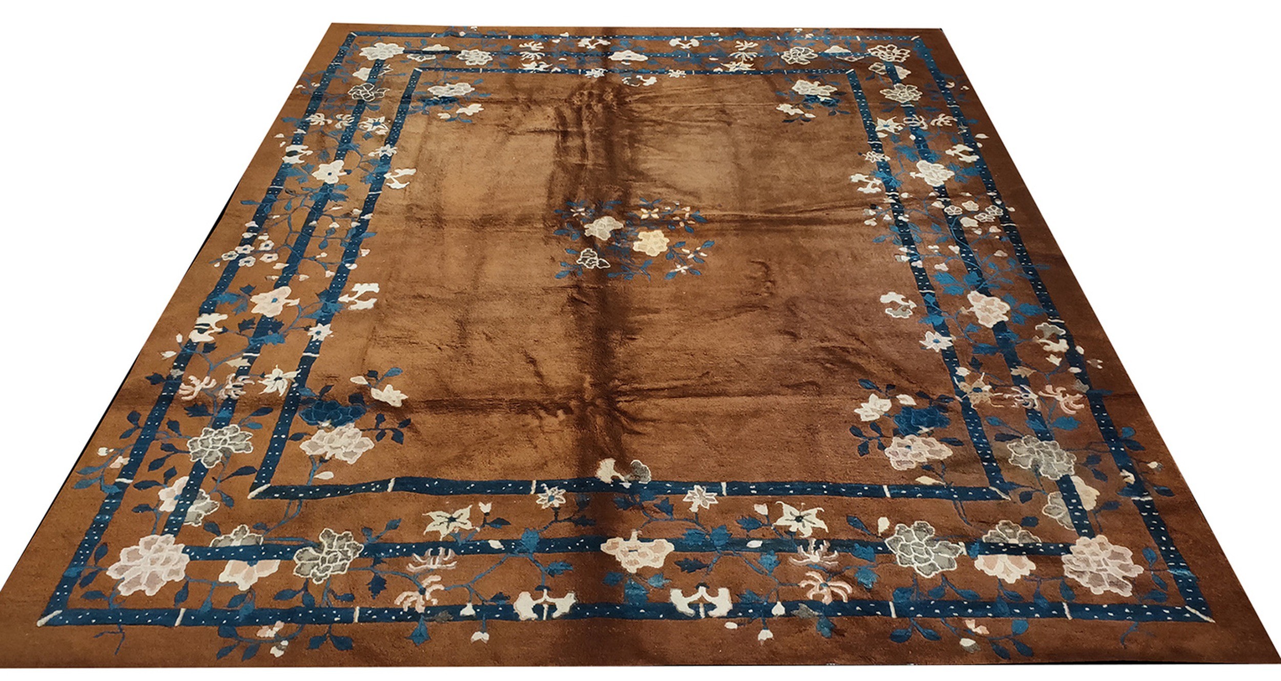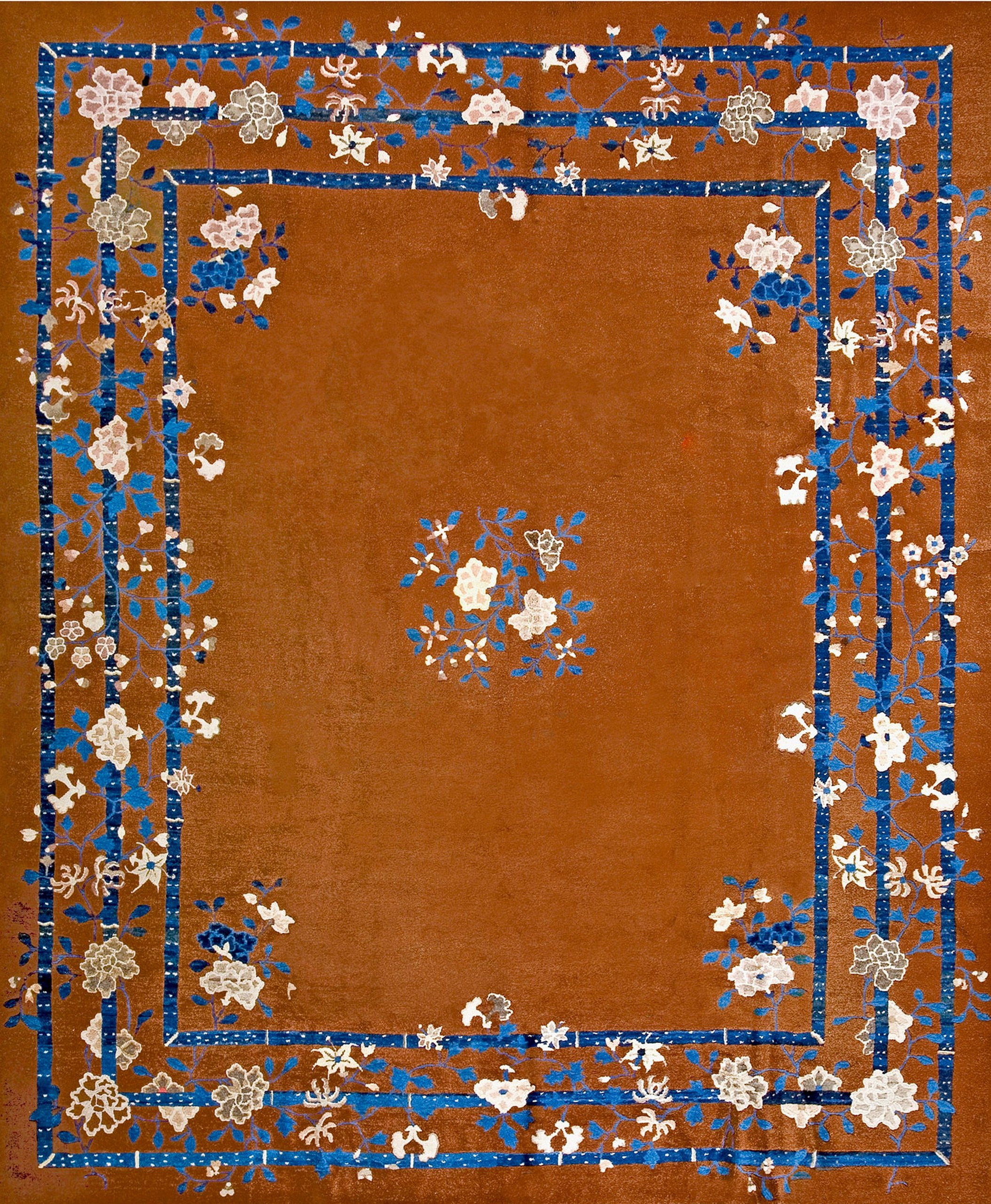 The palette is a masterclass in tonal subtlety. The deep, cocoa-brown ground is accented with a “scholarly” selection of colors—often including soft ivory, sage green, and “Imperial” blue. Because antique Chinese Peking area rugs utilized high-quality, long-staple wool, the brown field possesses a natural luminosity and a beautiful abrash (tonal variation), giving the surface a shimmering, watercolor-like depth that shifts with the light.