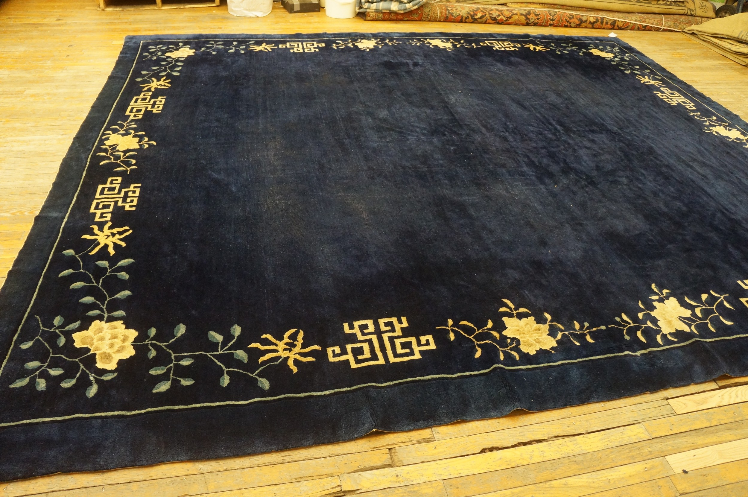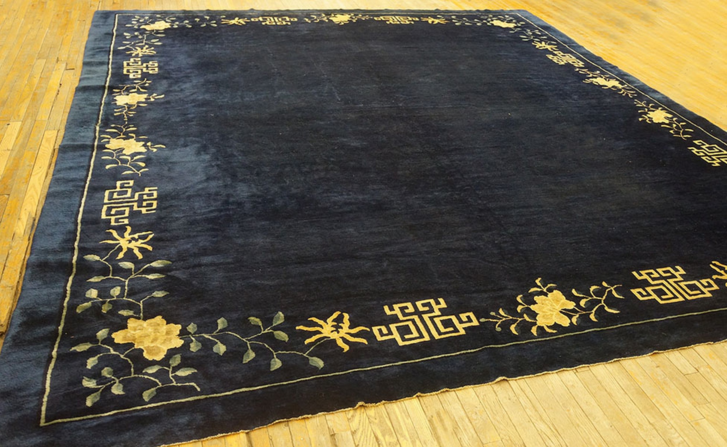 Antique Chinese – Peking Chinese Allover Floral Blue 1893 Rug, Circa Date: 1893. This exceptional example of late Qing Dynasty weaving presents the refined aesthetic typical of Peking production. Its deep, saturated indigo field provides a dramatic contrast to the delicate border, showcasing why antique rugs from this period are highly sought after by discerning collectors.