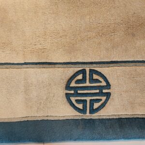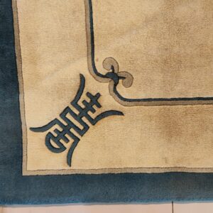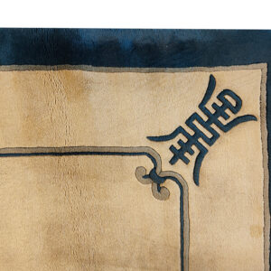Unlike earlier, densely patterned Chinese carpets, this design embraces negative space and simplified, symbolic motifs. The stylized Shou characters, representing longevity and good fortune, are placed strategically at the corners and midpoints, contributing to the overall refined, geometric rugs structure that defines the Art Deco influence.