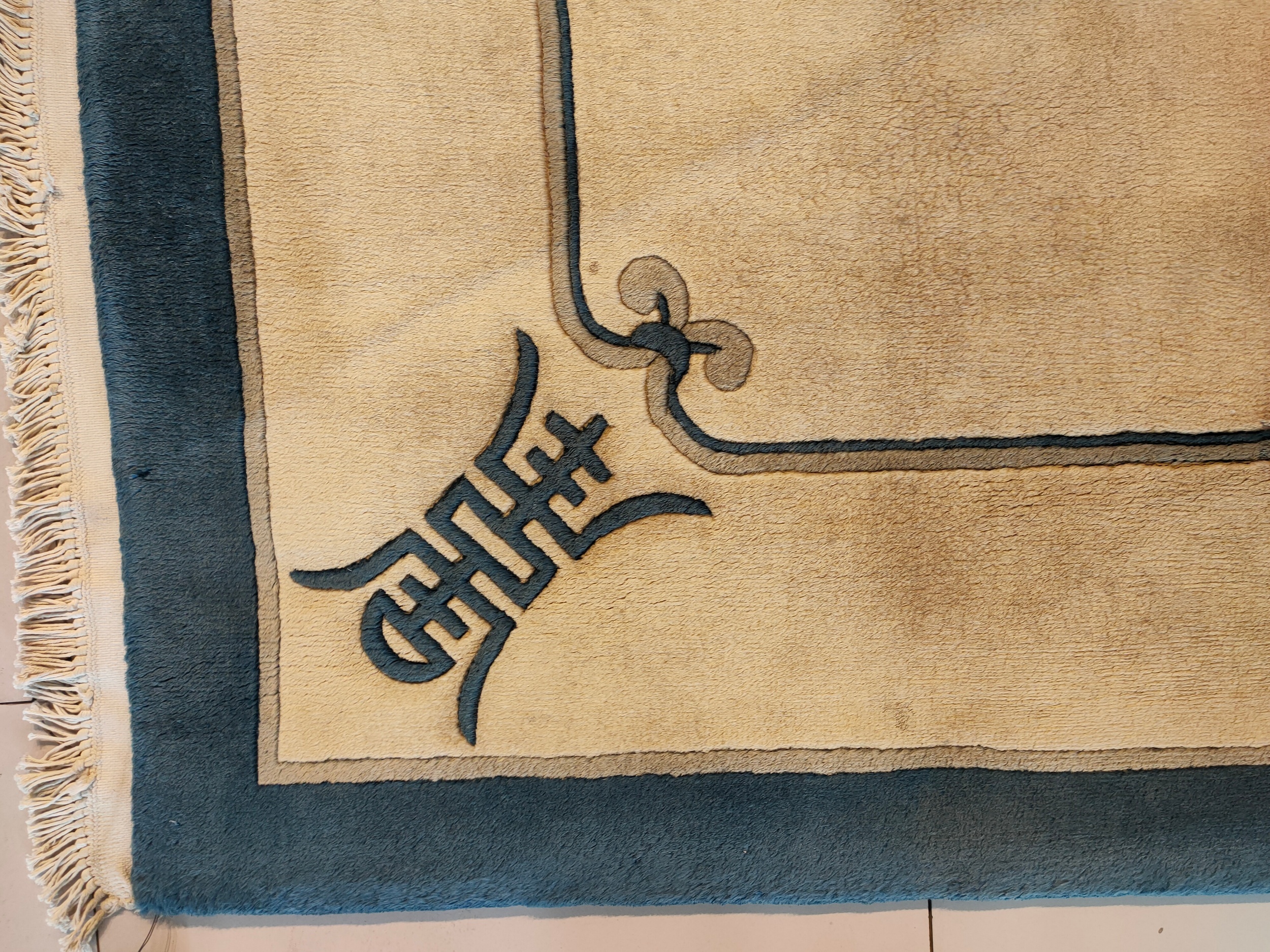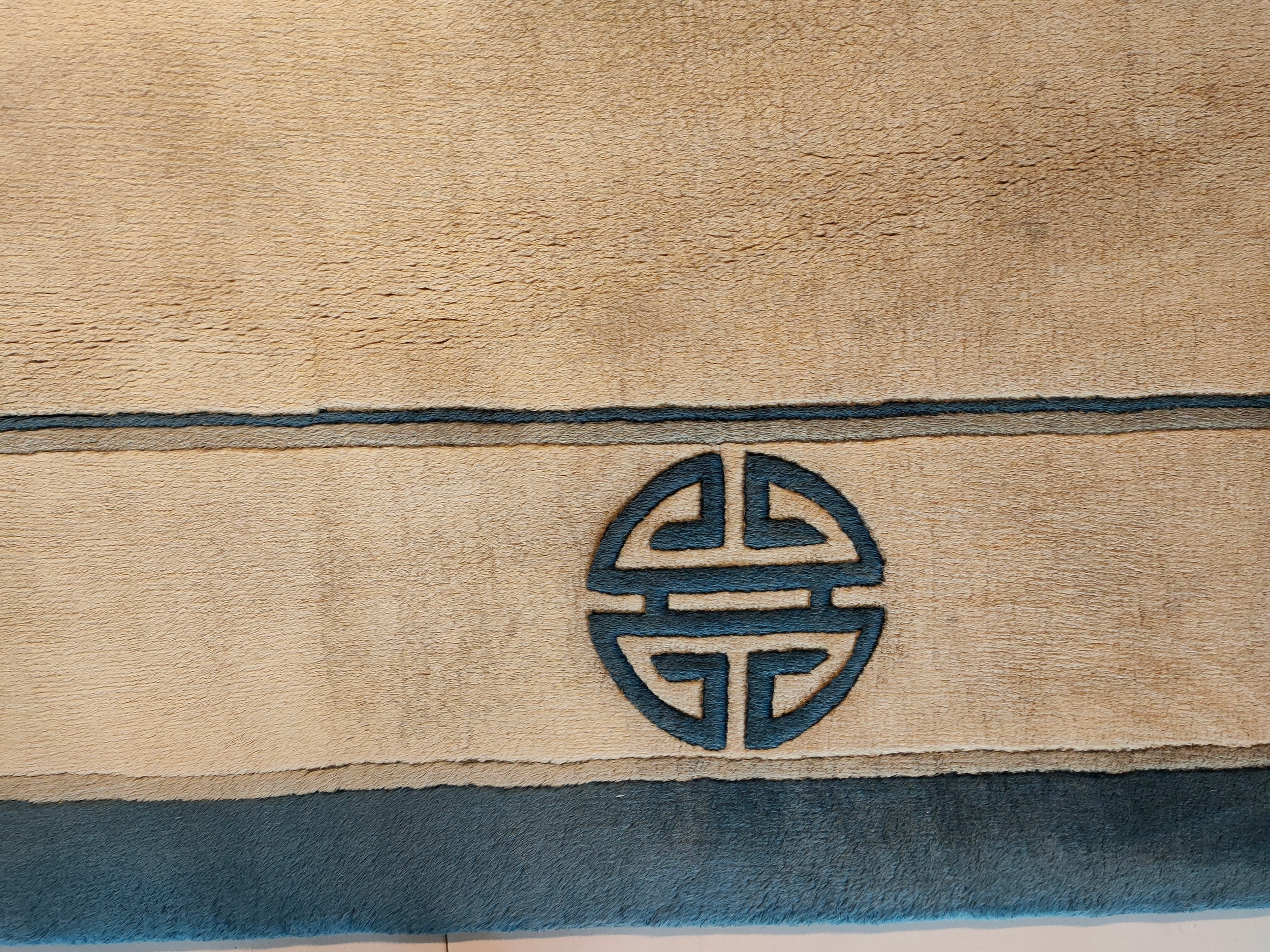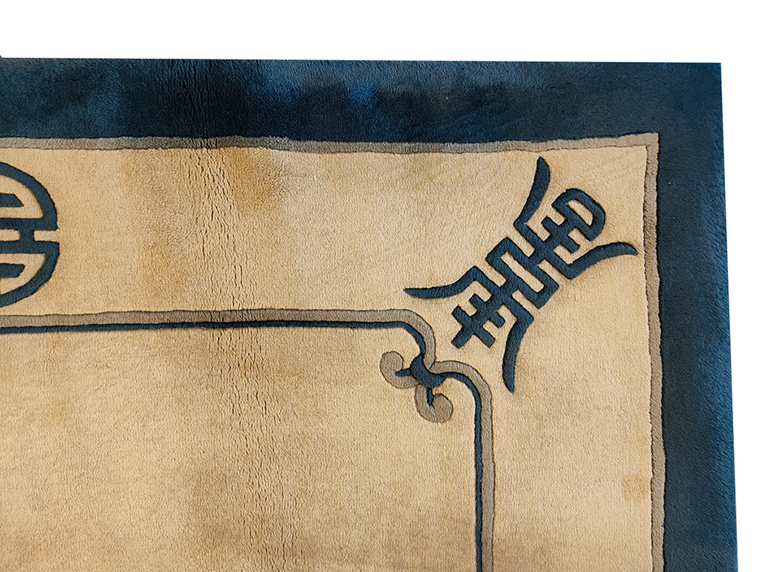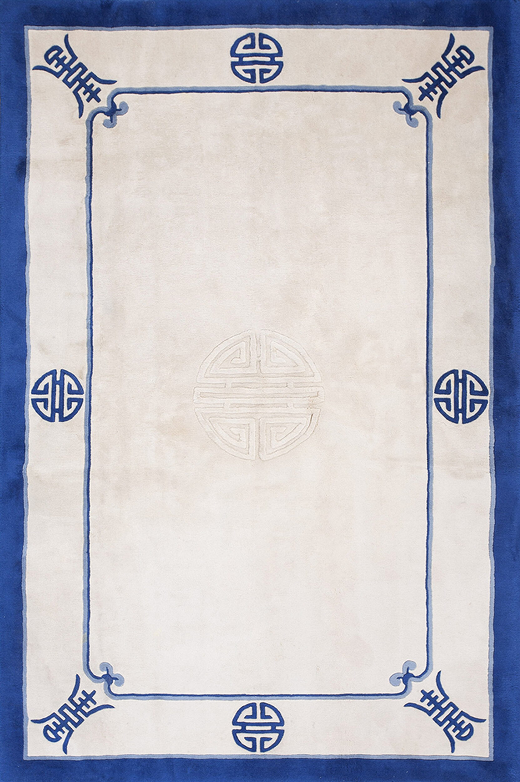 Unlike earlier, densely patterned Chinese carpets, this design embraces negative space and simplified, symbolic motifs. The stylized Shou characters, representing longevity and good fortune, are placed strategically at the corners and midpoints, contributing to the overall refined, geometric rugs structure that defines the Art Deco influence.