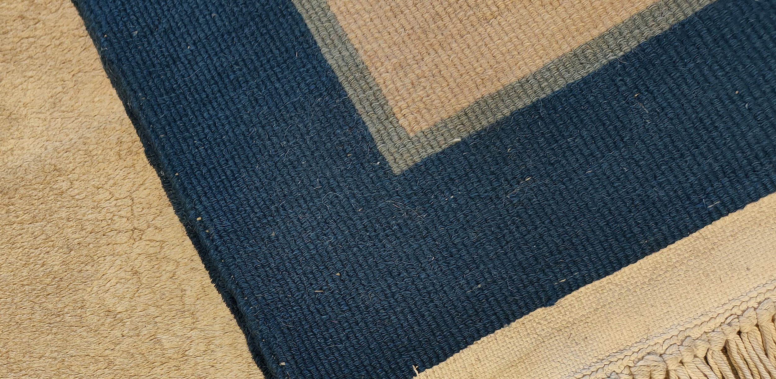 The expansive, luminous field is rendered in a deep, plush pile of ivory beige cream white color rugs, providing a perfect neutral canvas. This subtle, monochromatic center allows the saturated, cobalt blue border to frame the composition with dramatic clarity, a hallmark of 1970s luxury decor that sought to pair traditional quality with contemporary color palettes.