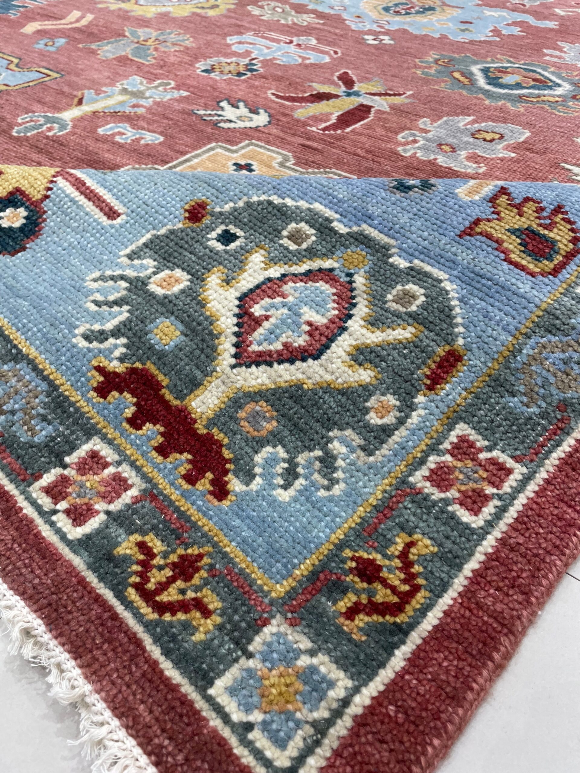 The field is dominated by a rich, variegated rust-red color, providing a warm, earthy foundation. This deep hue is dramatically offset by a broad, striking border rendered in a cool, slate-sky blue, creating a vibrant yet balanced visual tension that defines the rug’s character.